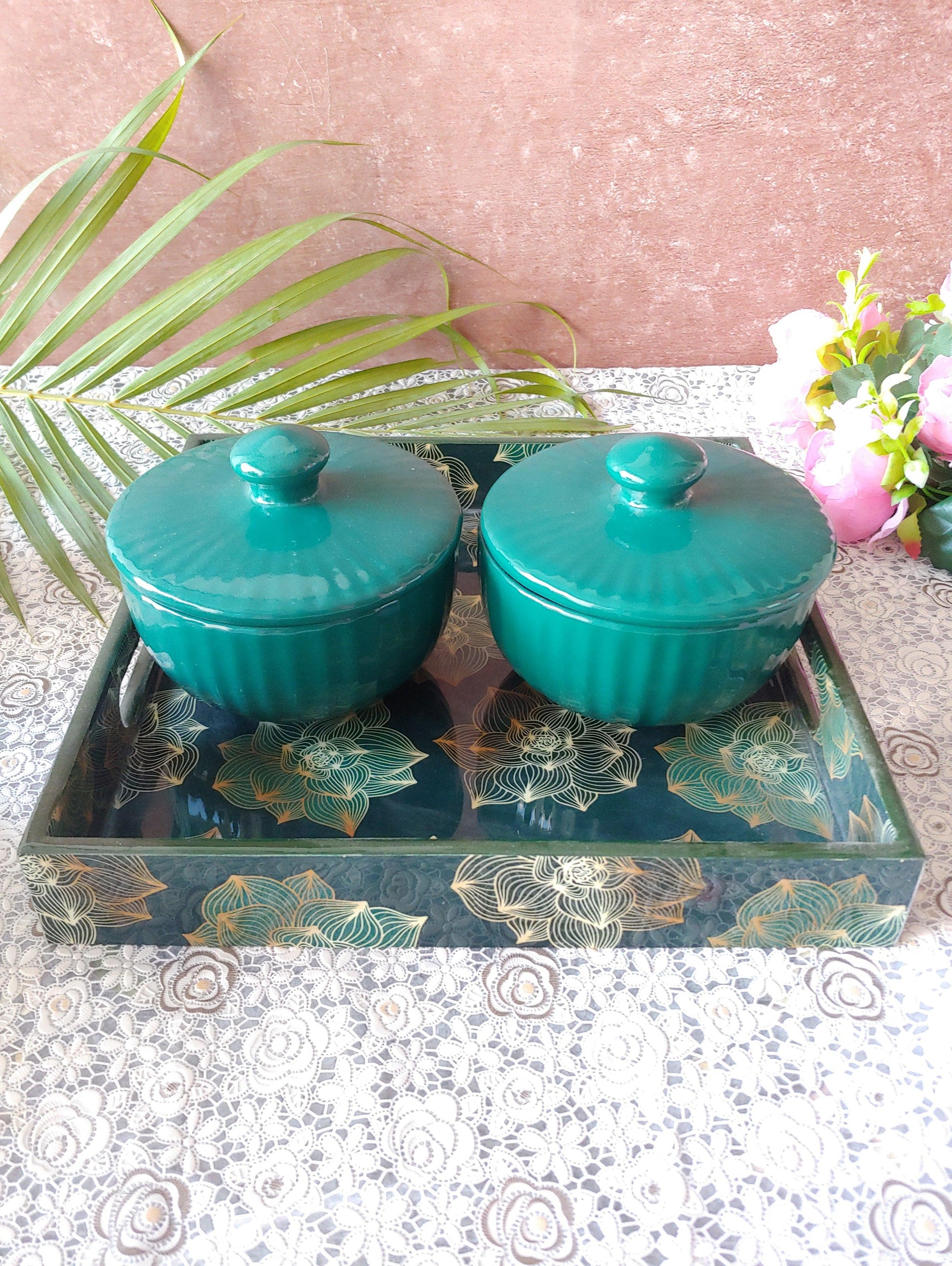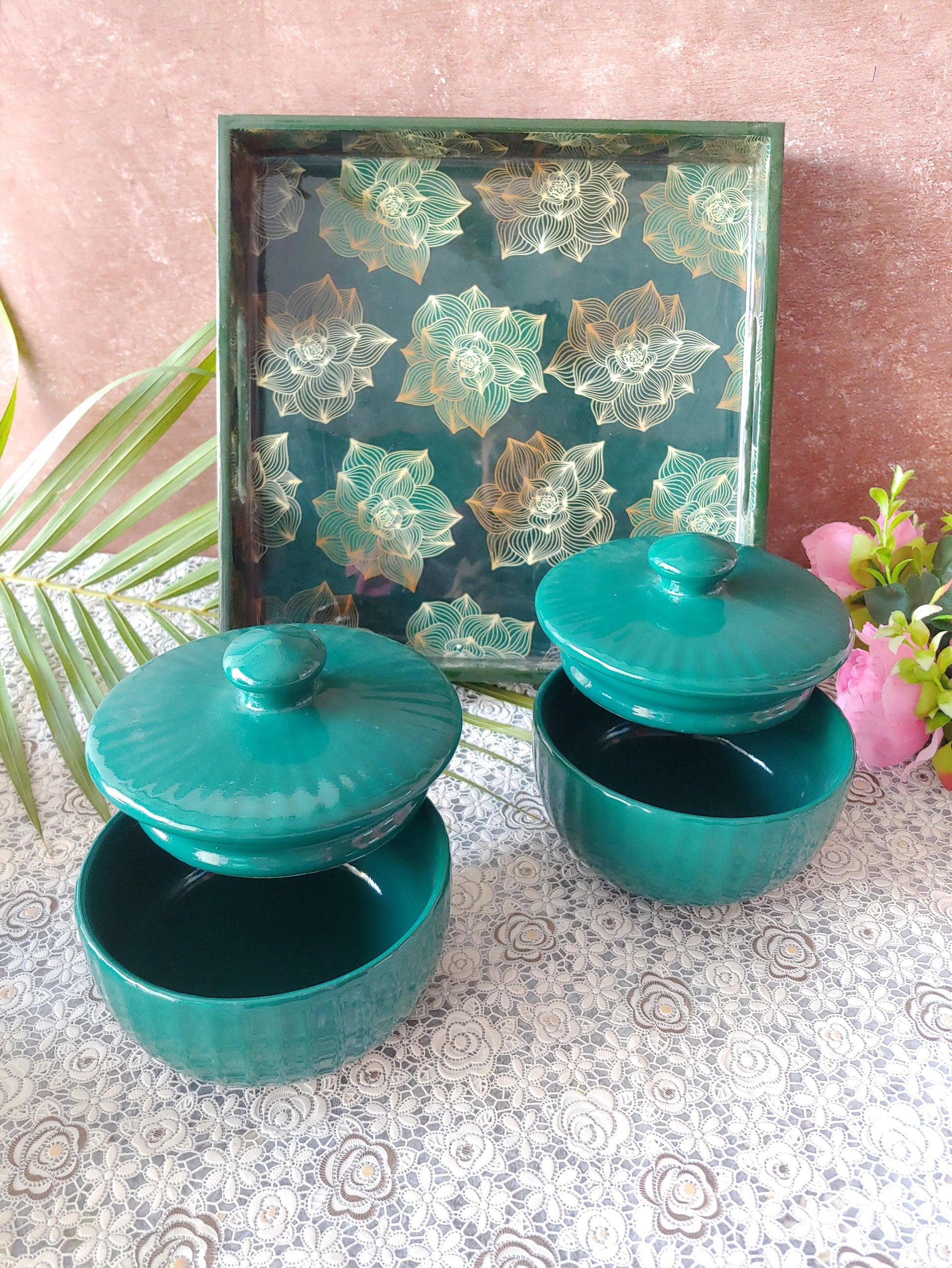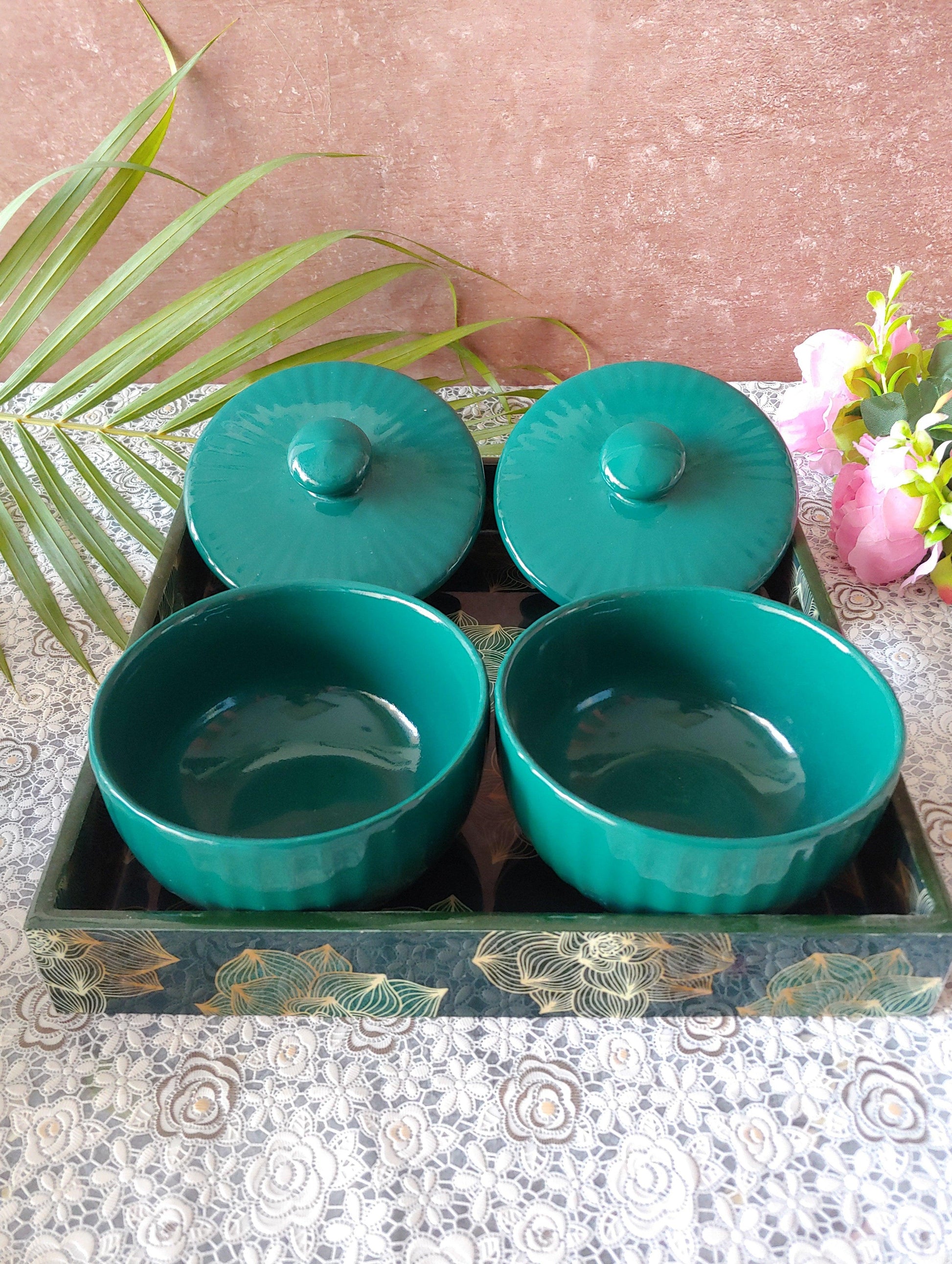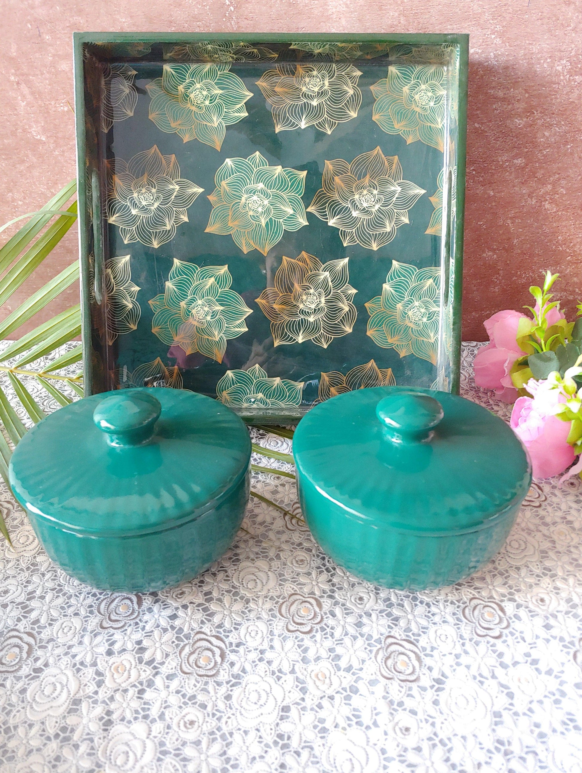 Green ceramic Nesting Bowls with Lid Tray