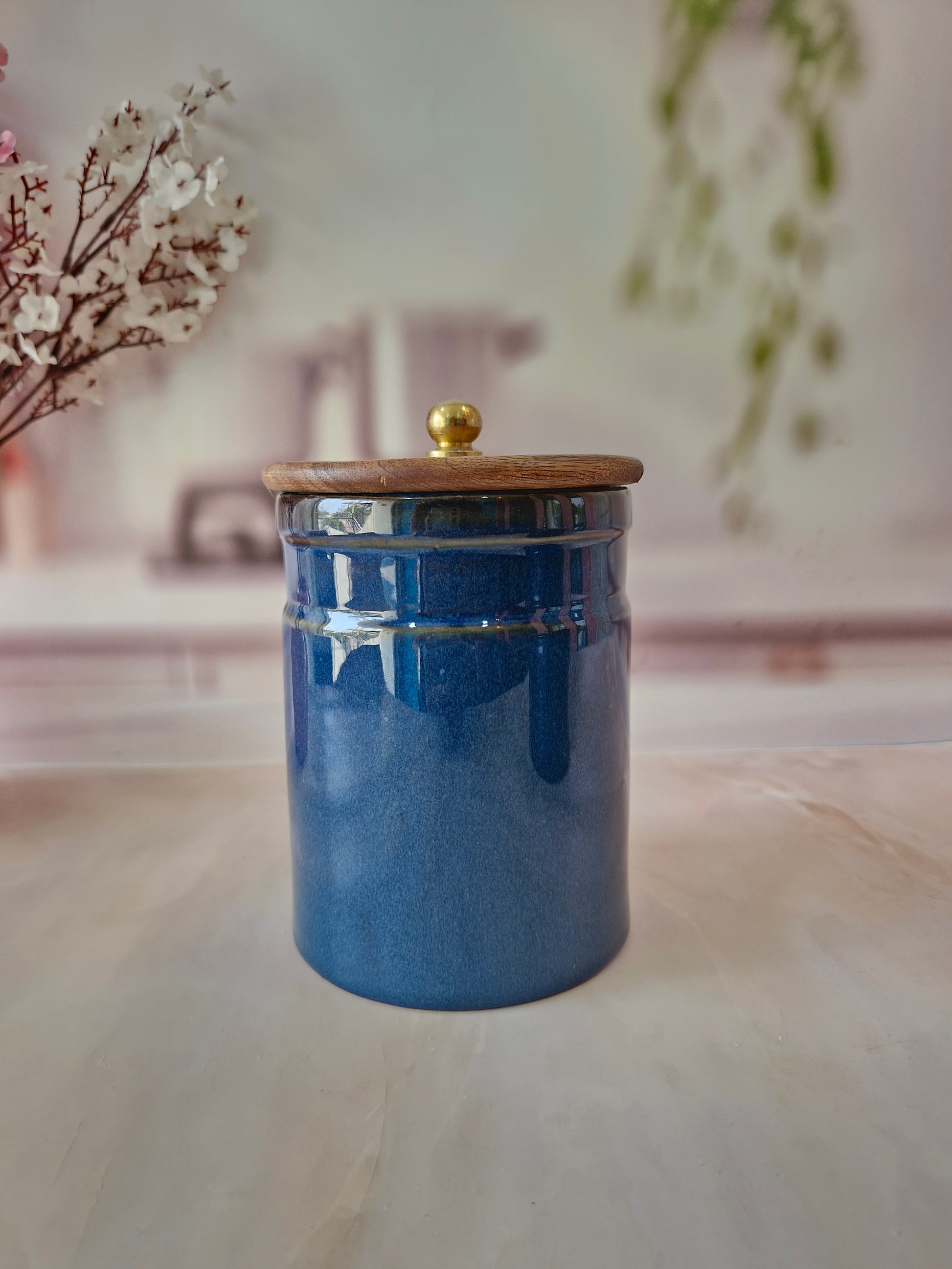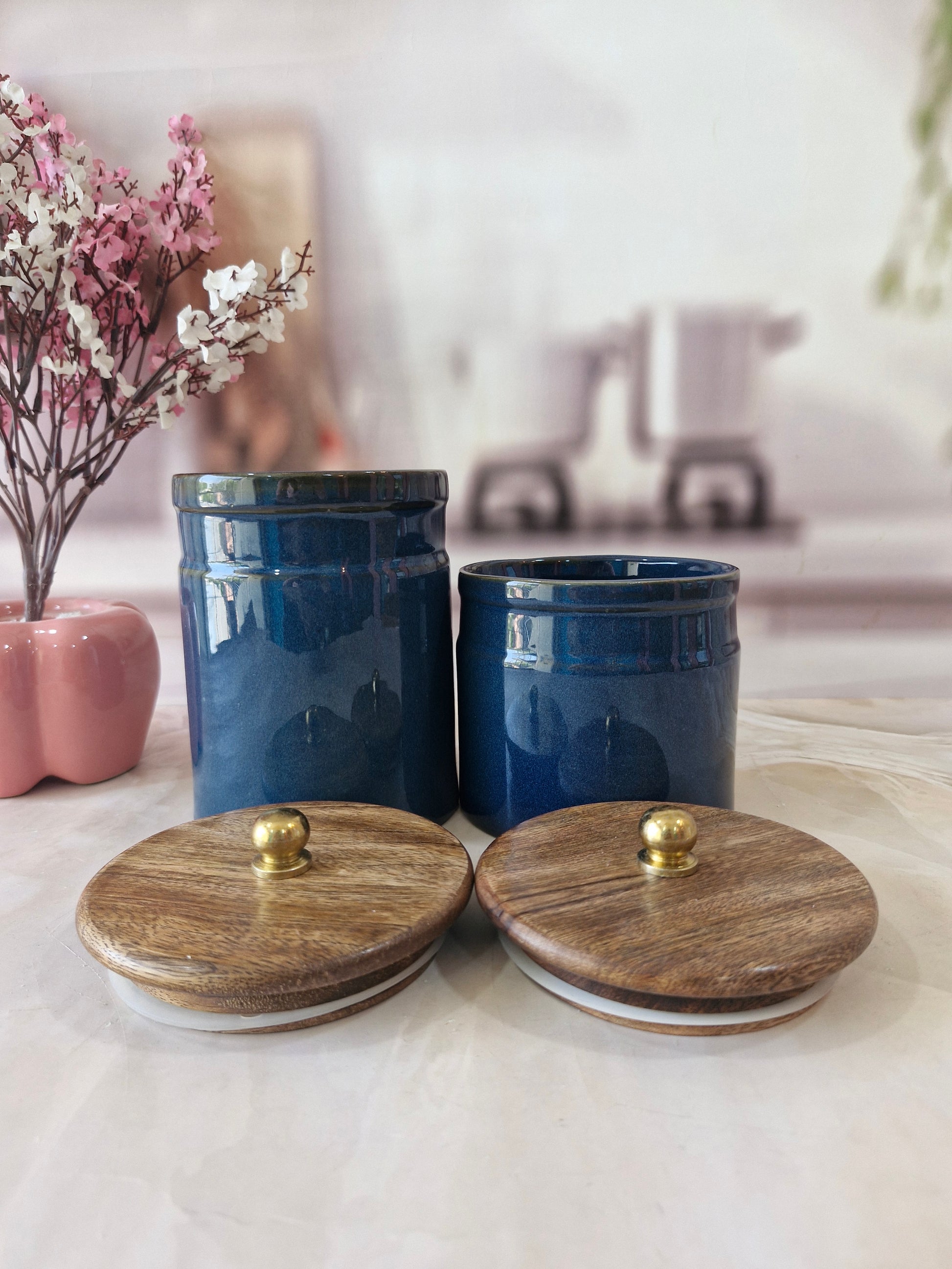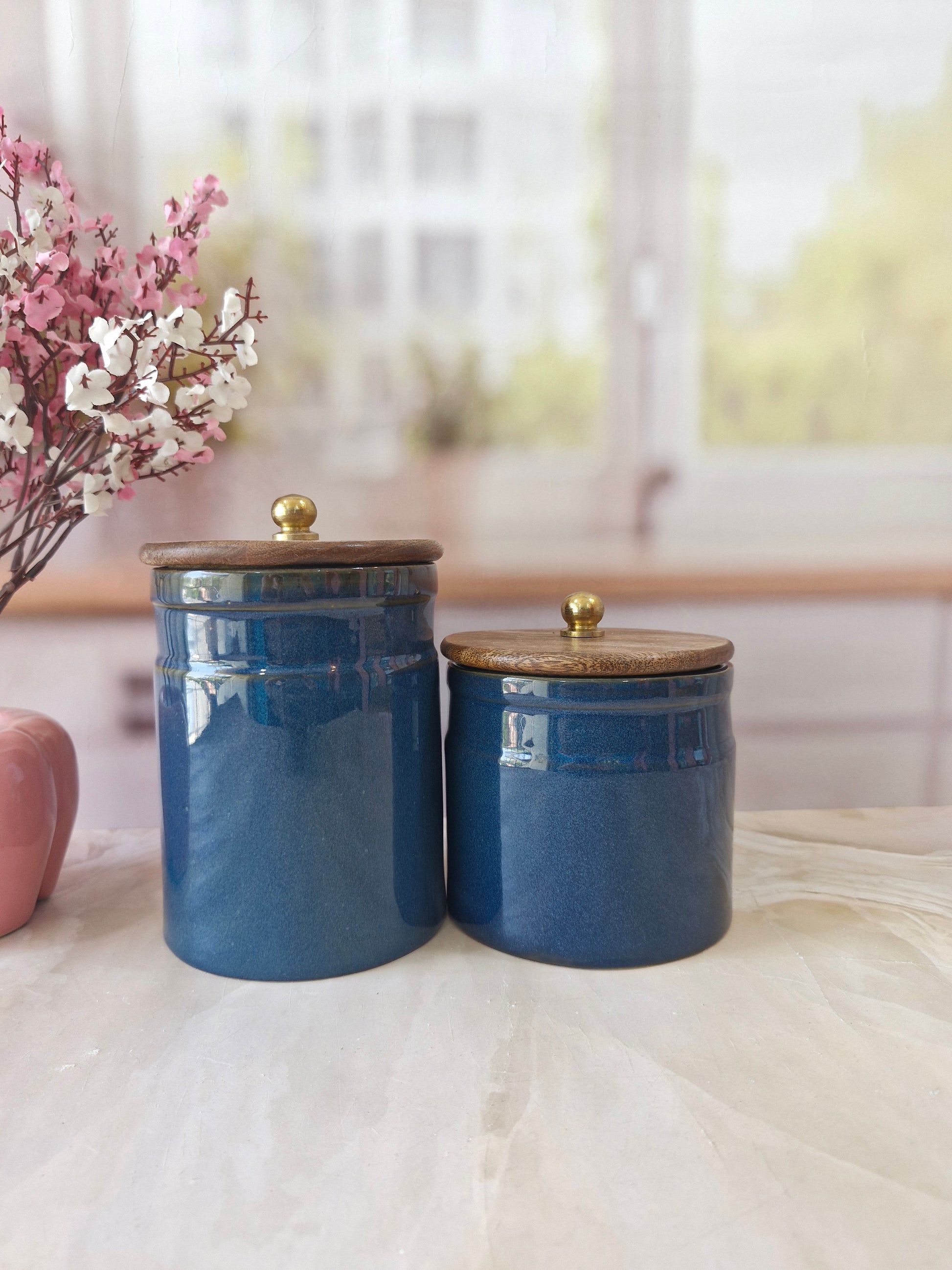 Deep Sea Blue Artisan Ceramic Canisters with Wood Lids 1kg and (1/2 kg) airtight jar Spices & Cookies