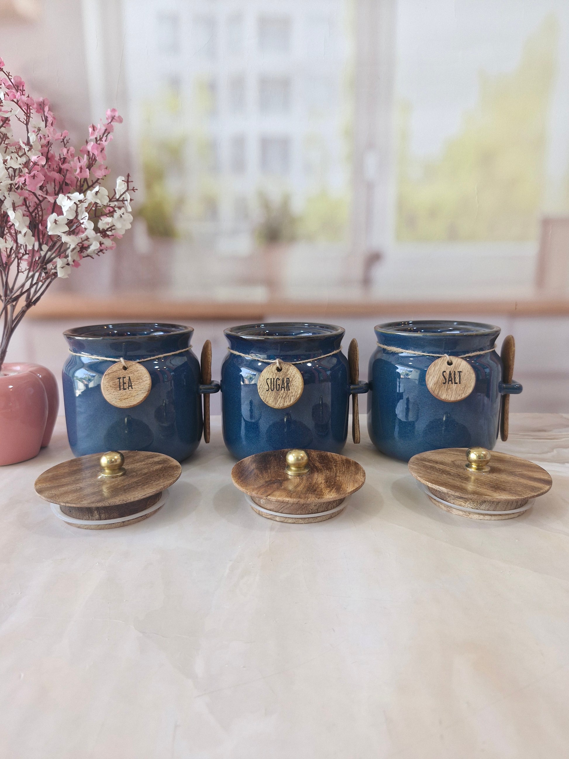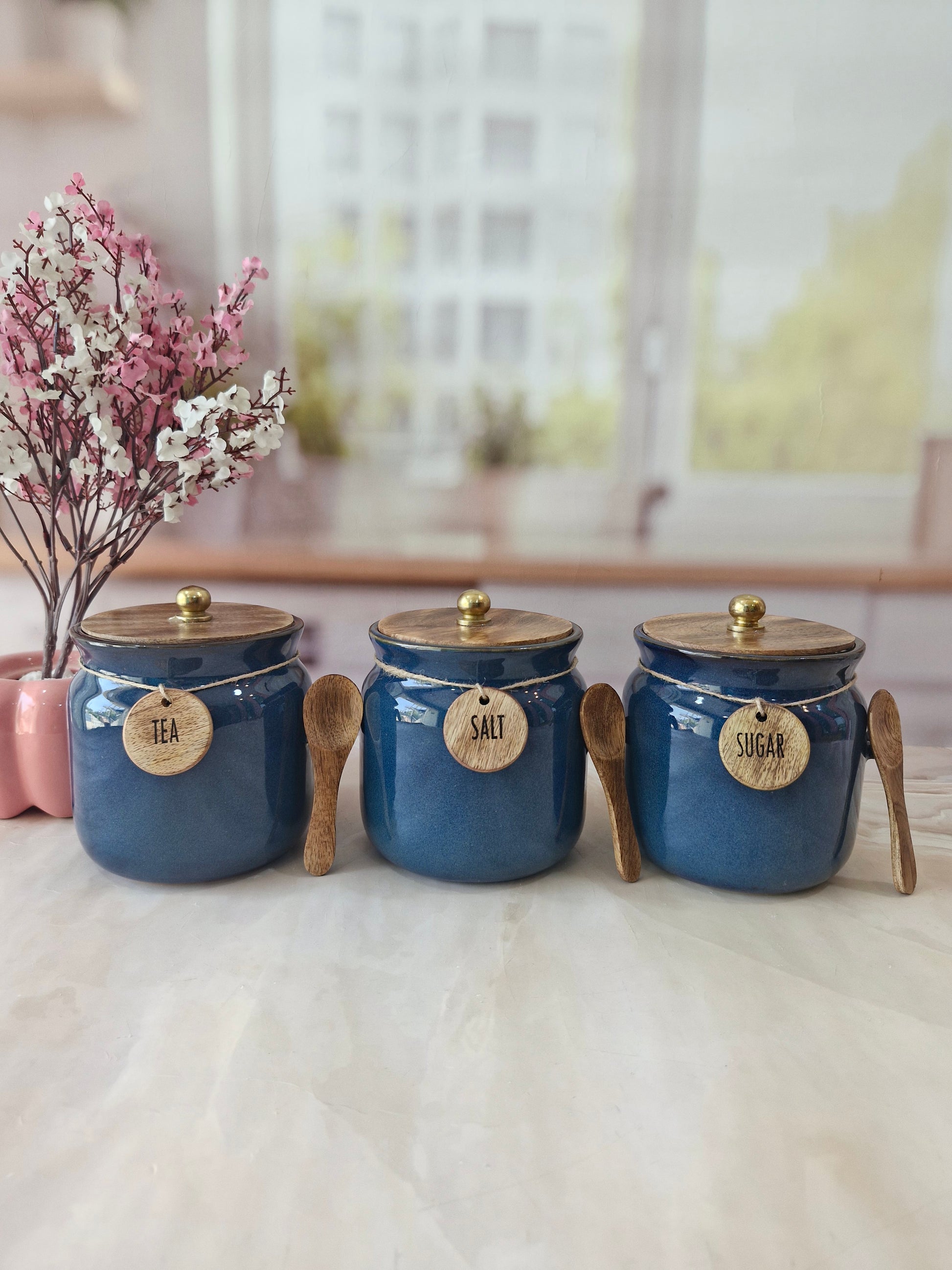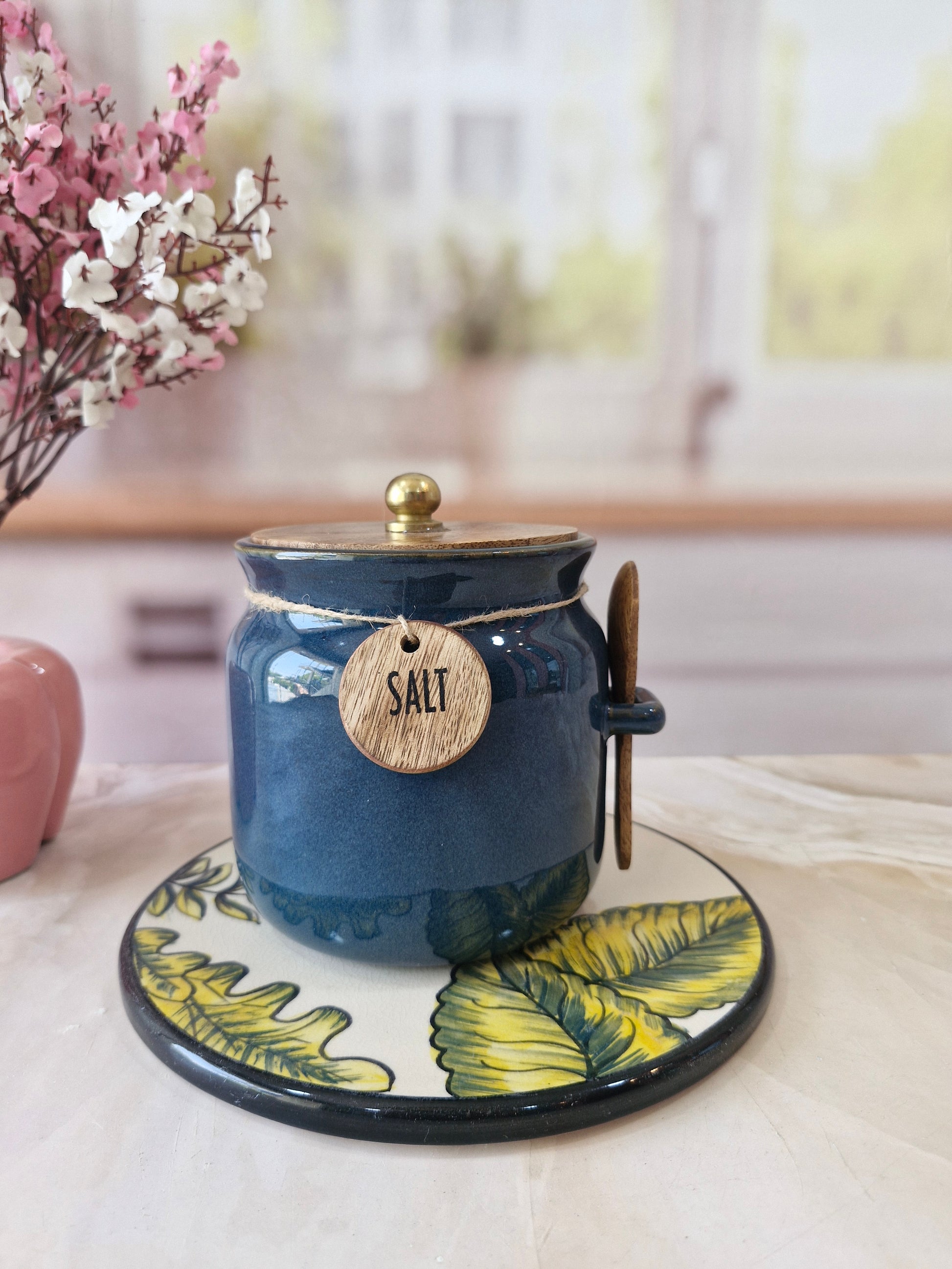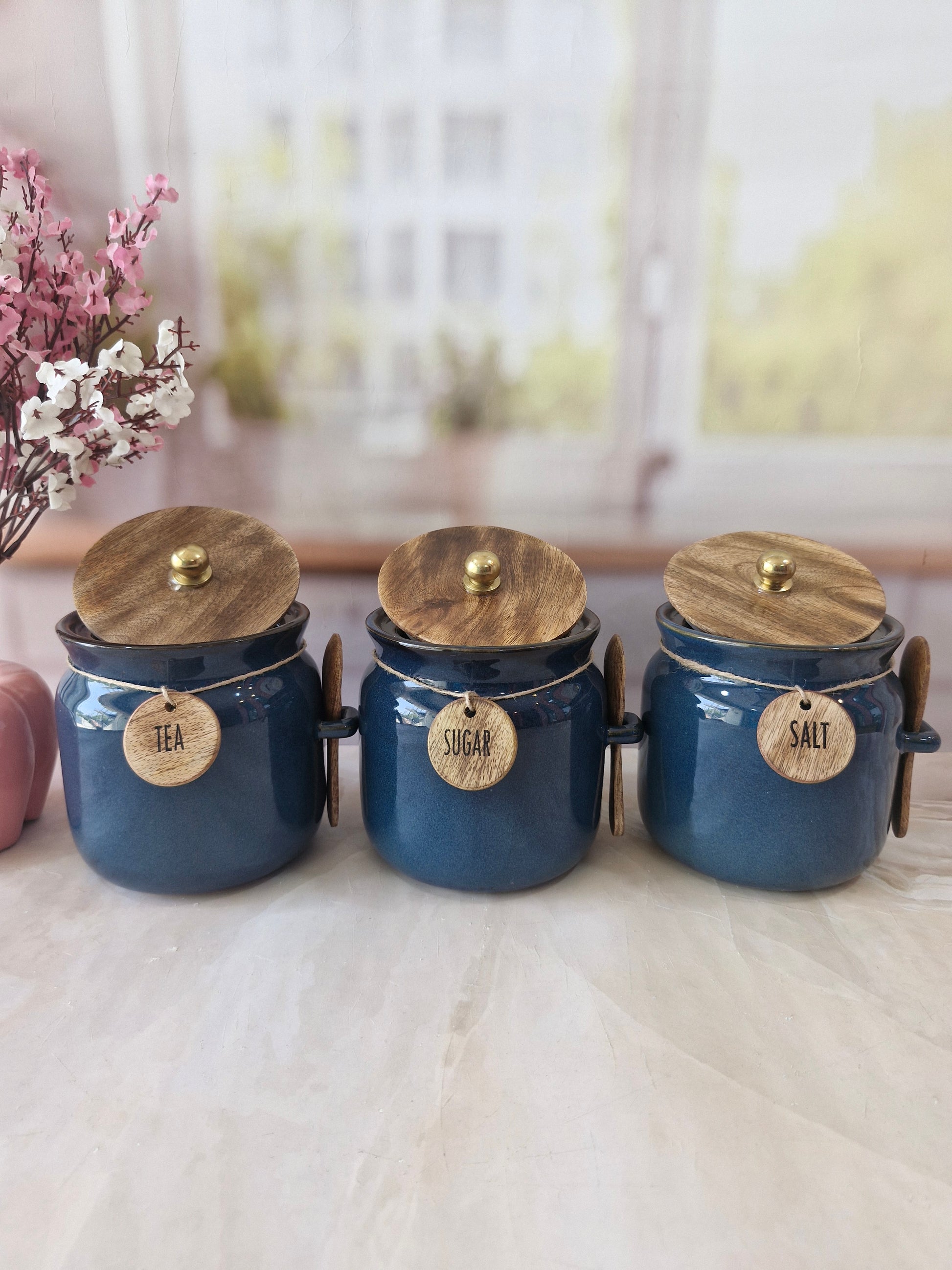 Blue Diamond Ceramic Airtight Matka Tea Sugar Salt Canister with Wooden Lid & spoon 1/2 kg