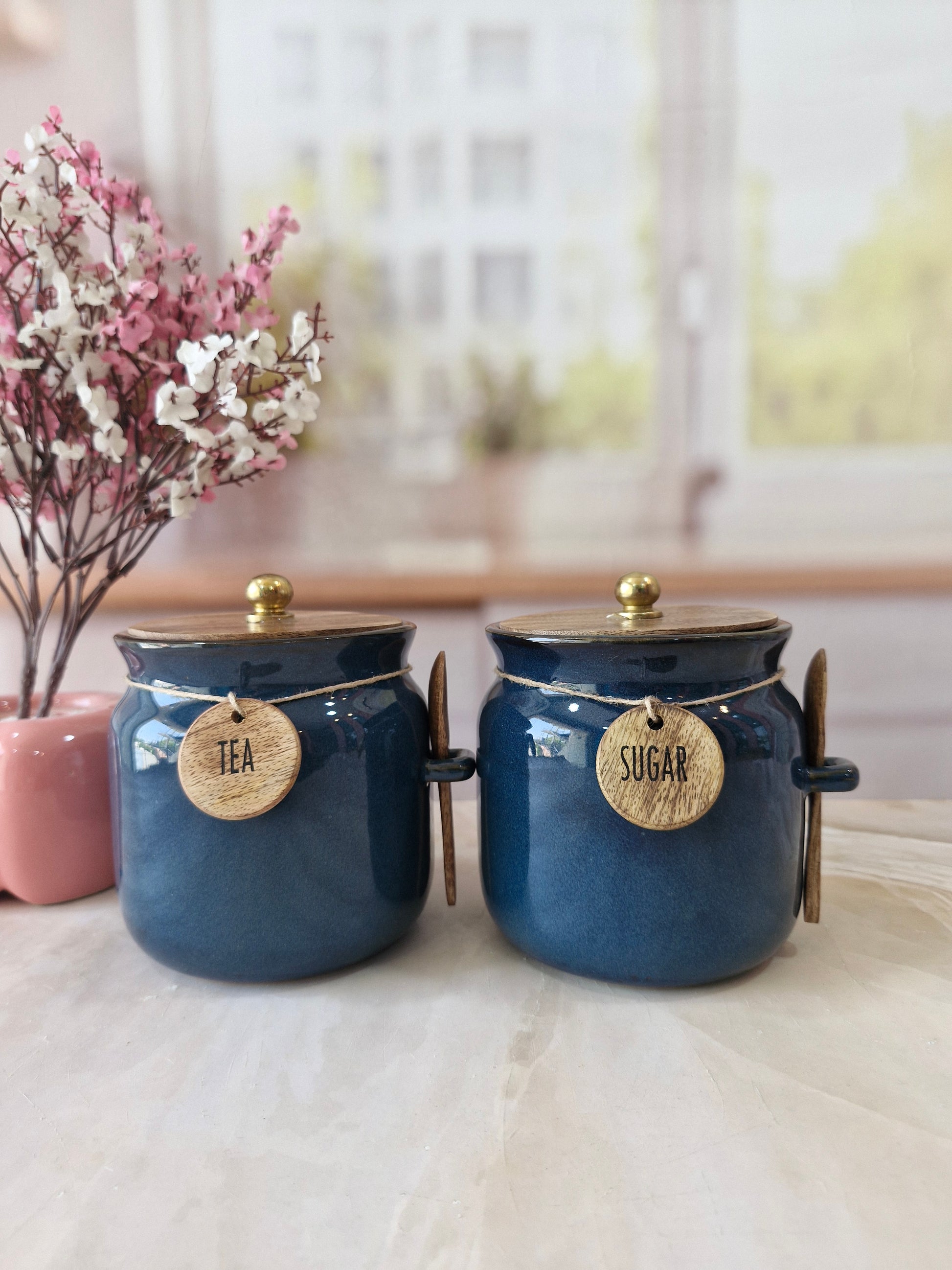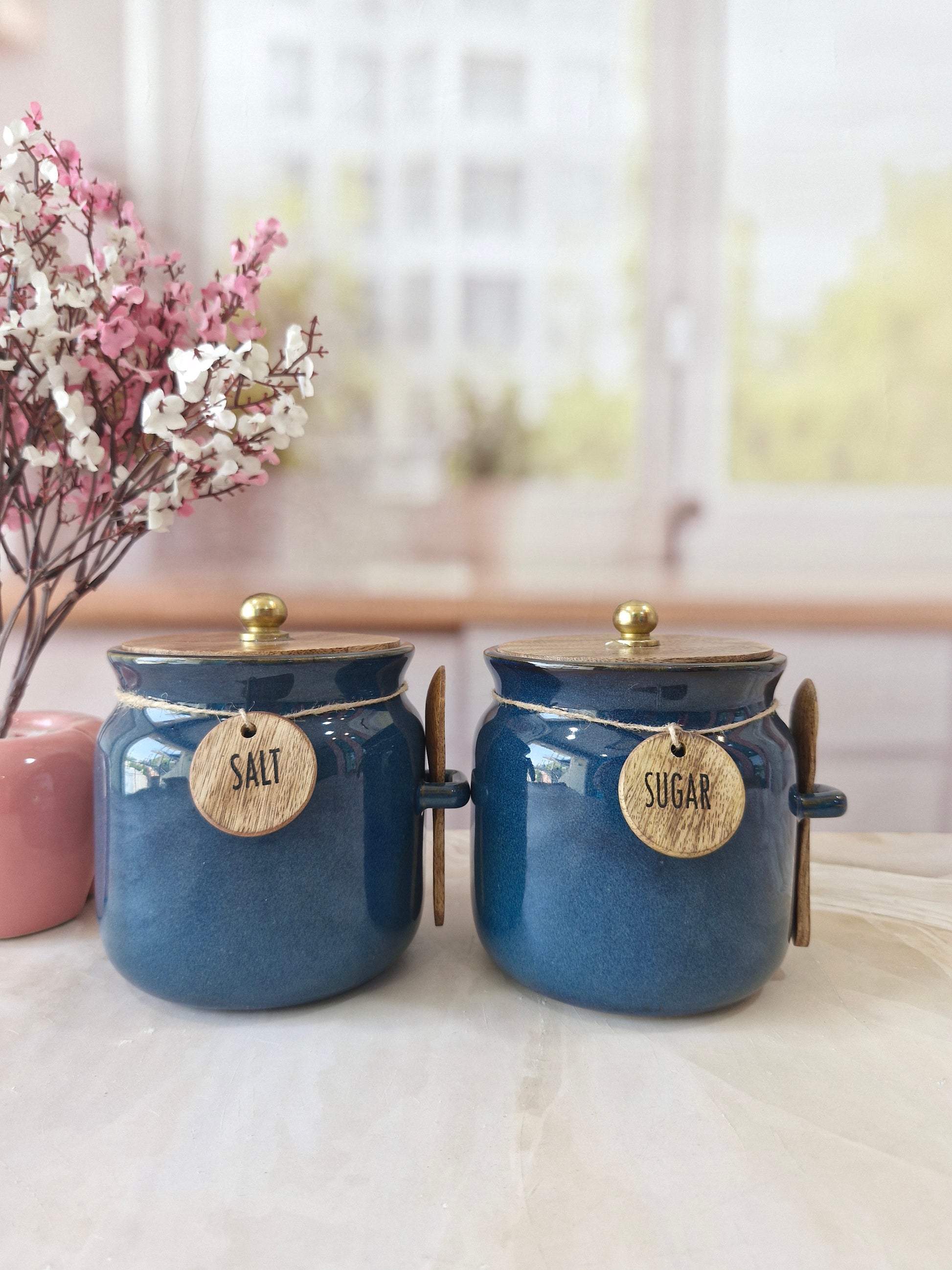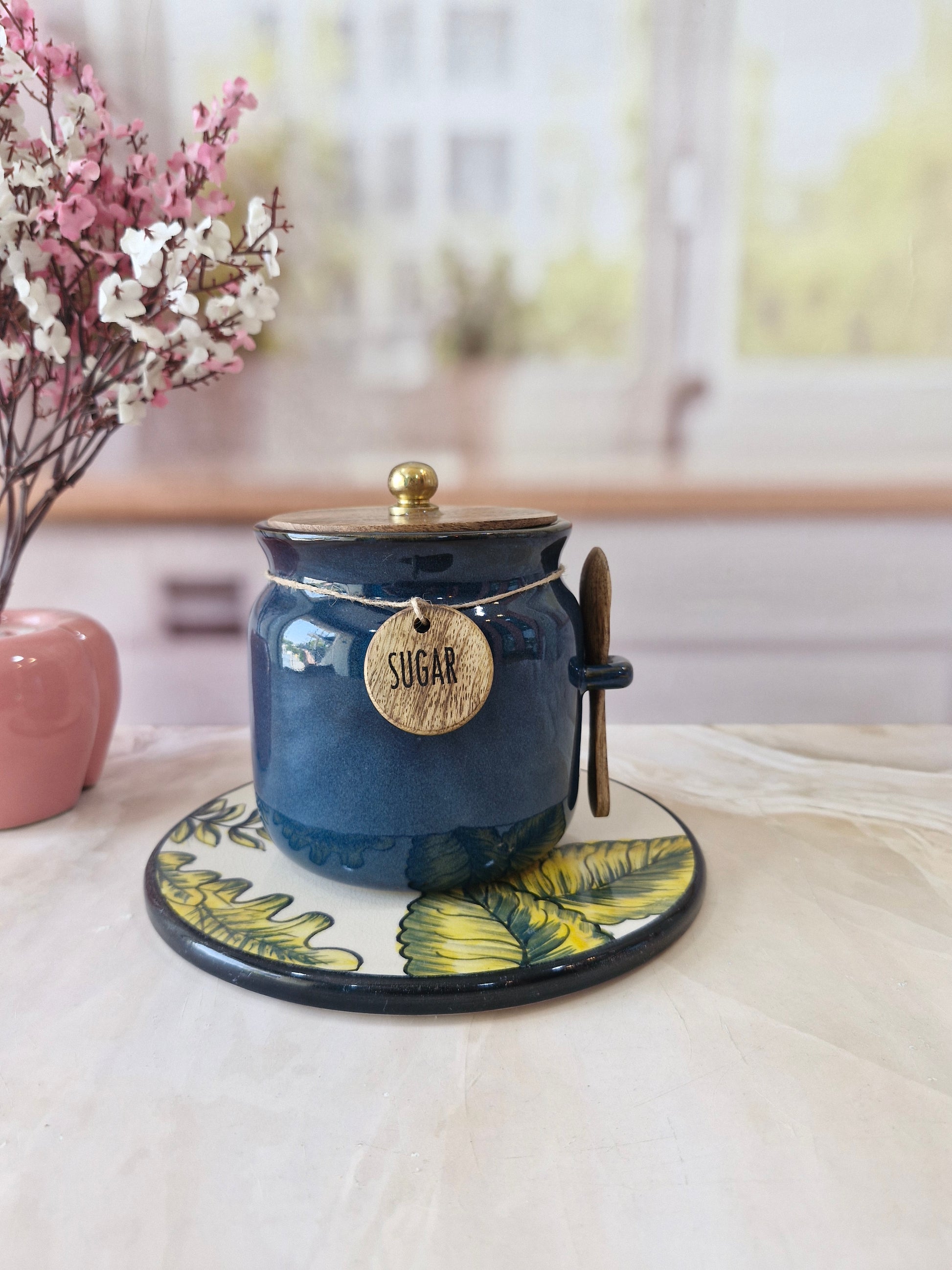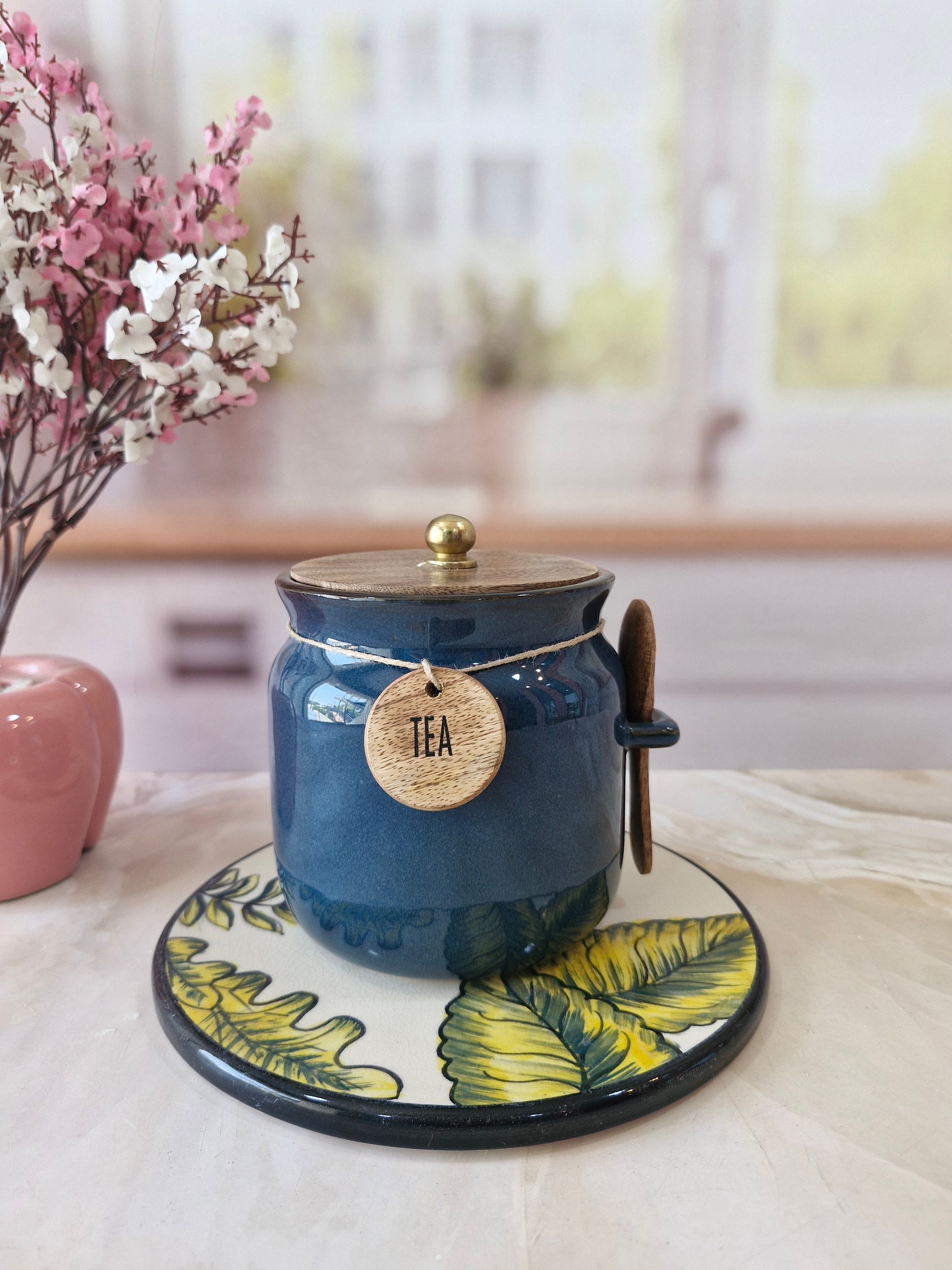 Blue Diamond Ceramic Airtight Matka Tea Sugar Salt Canister with Wooden Lid & spoon 1/2 kg
