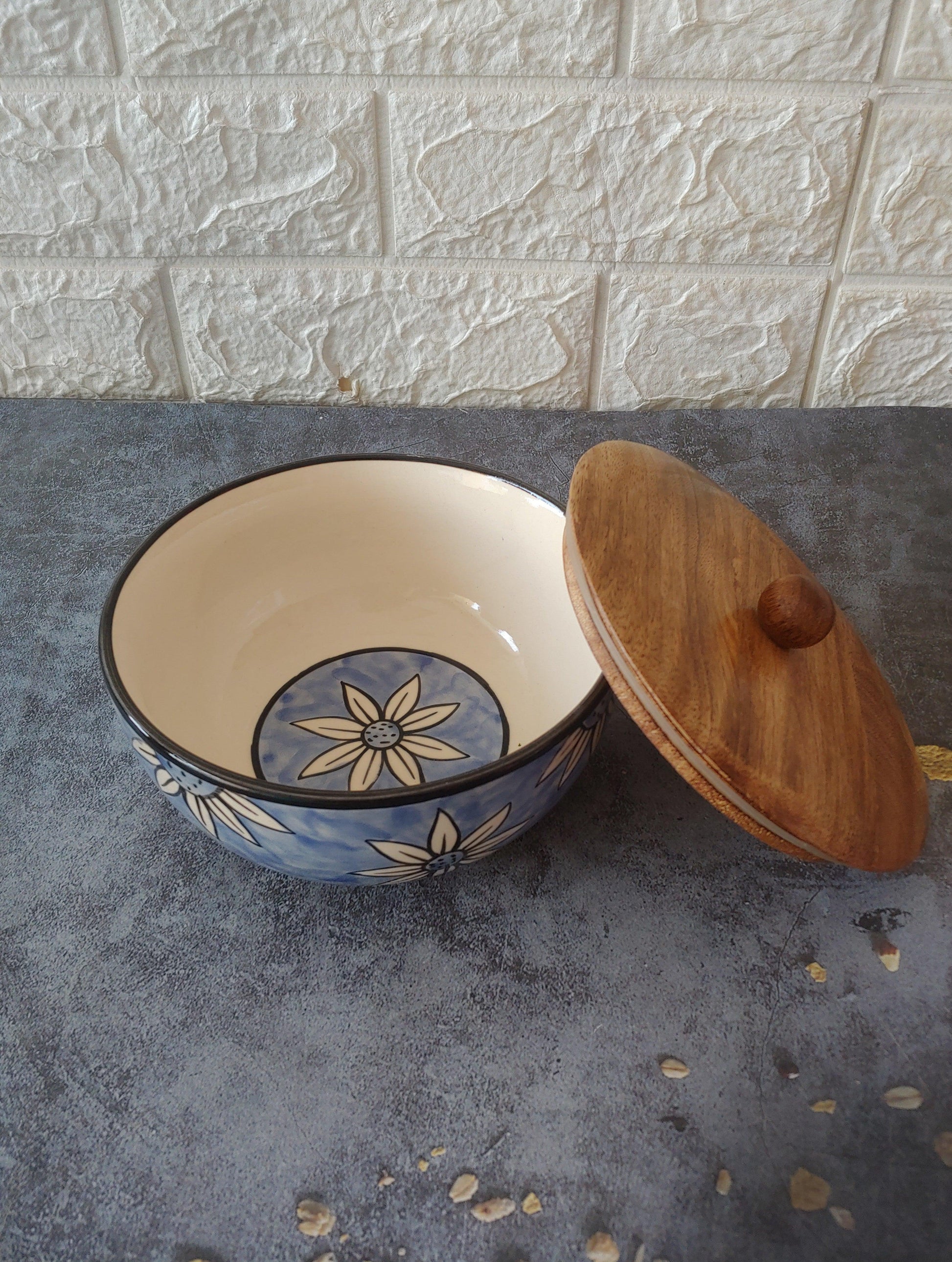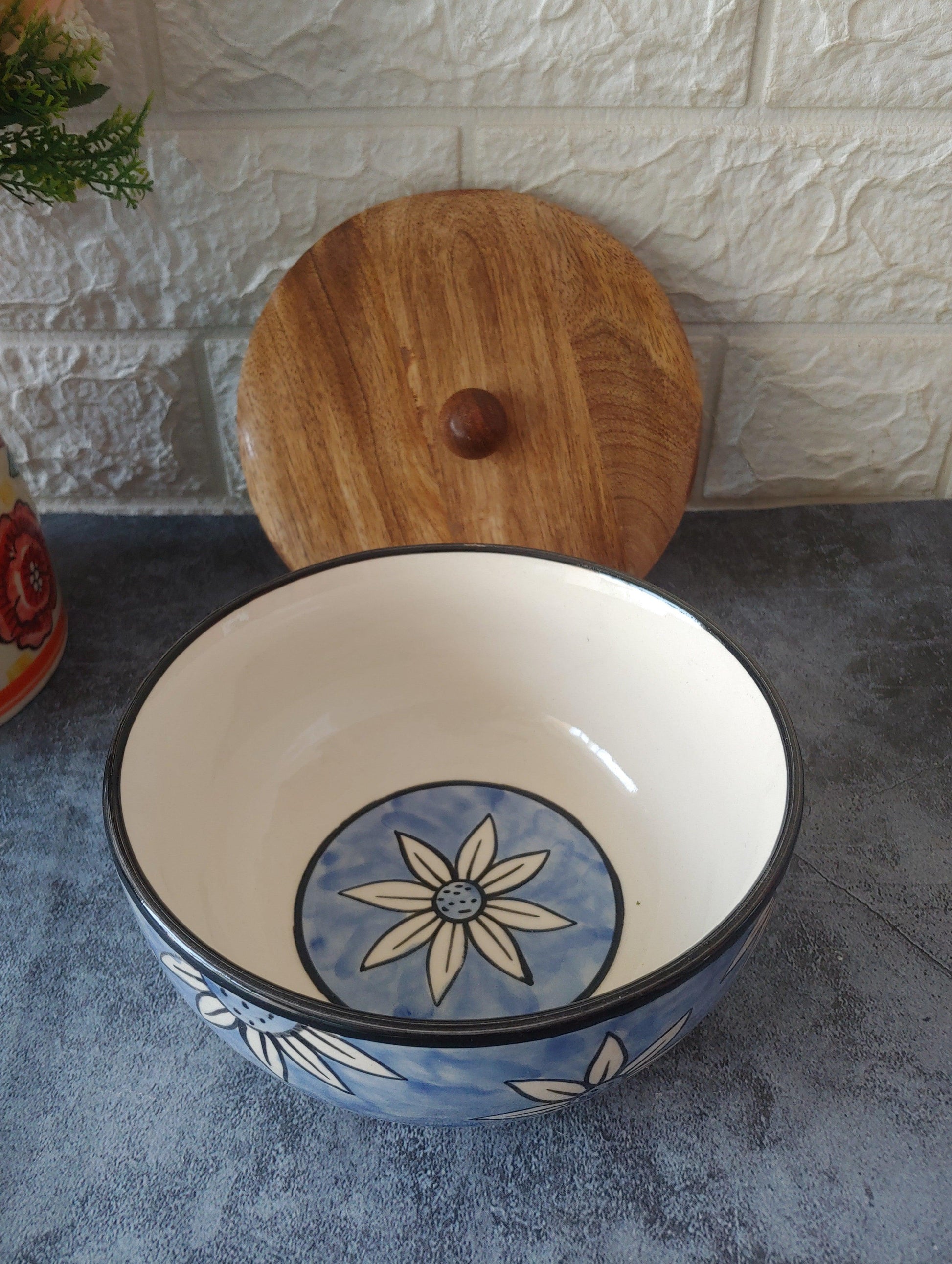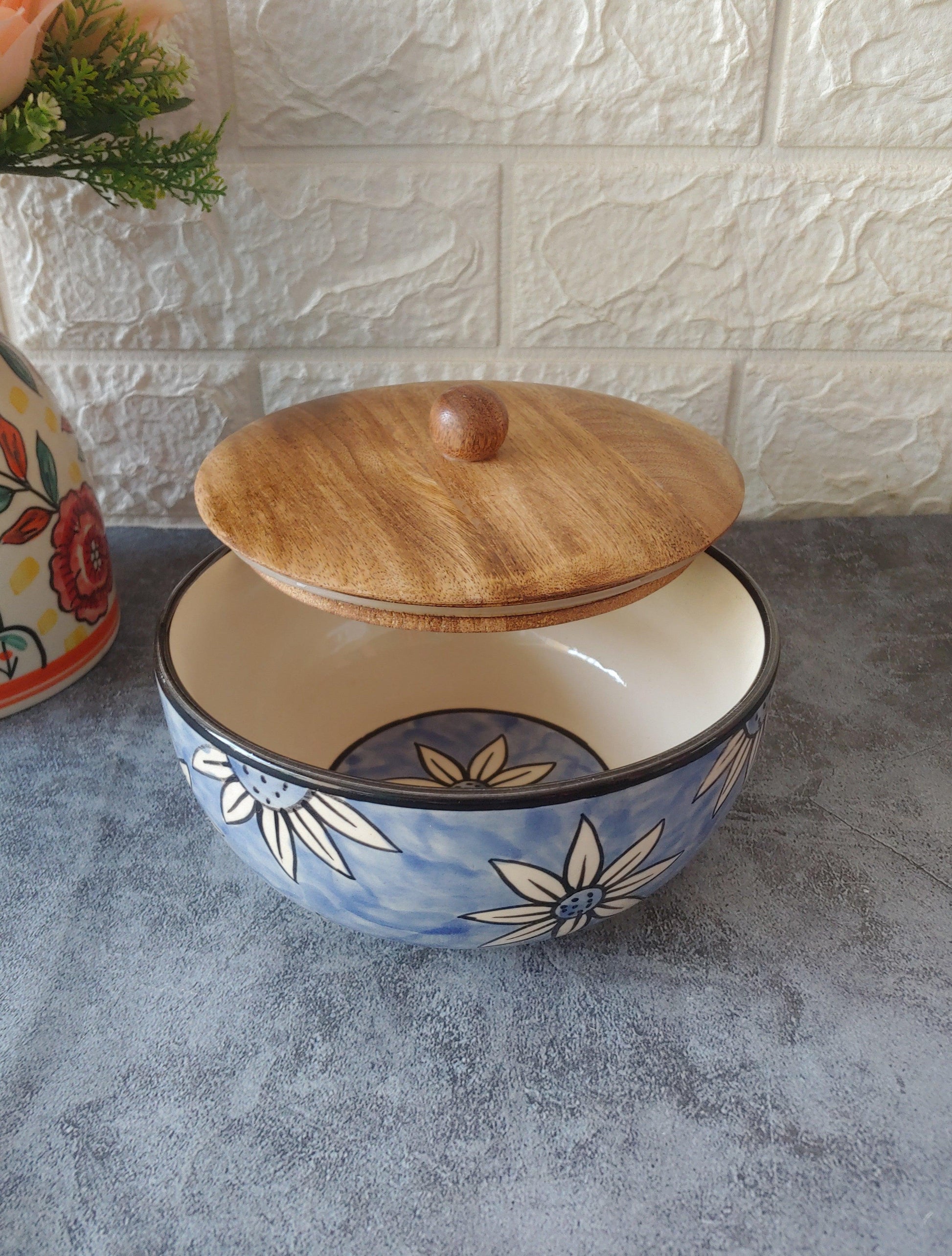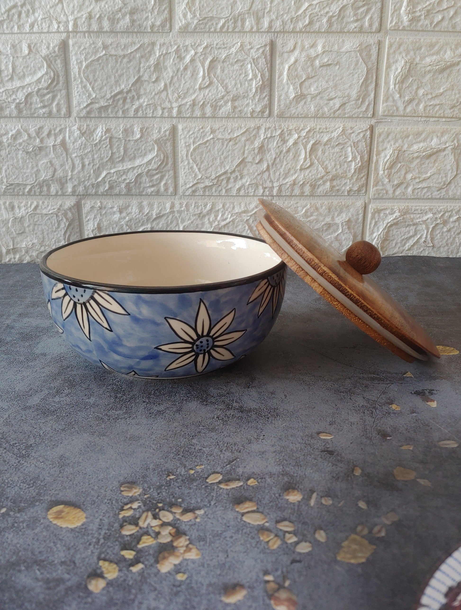 Cerulean Haven Designer airtight Ceramic Serving Bowls with lid, 600ml