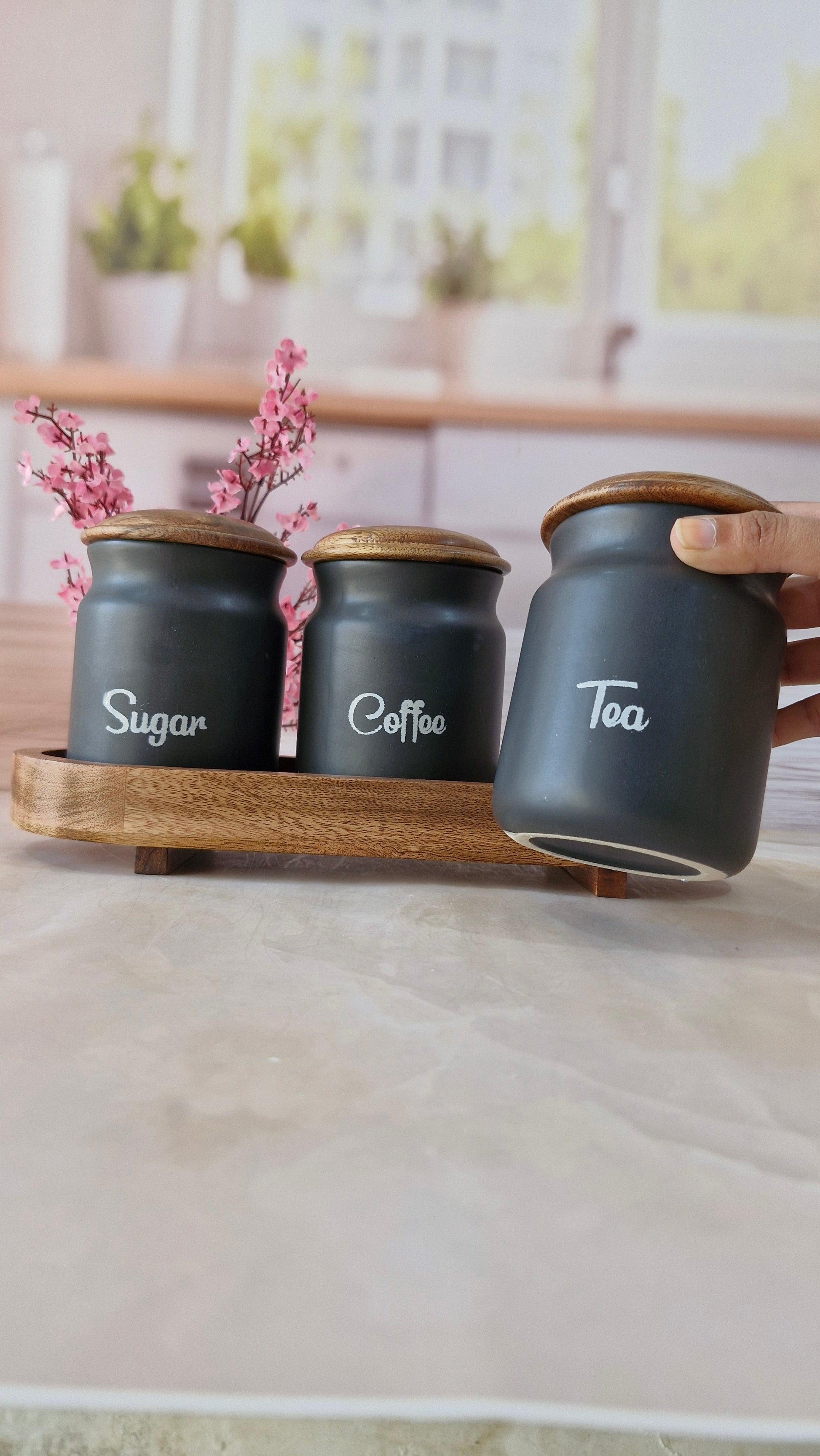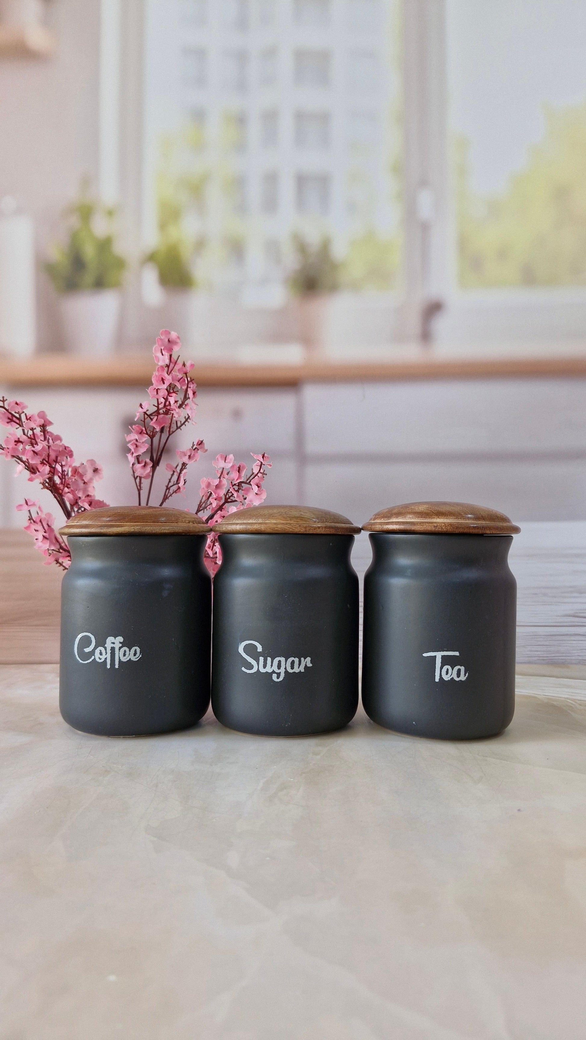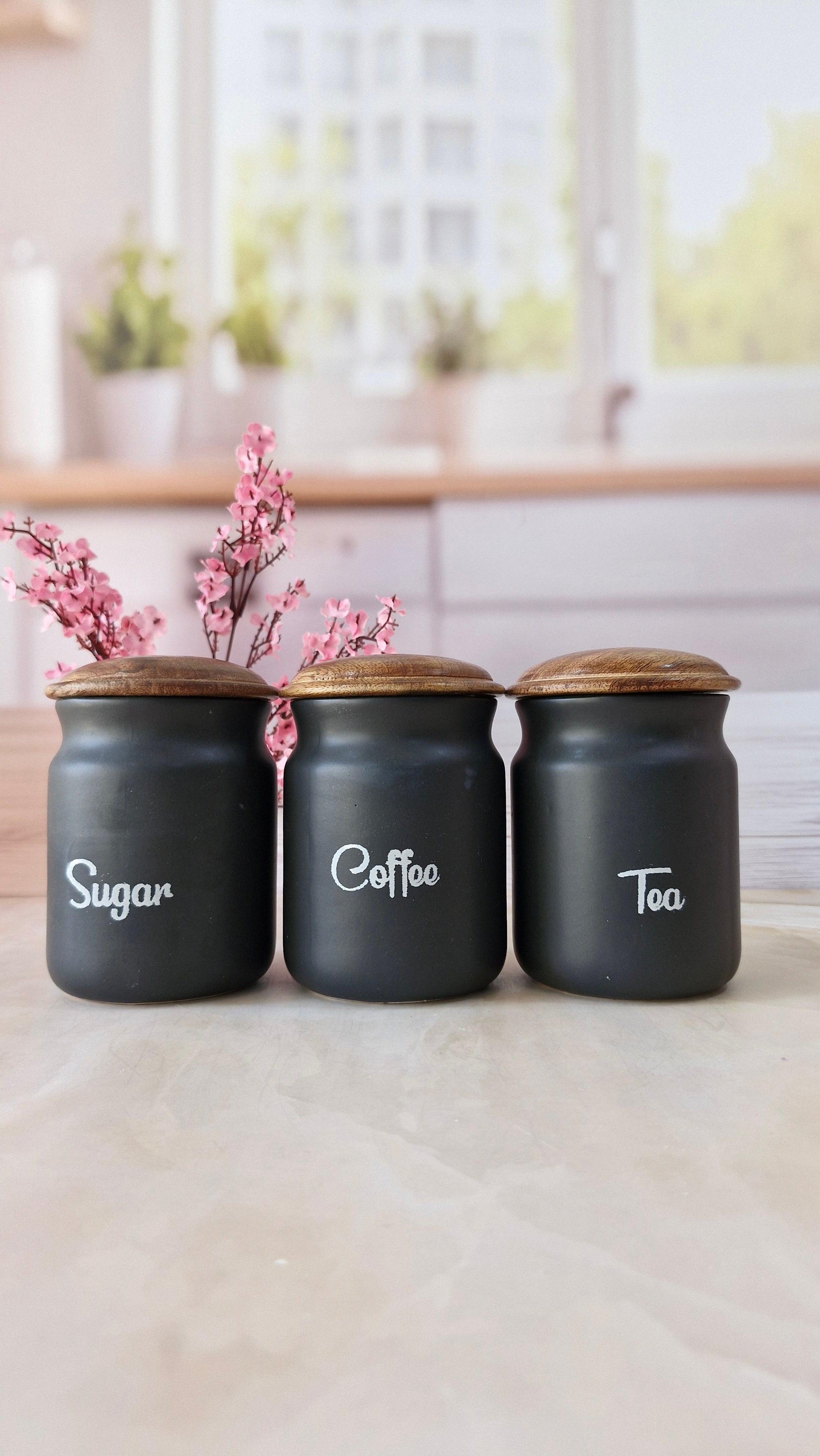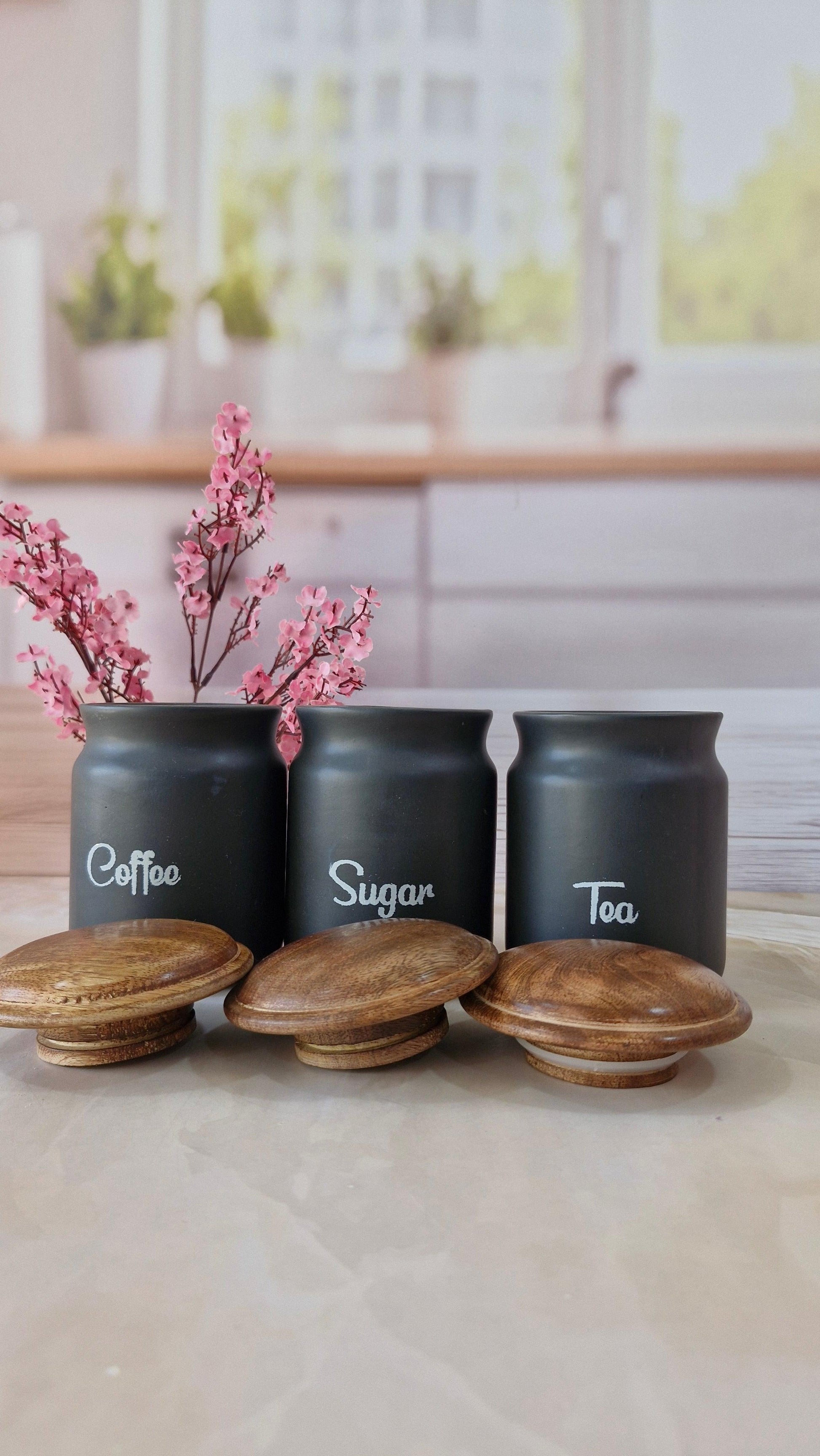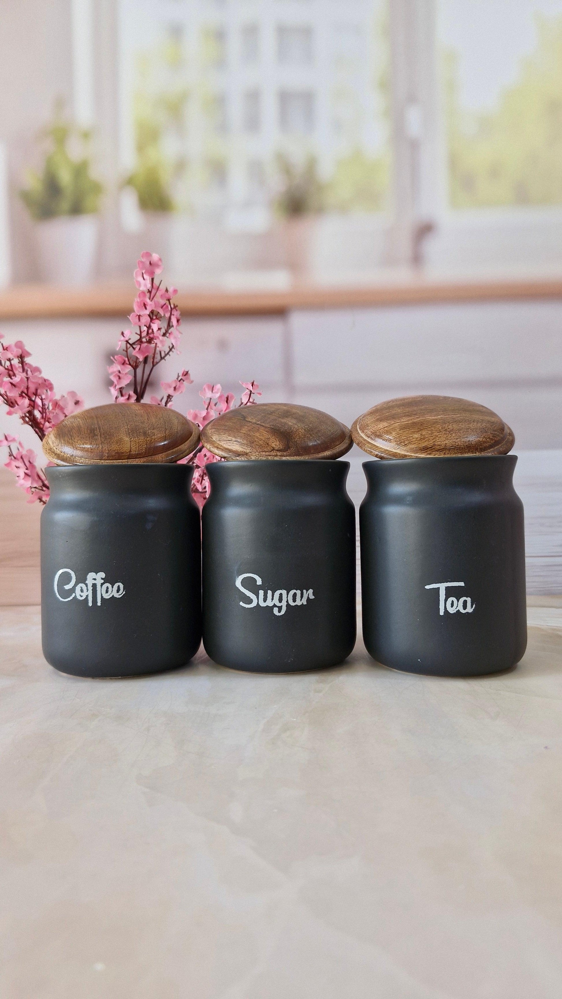 Charming Kitchen ceramic black airtight Tea, coffee ,sugar jars with wooden lid