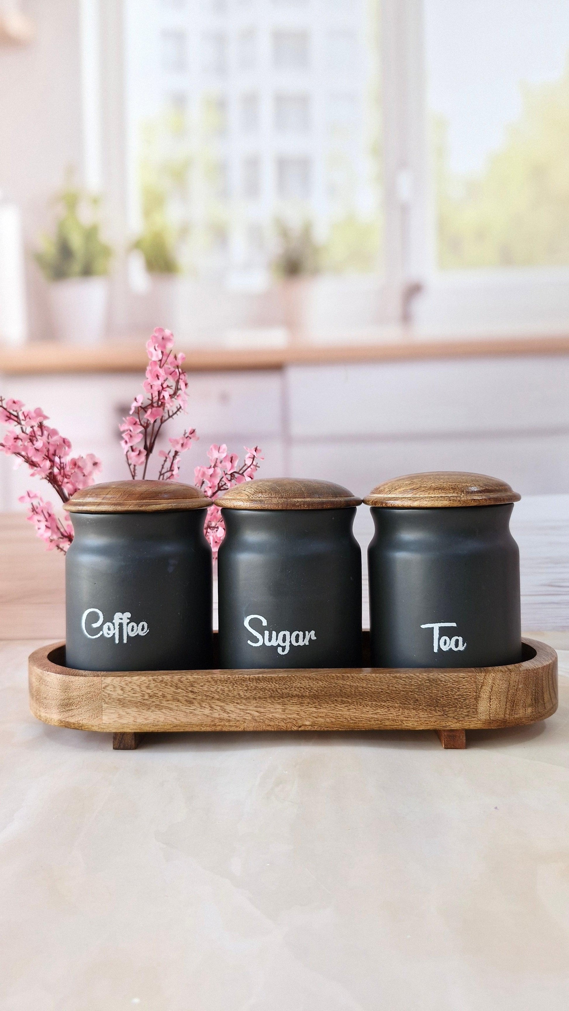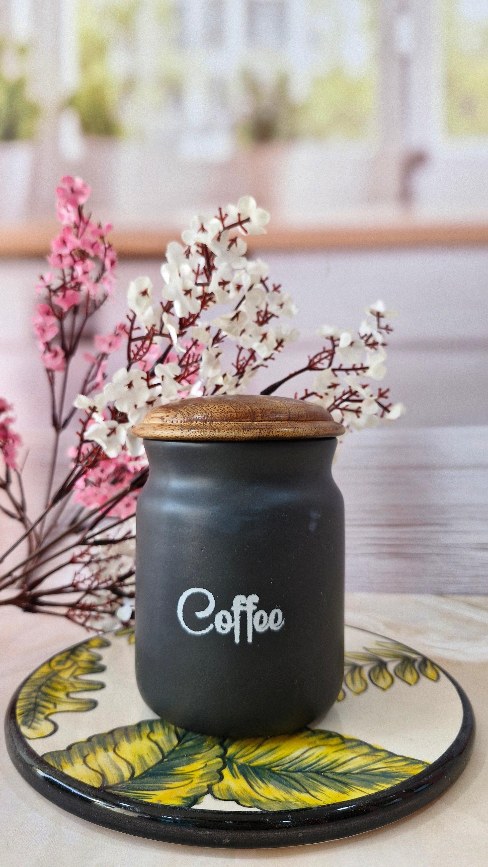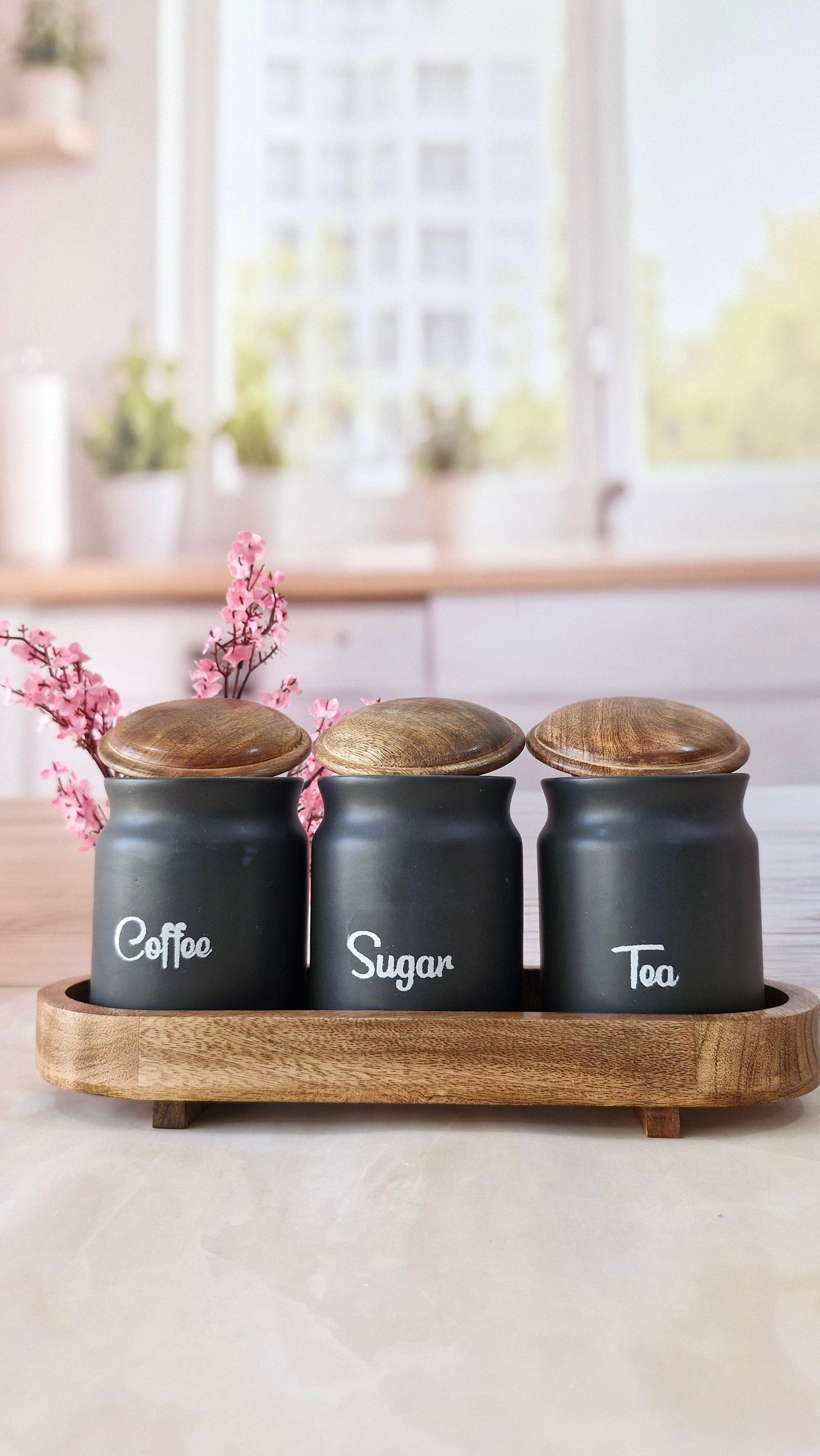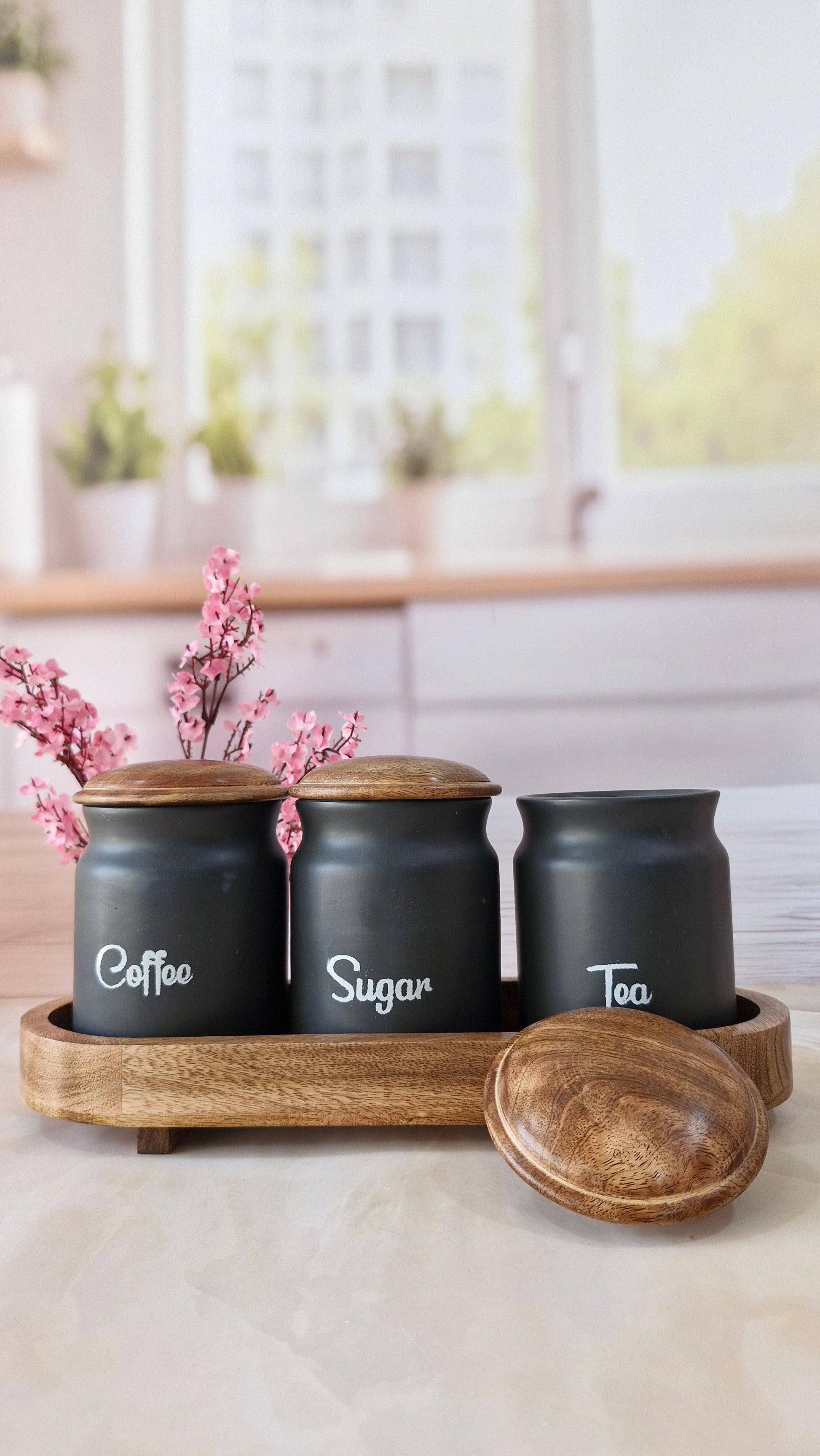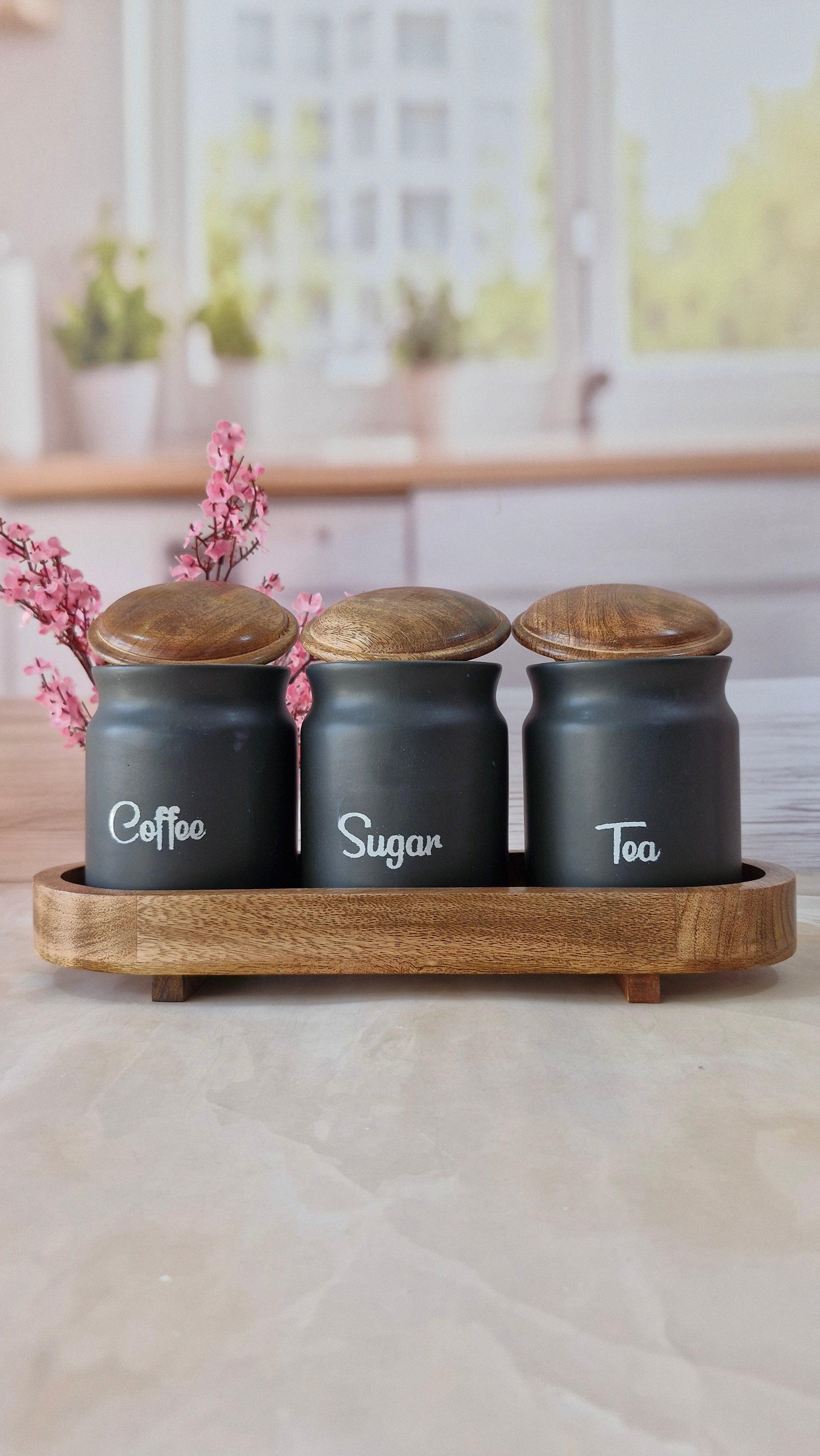 Charming Kitchen ceramic black airtight Tea, coffee ,sugar jars with wooden lid