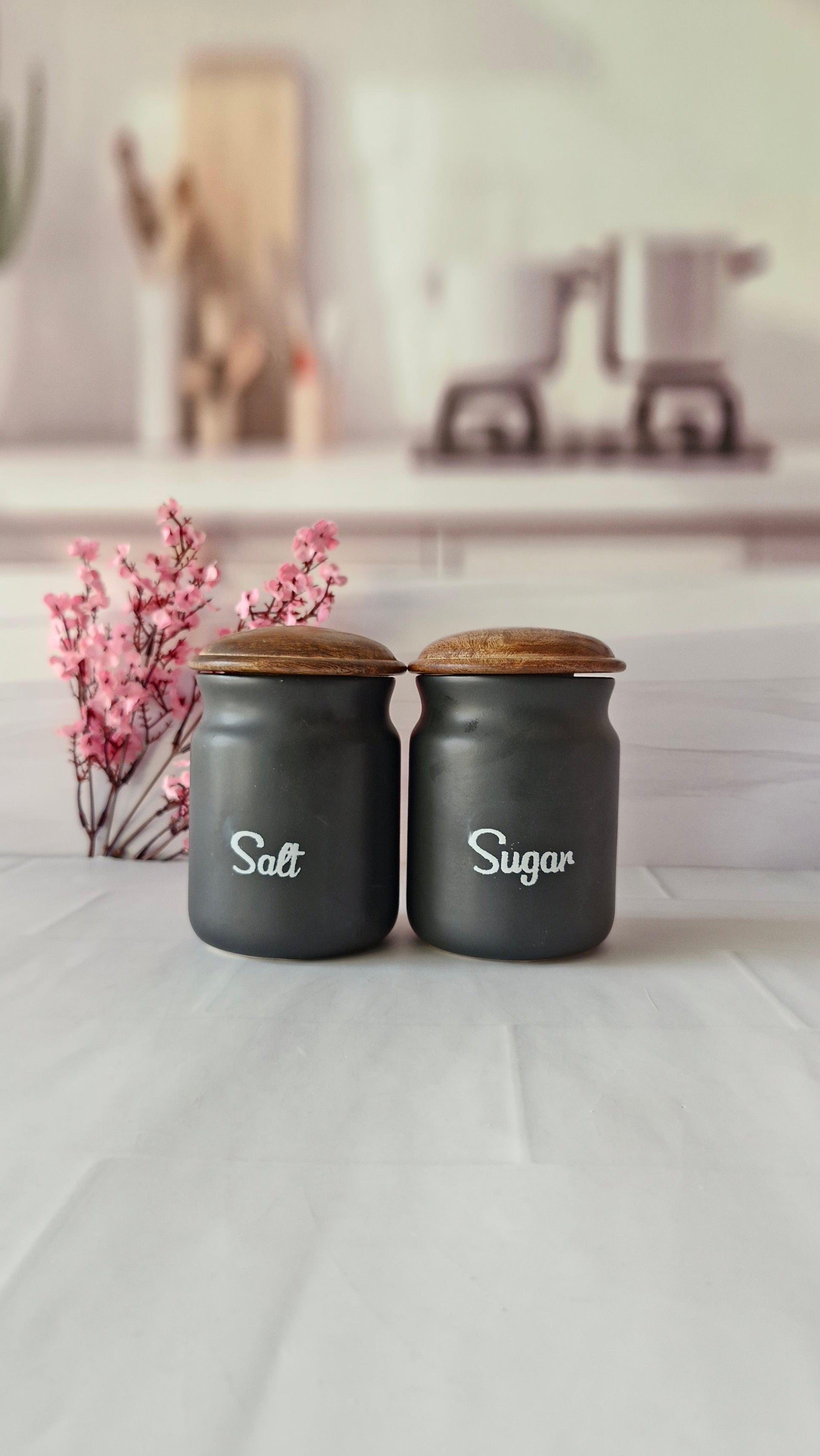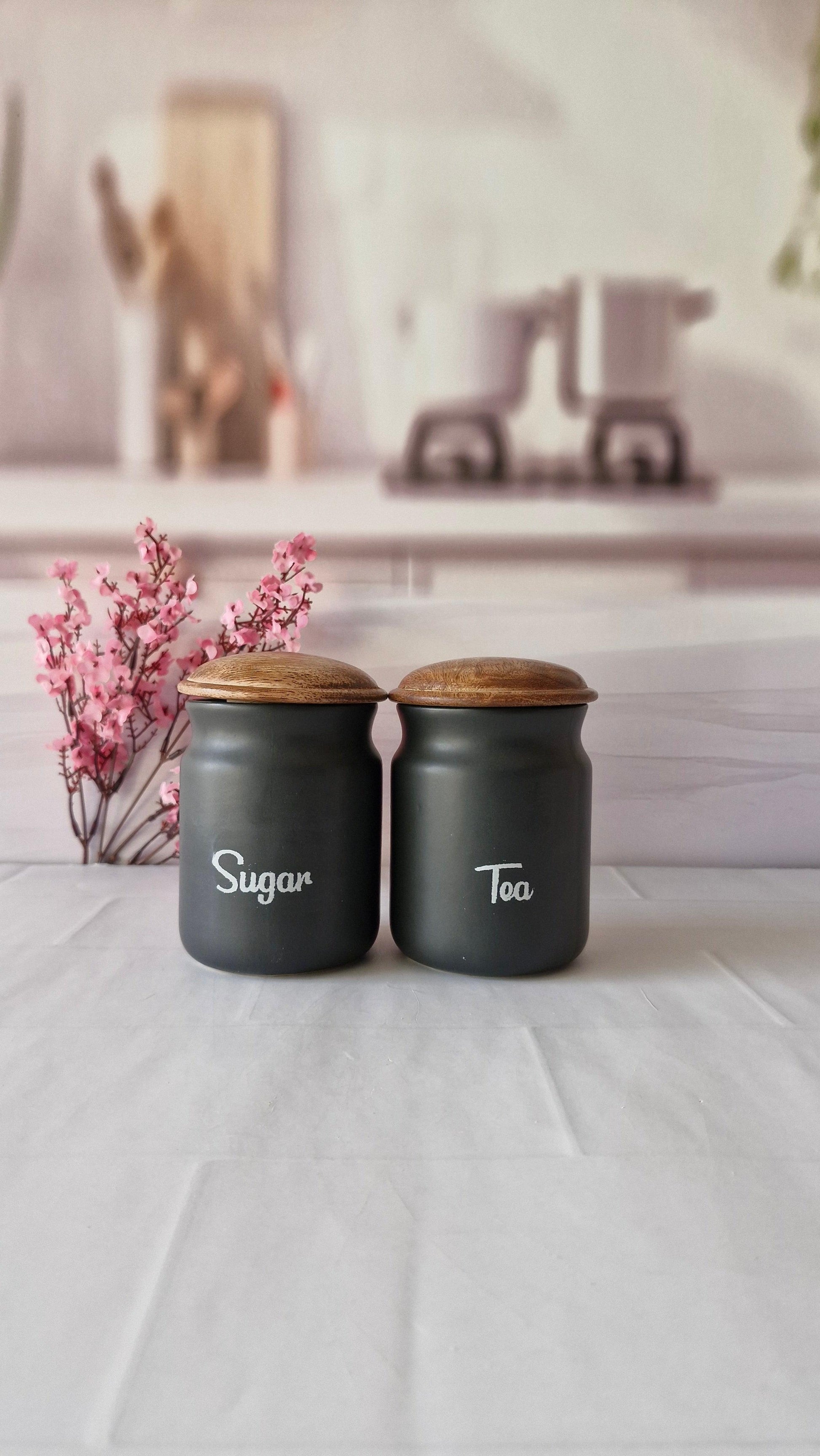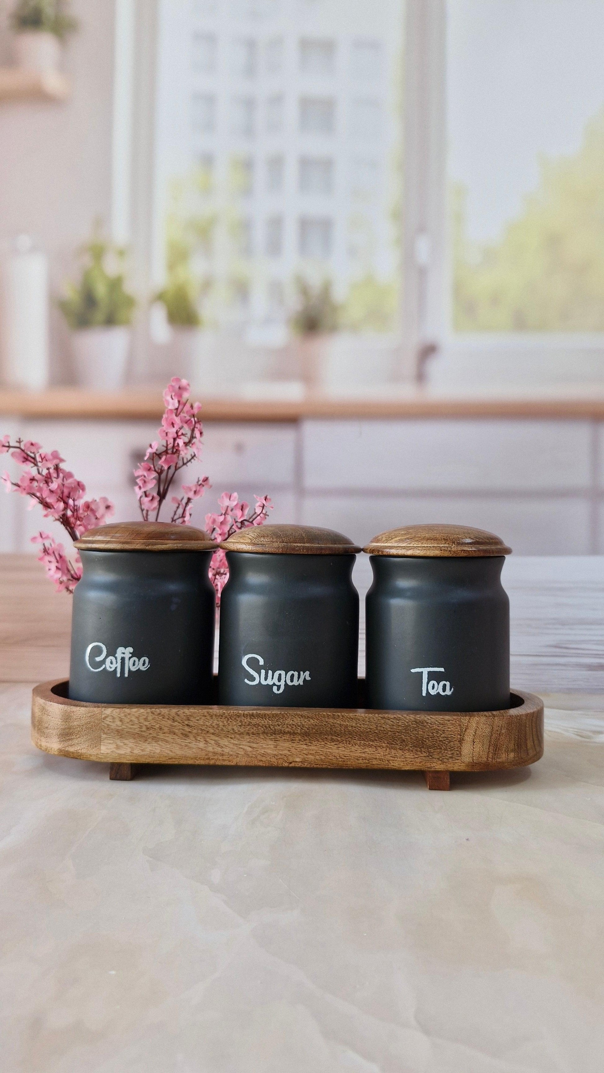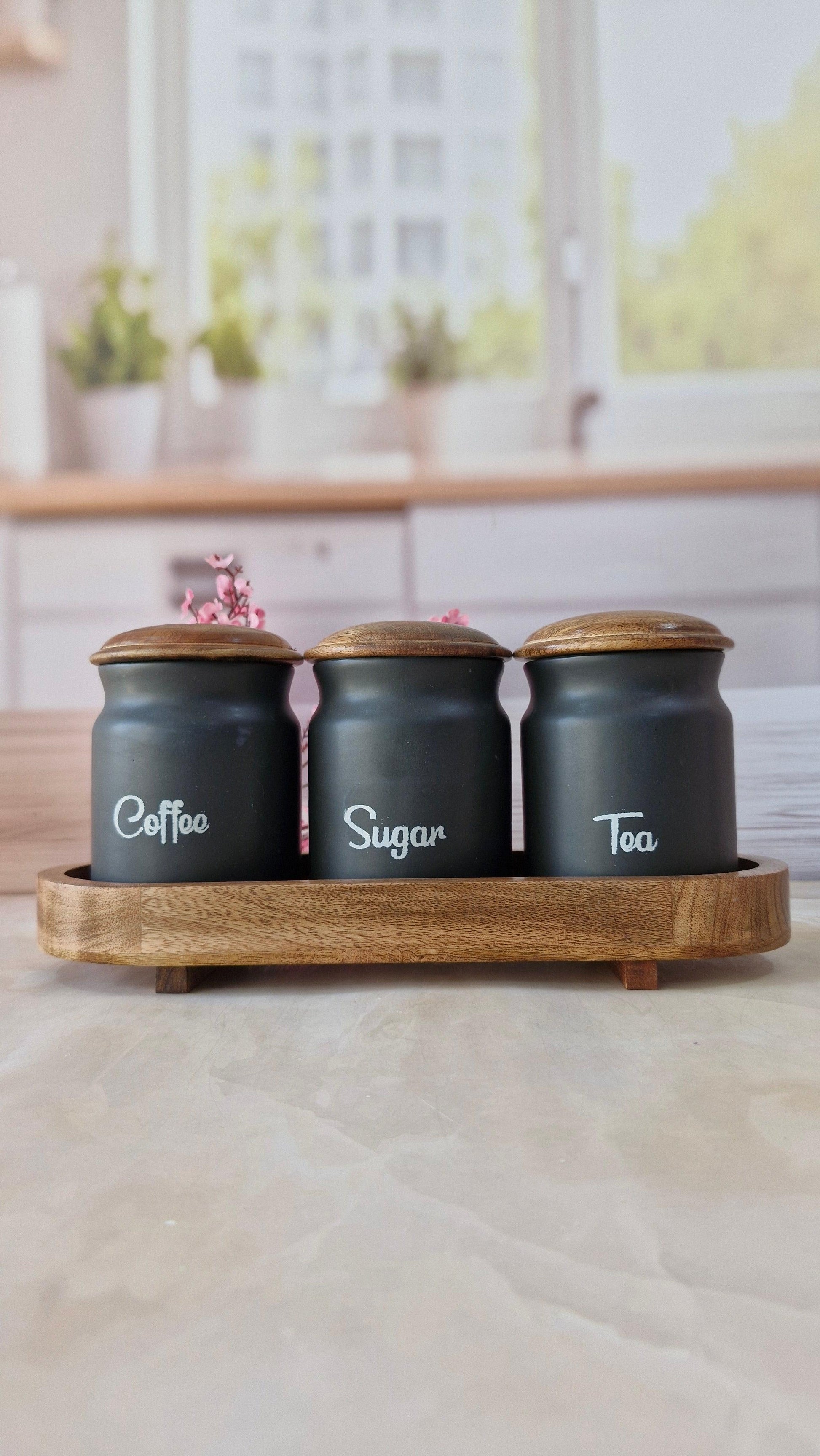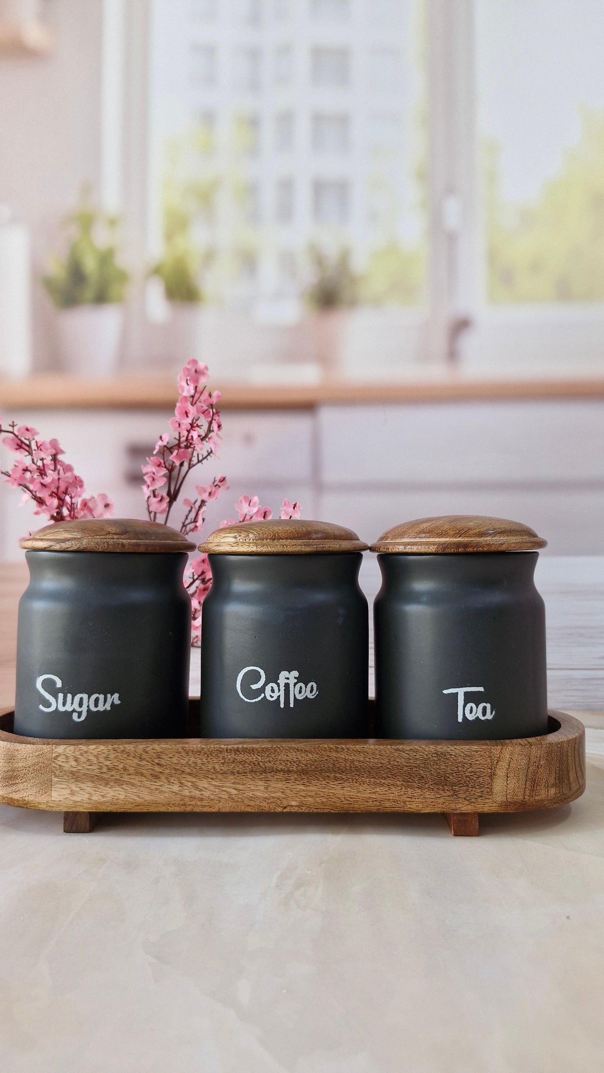 Charming Kitchen ceramic black airtight Tea, coffee ,sugar jars with wooden lid