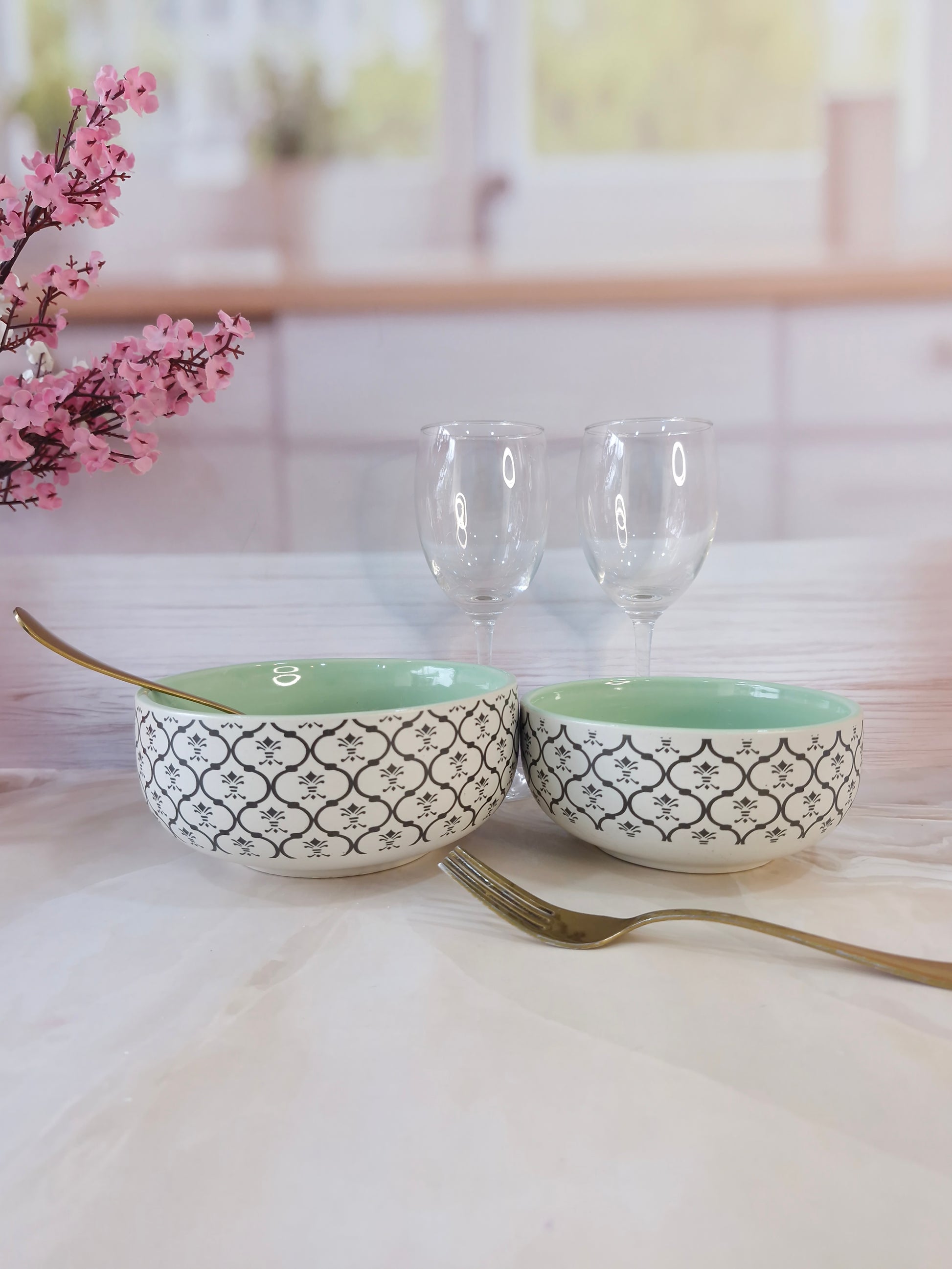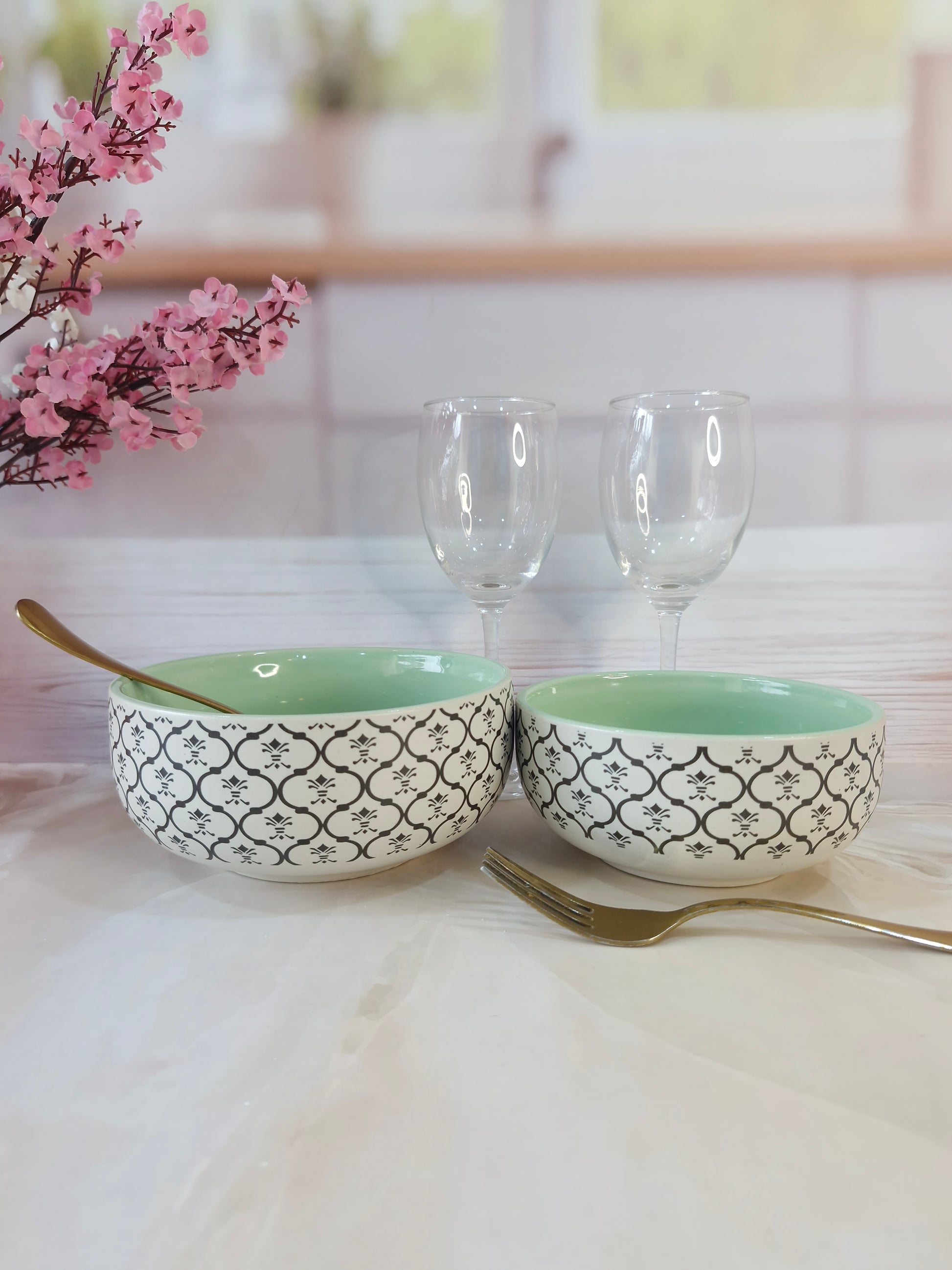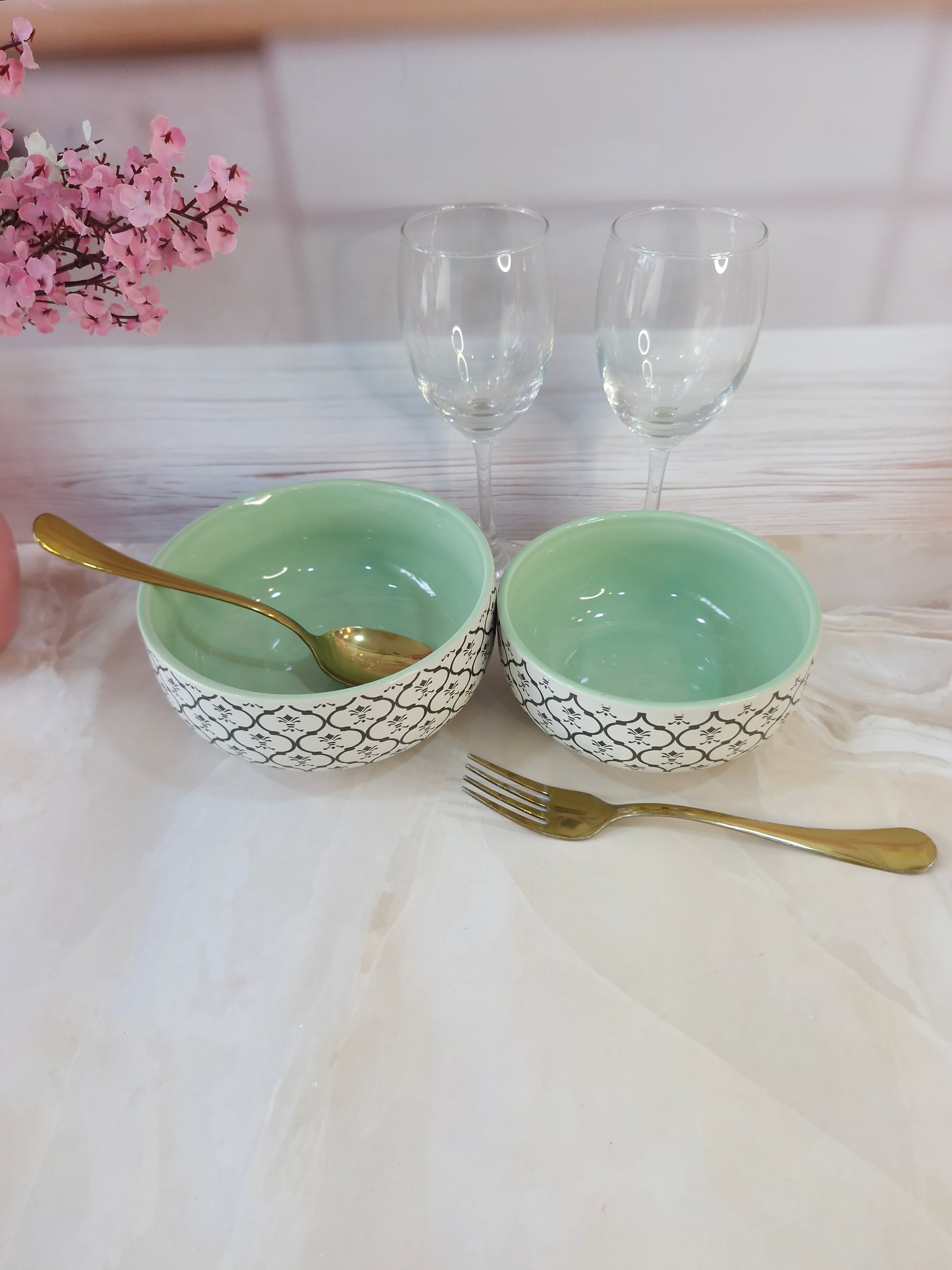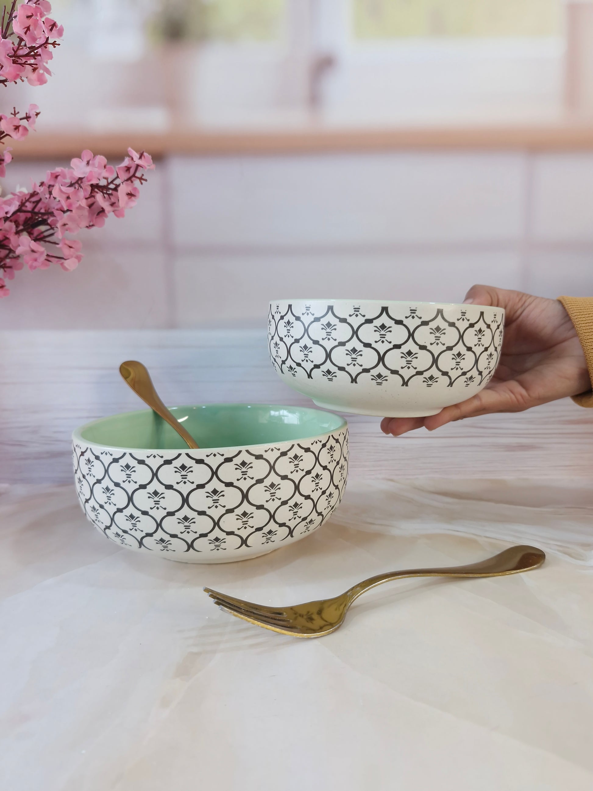 Dreamy Beauty Delight Green Handpainted Ceramic Serving Dining Bowls