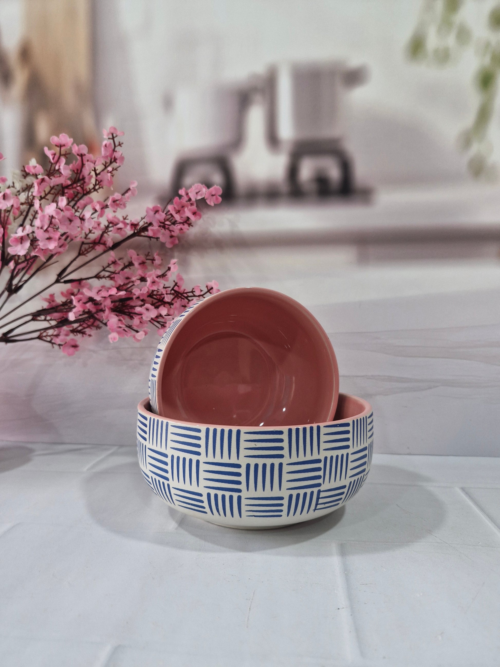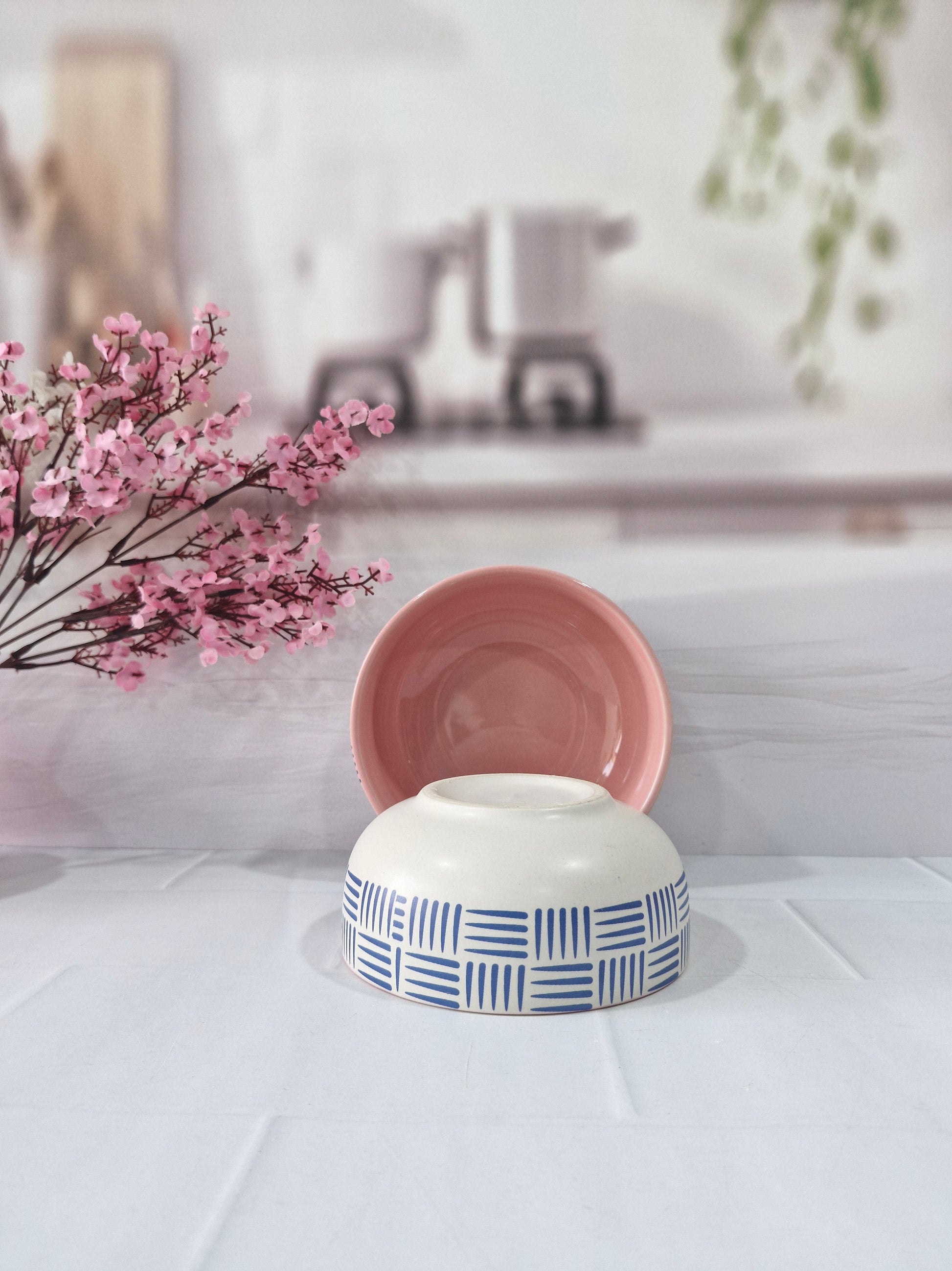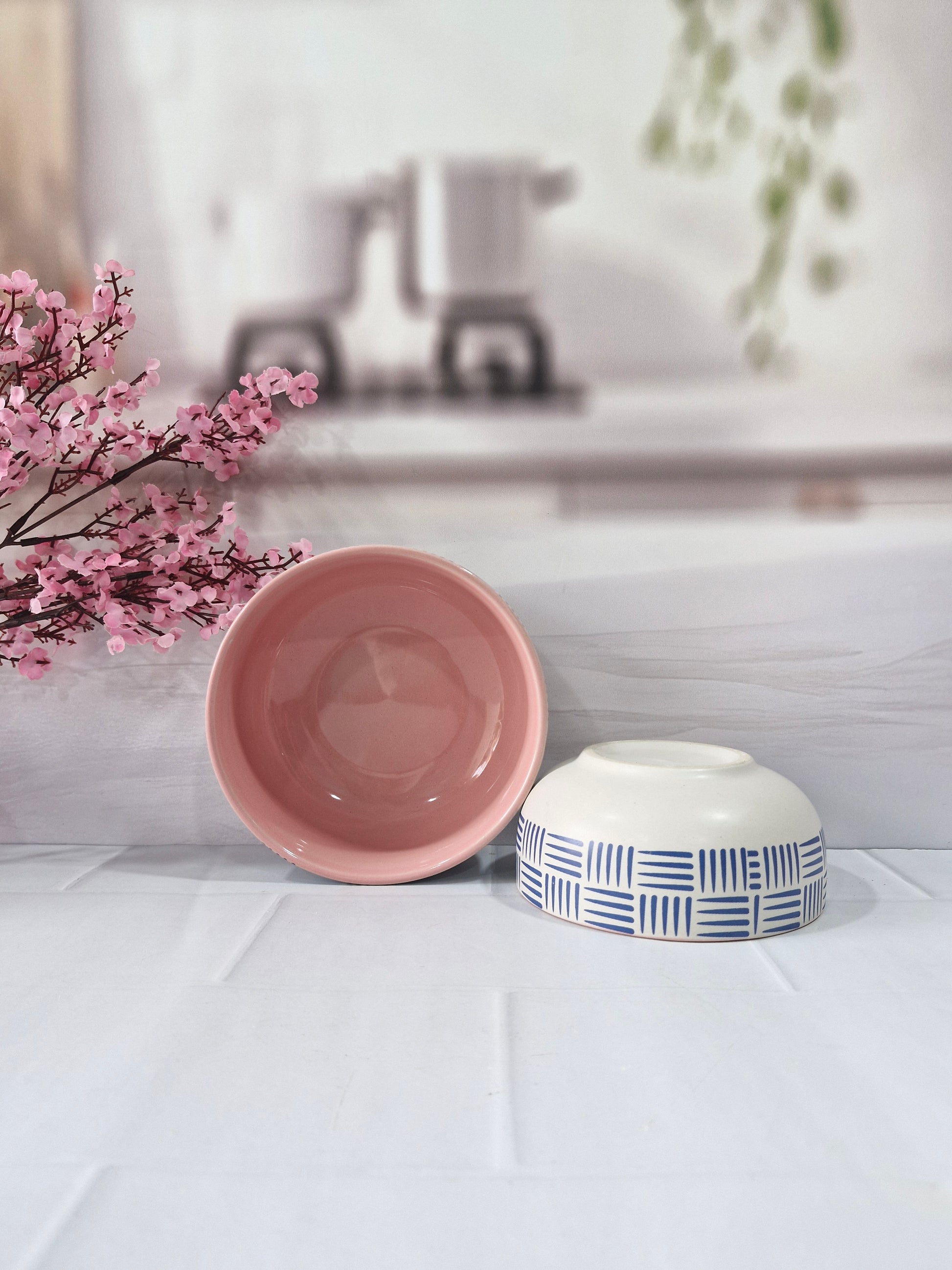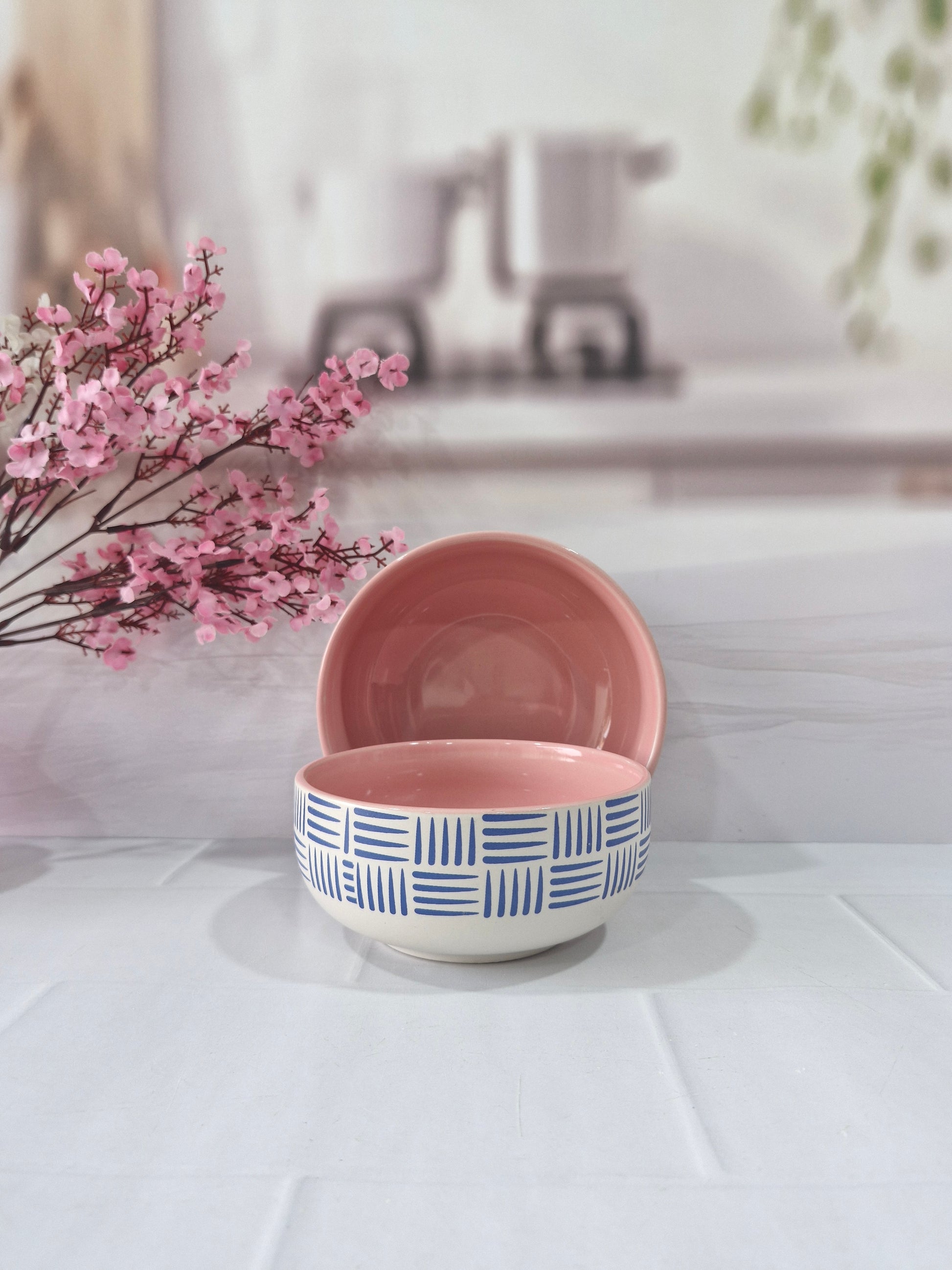 Geometric Pattern Beauty Pink Handpainted Ceramic Serving Dining Bowls