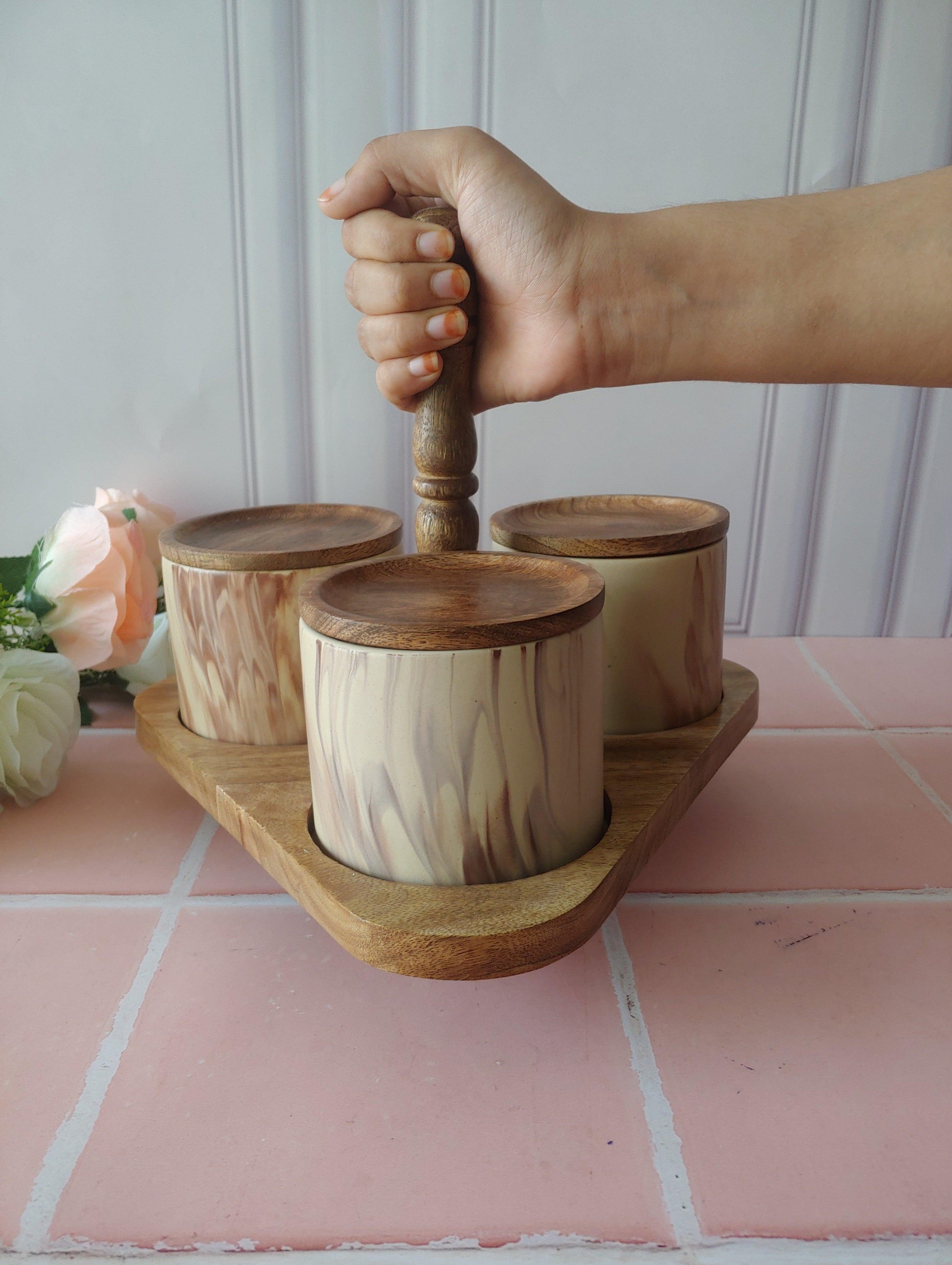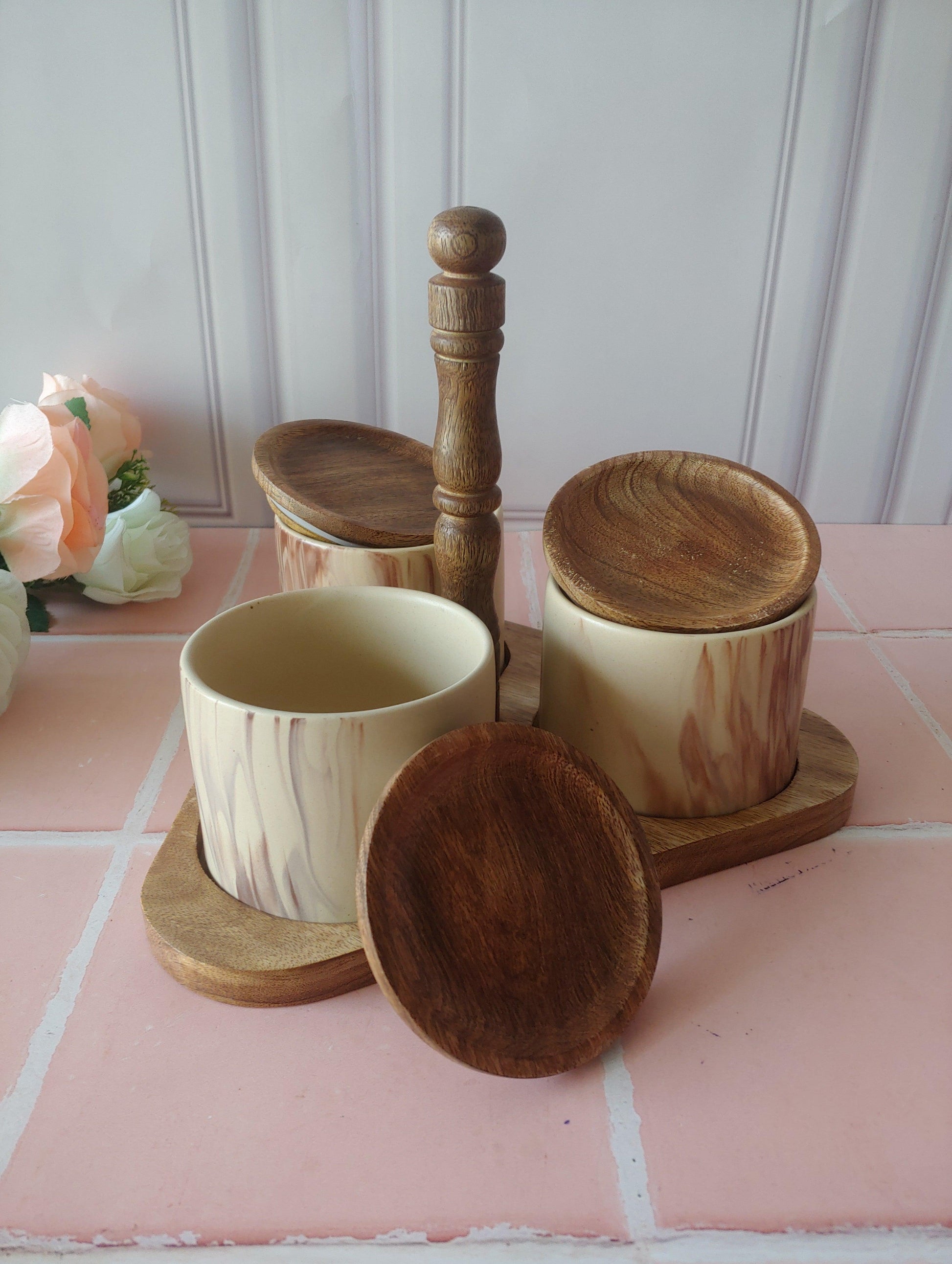 Ivory Artisan Stoneware Stackable Ceramic Spice Jars (300ml) with Wood Base