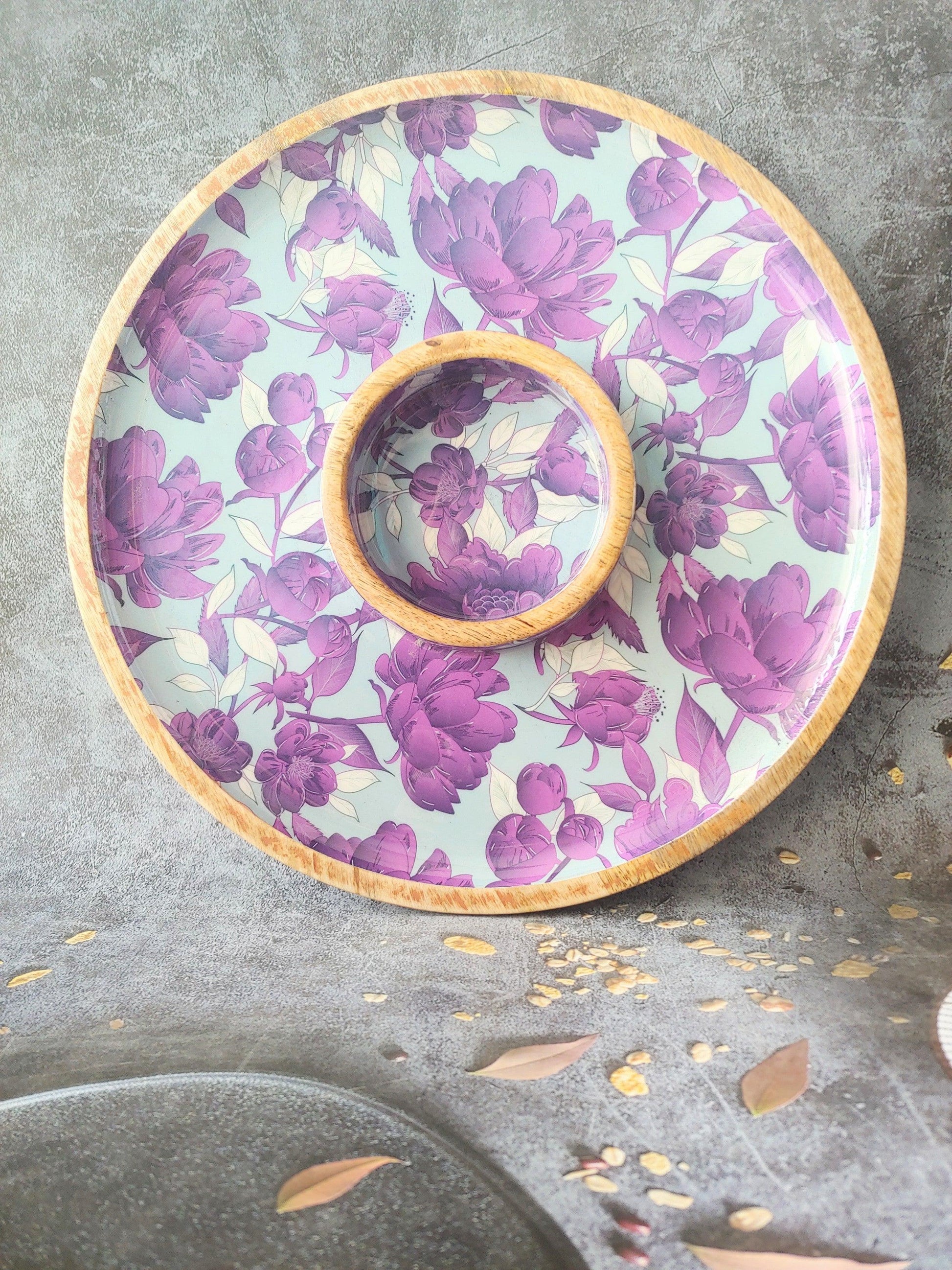 This beautiful purple floral wooden serving platter is the perfect addition to any table setting. The platter is made of sustainably sourced wood and has a hand-painted floral design that is sure to bring a touch of elegance to your home. The platter can be used for serving food, snacks along with drinks, or it can be displayed as a decorative piece. It is also a great gift for any occasion.