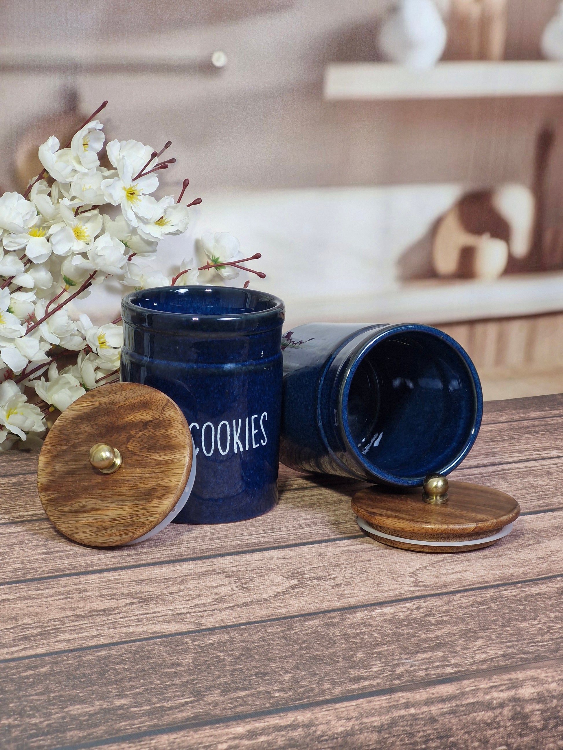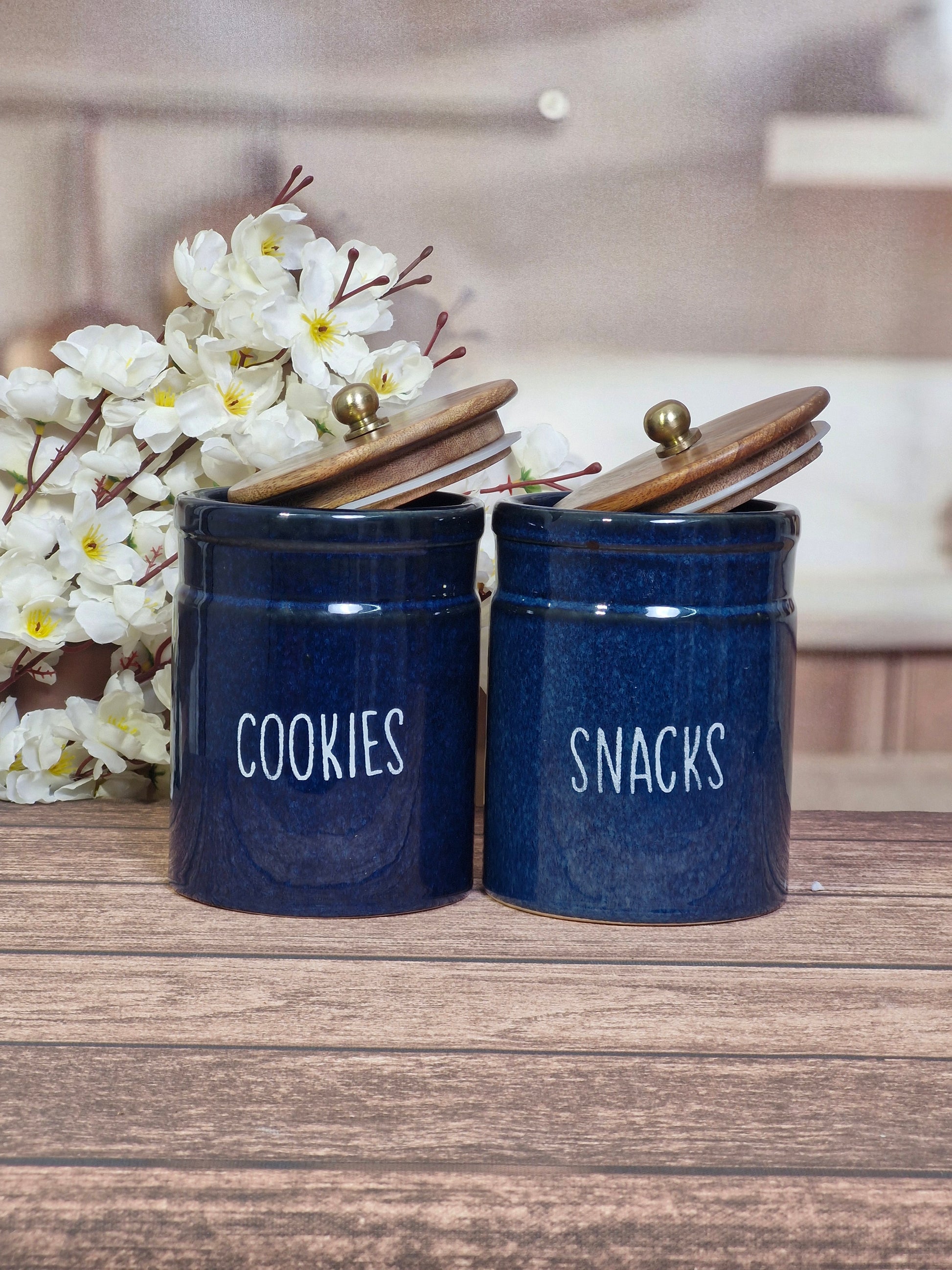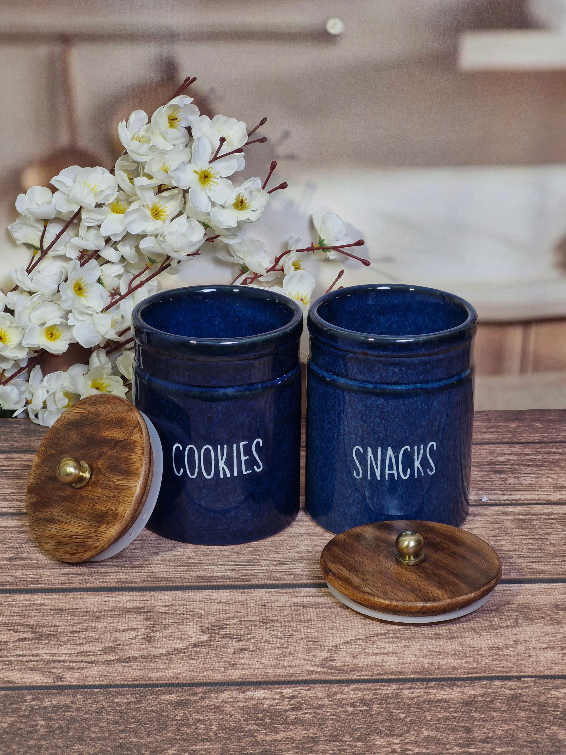 Rustic Blue Cookie and Snack Ceramic Canister Jars with Wooden Lids (Set of 2)