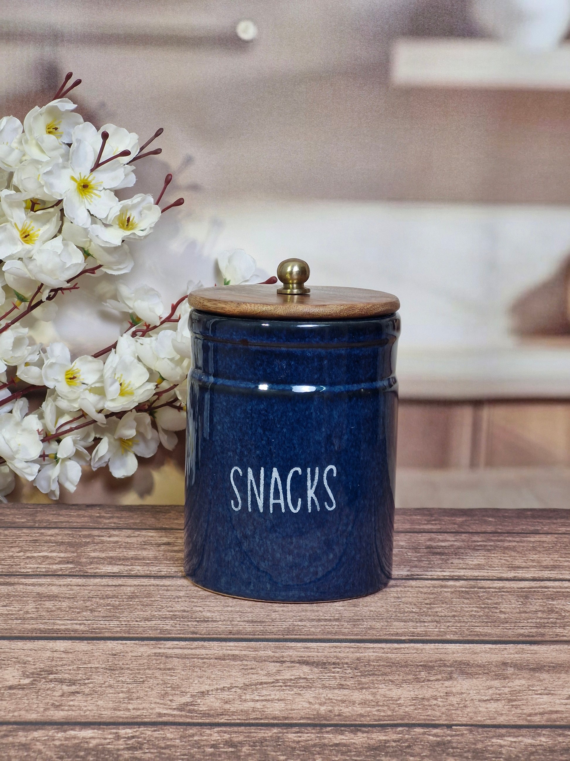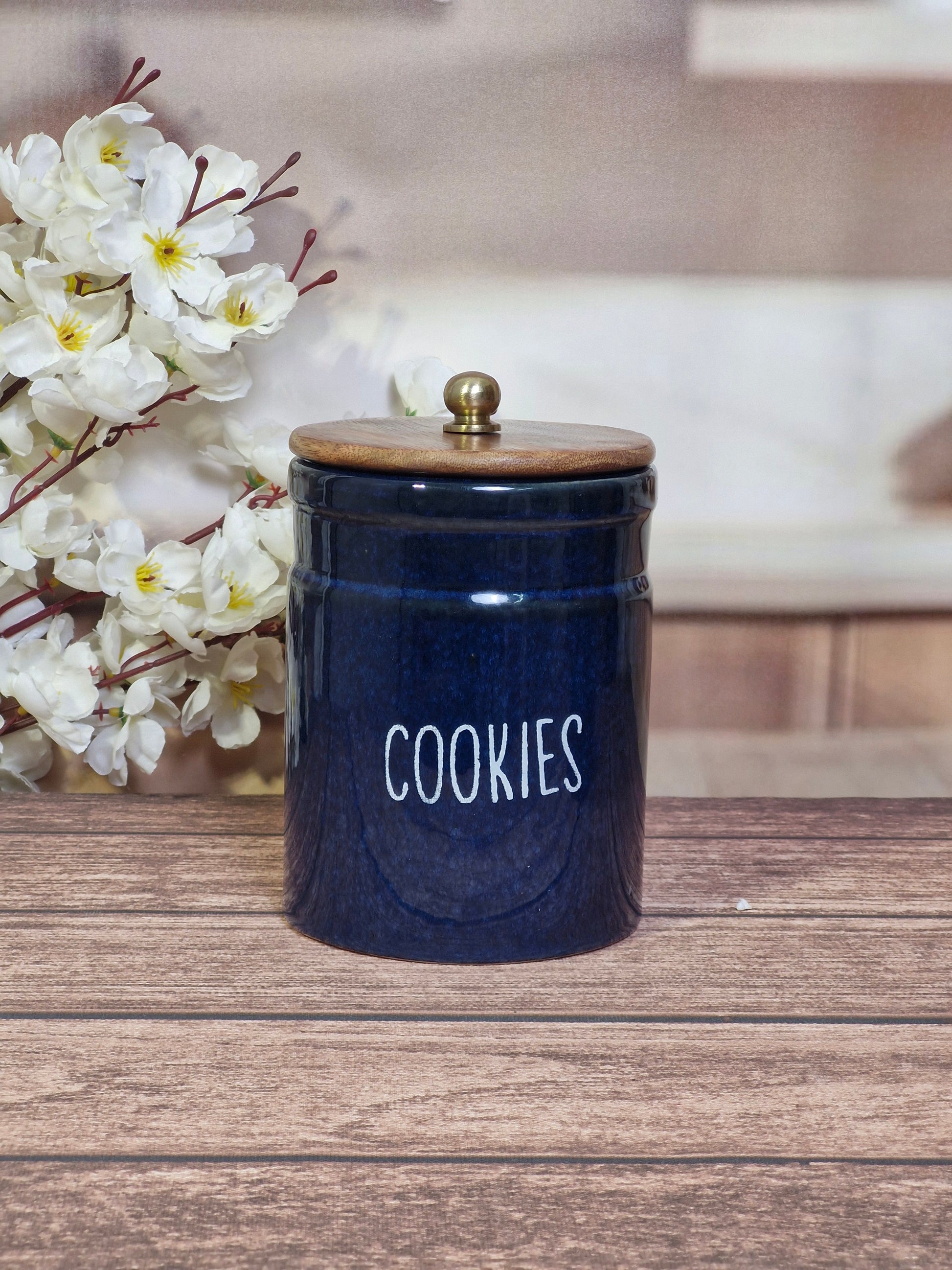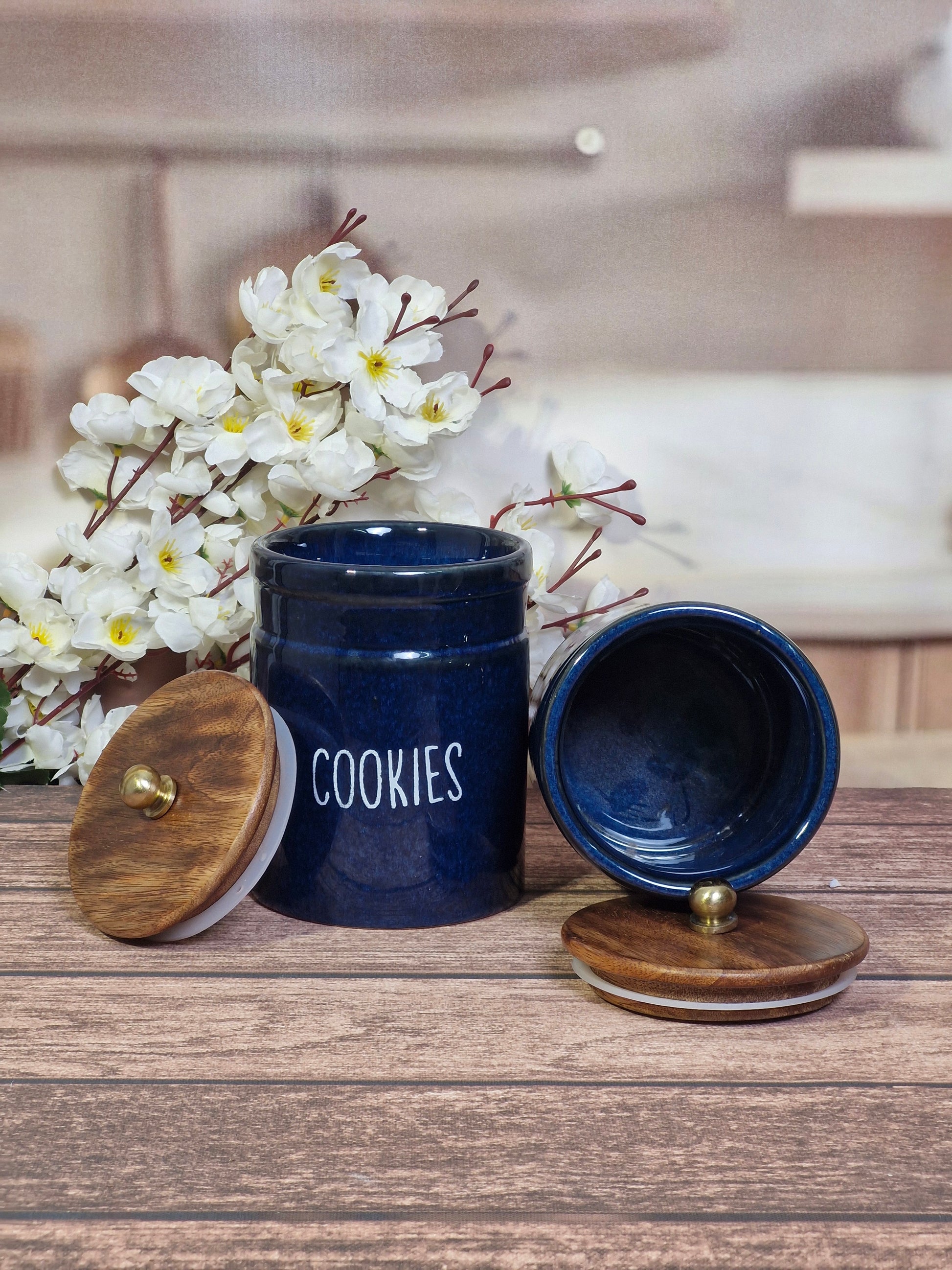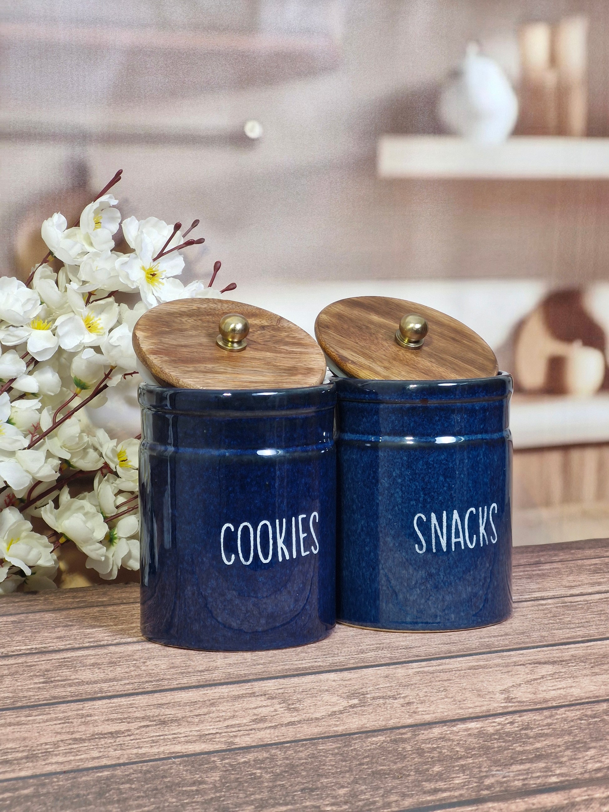 Rustic Blue Cookie and Snack Ceramic Canister Jars with Wooden Lids (Set of 2)