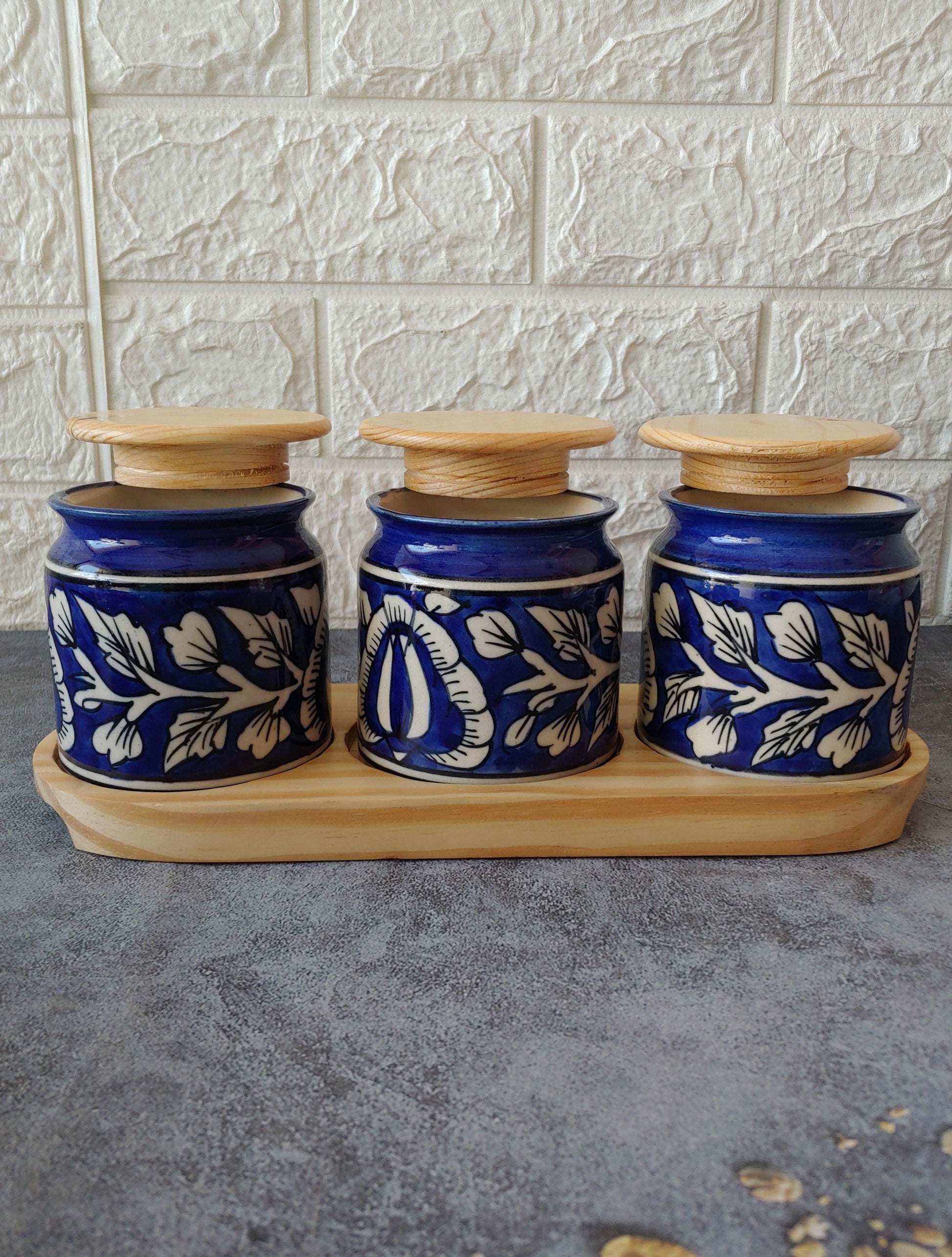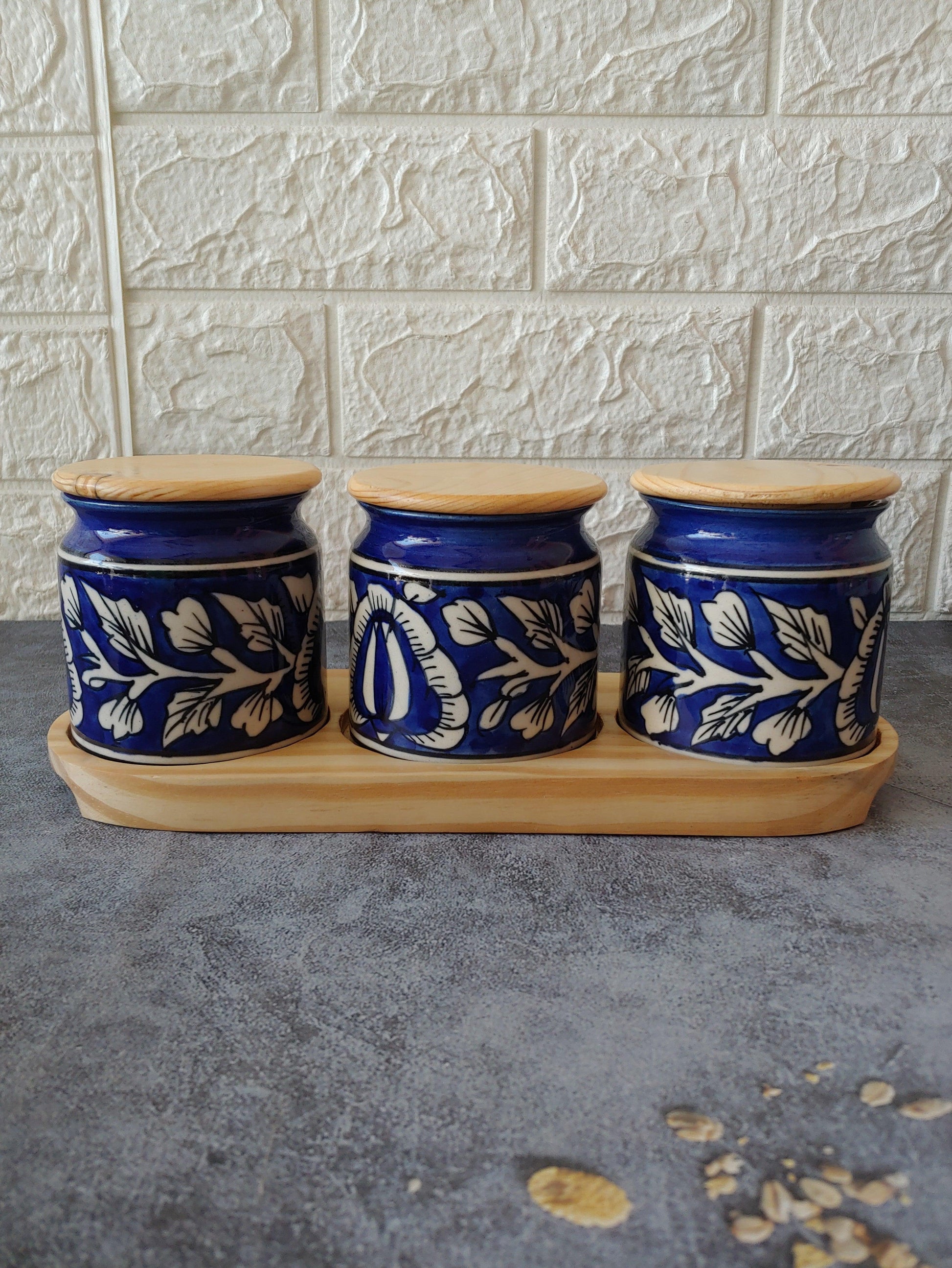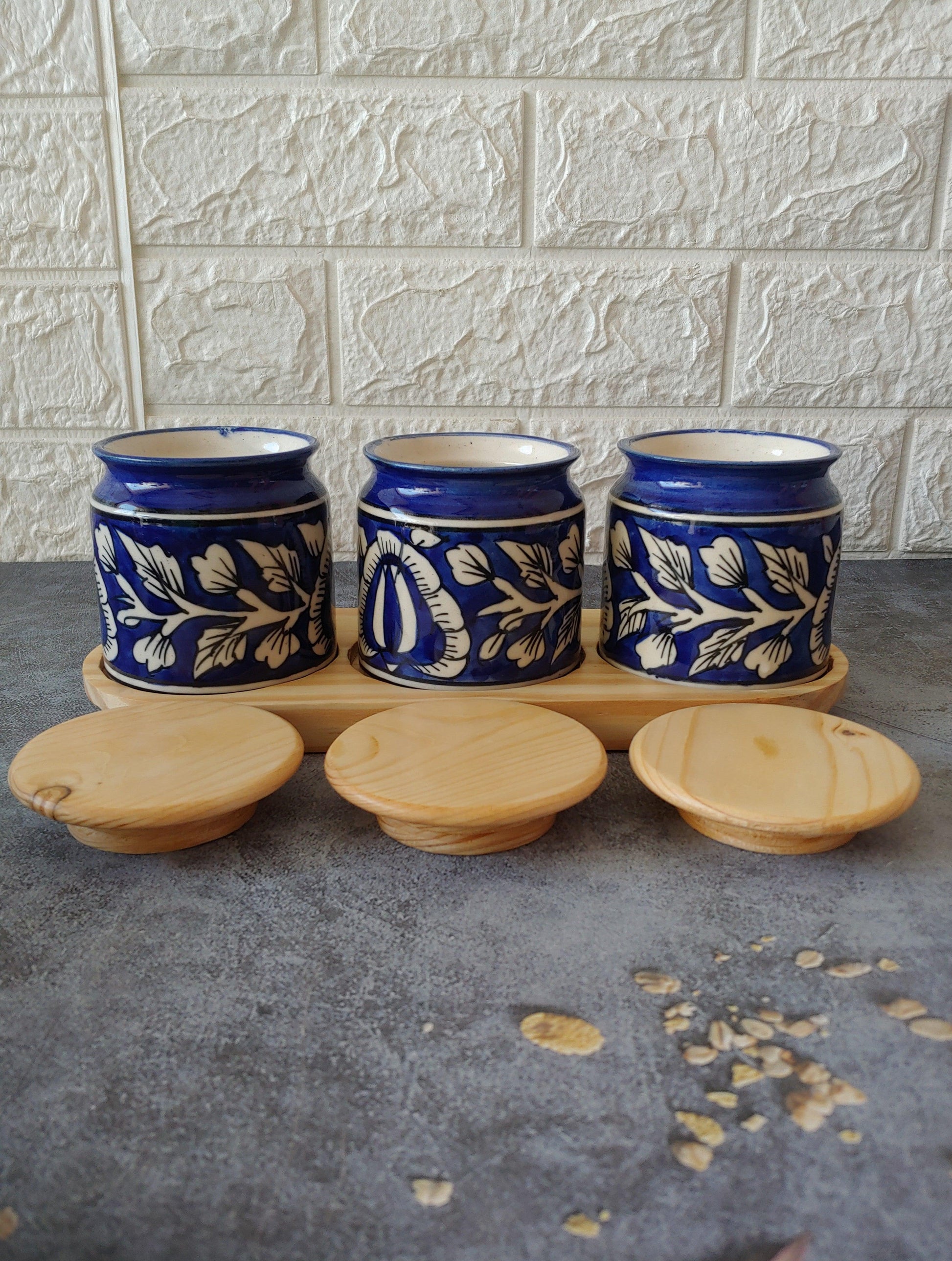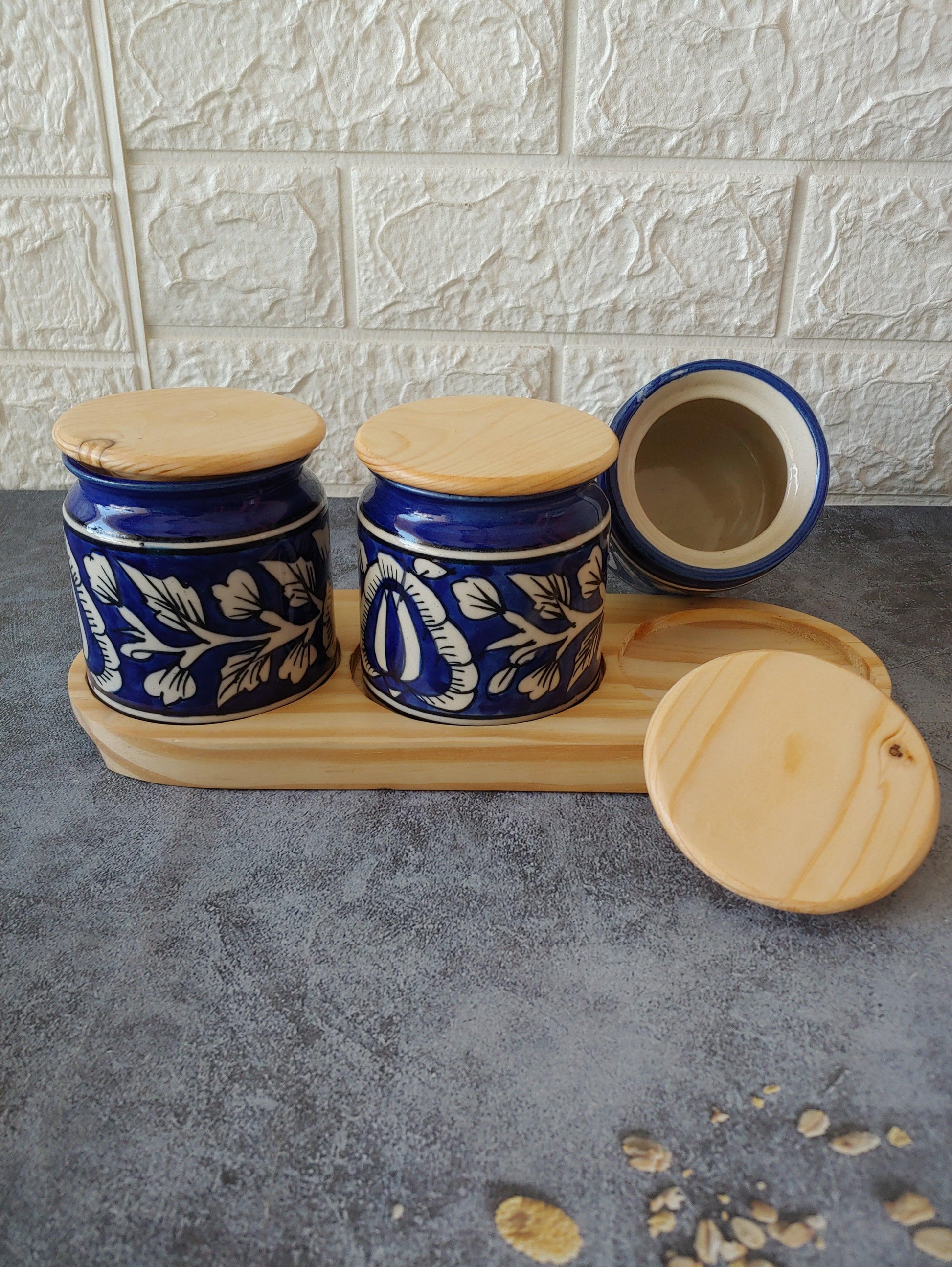 The Blue Bloomers Ceramic Kimchi Pickle Jar Set with wooden lid and tray