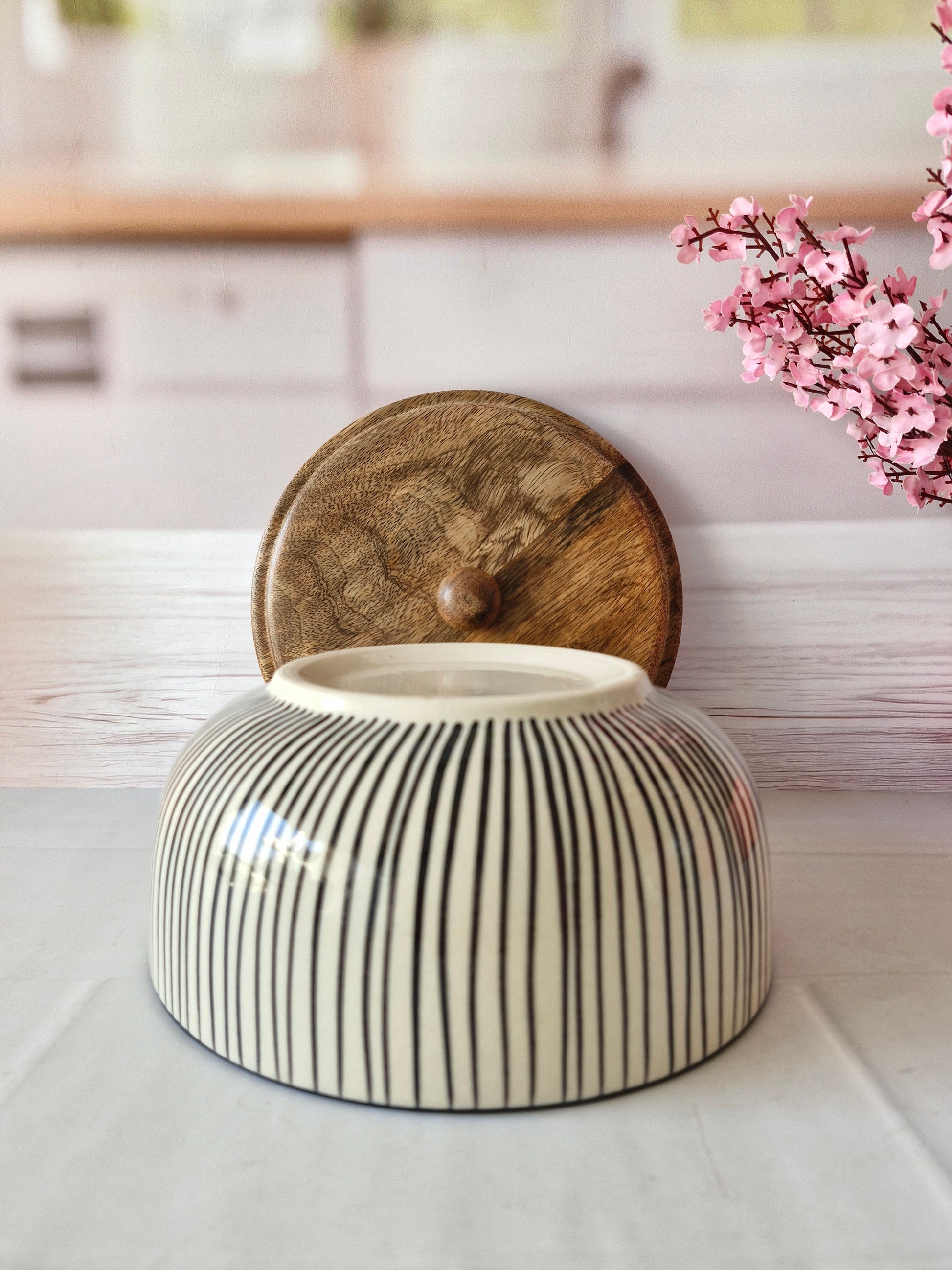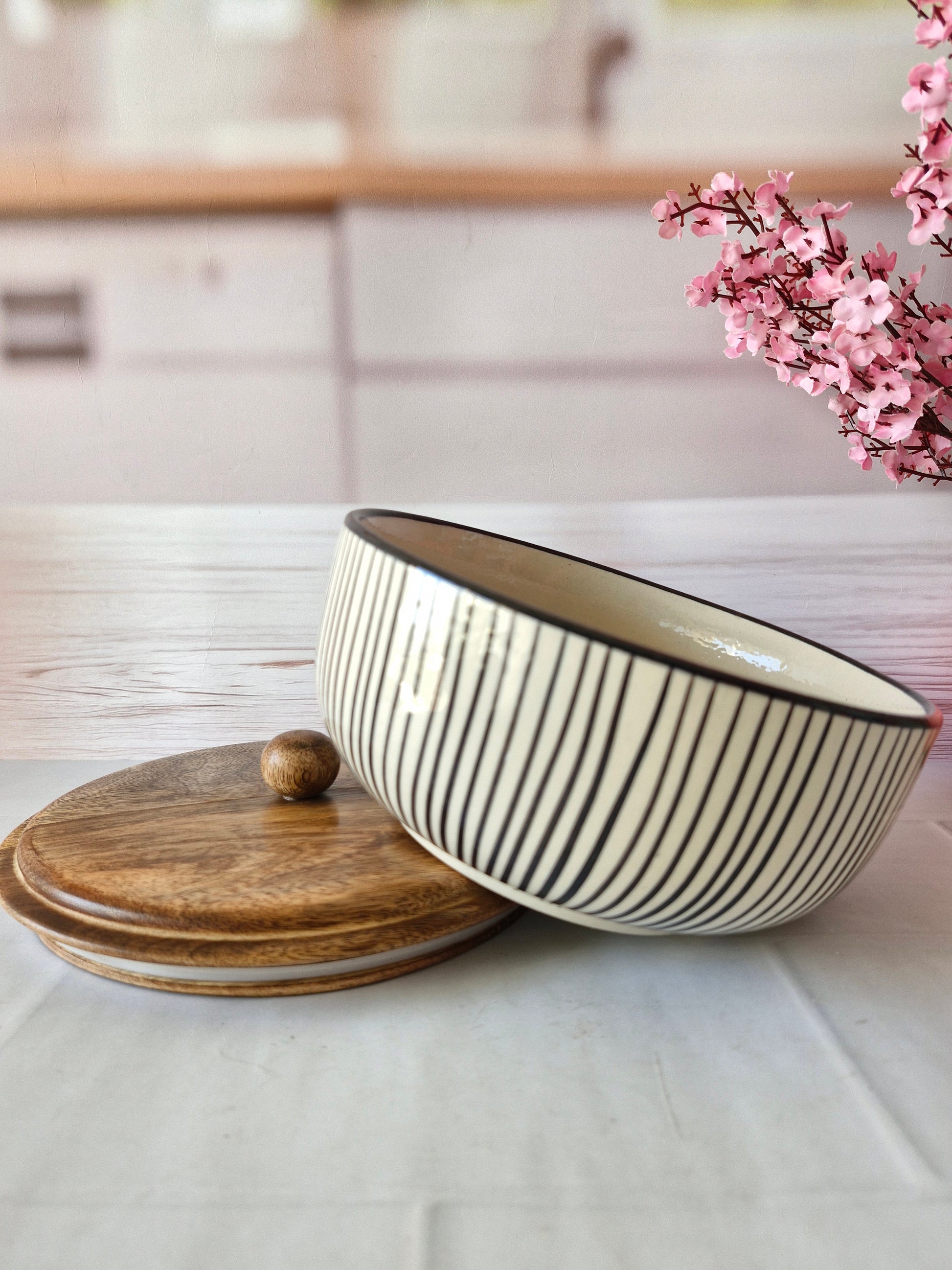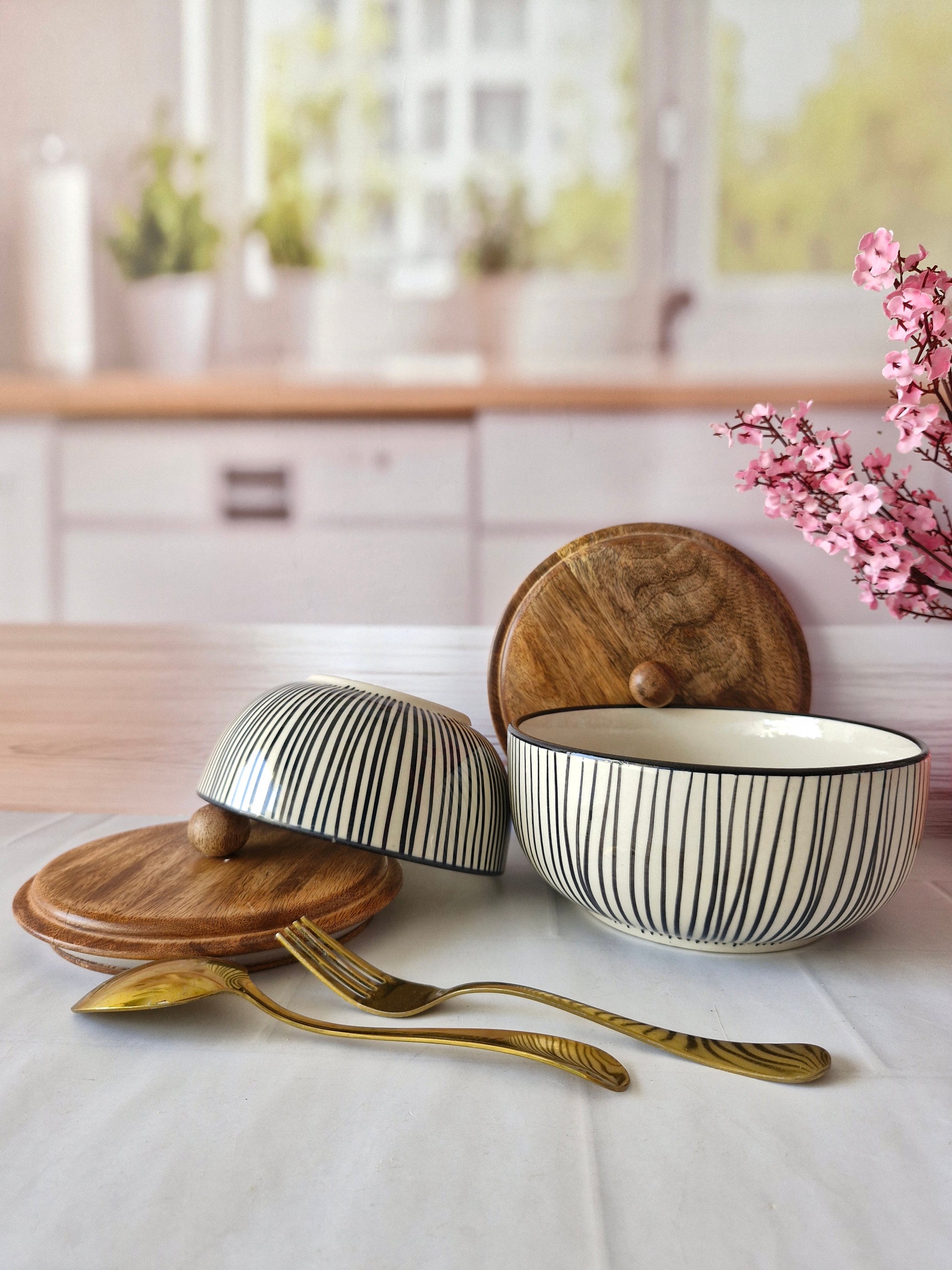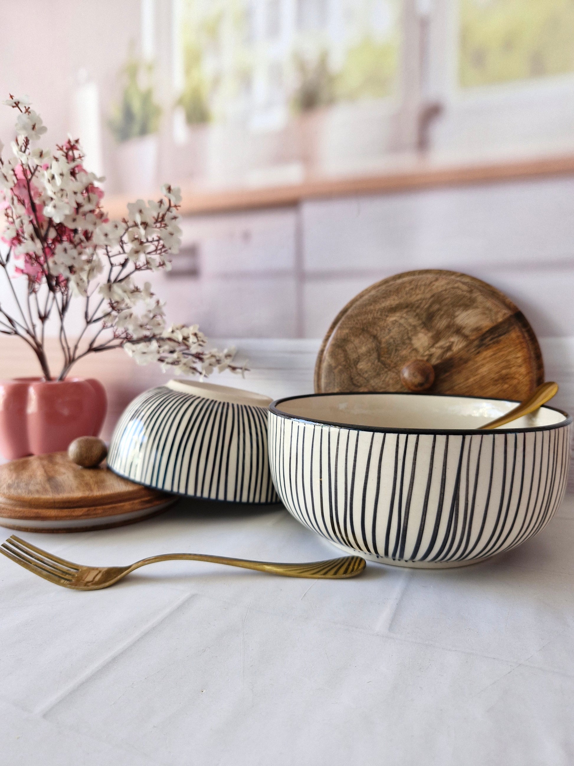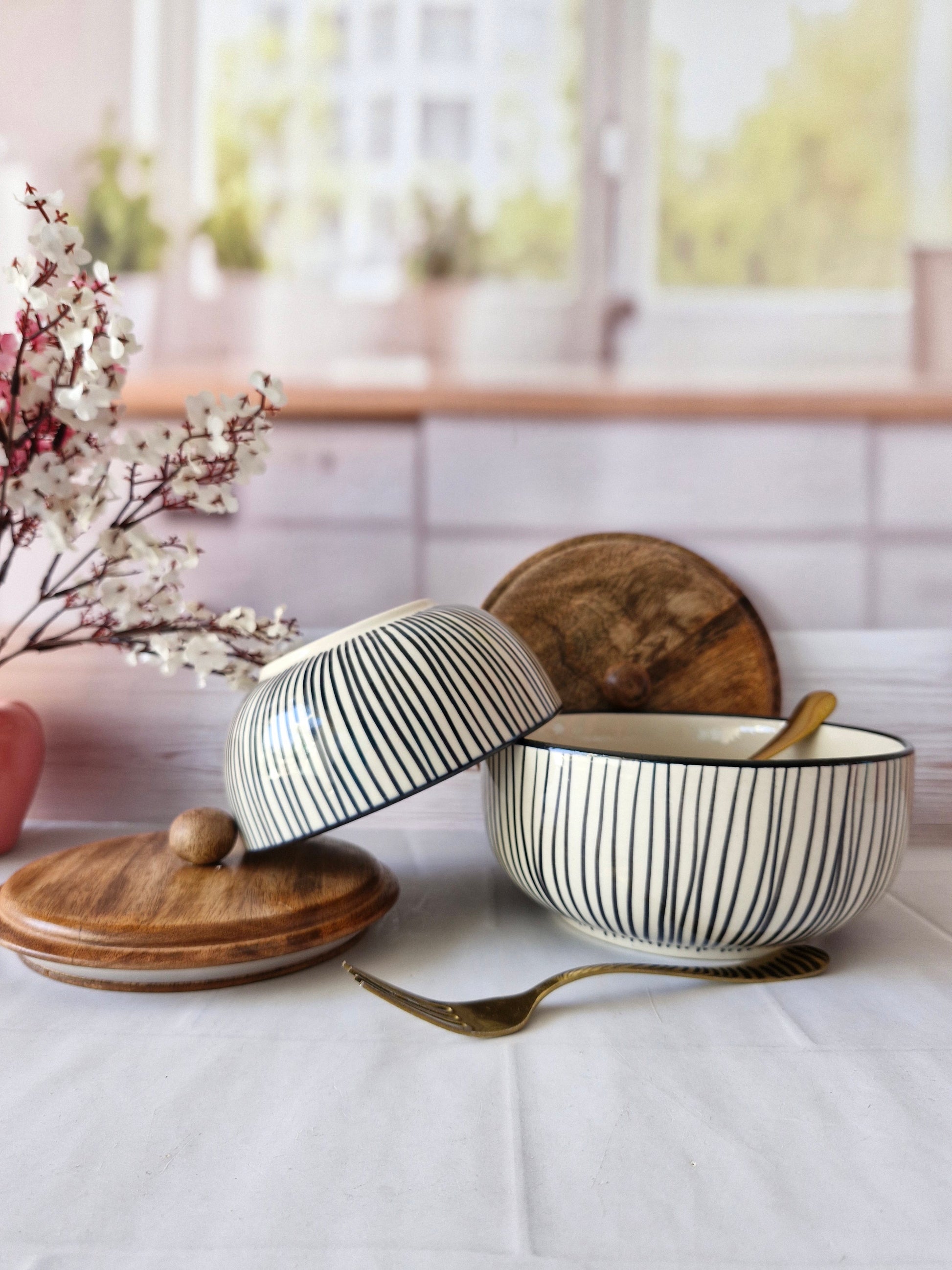 The Dynamic Handpainted Ceramic black line Round Serving Dining Bowls with Lid