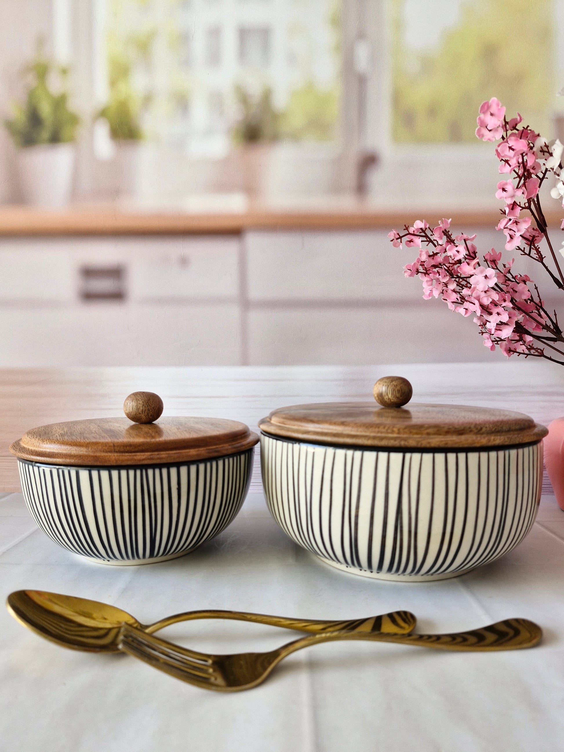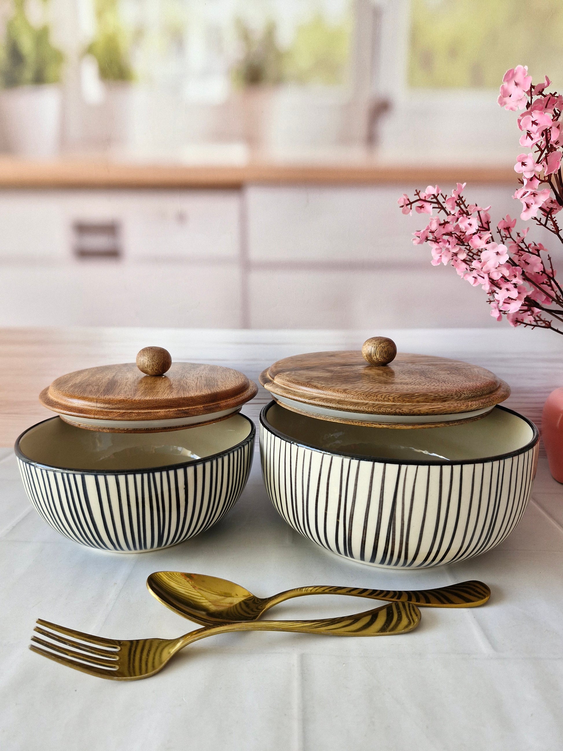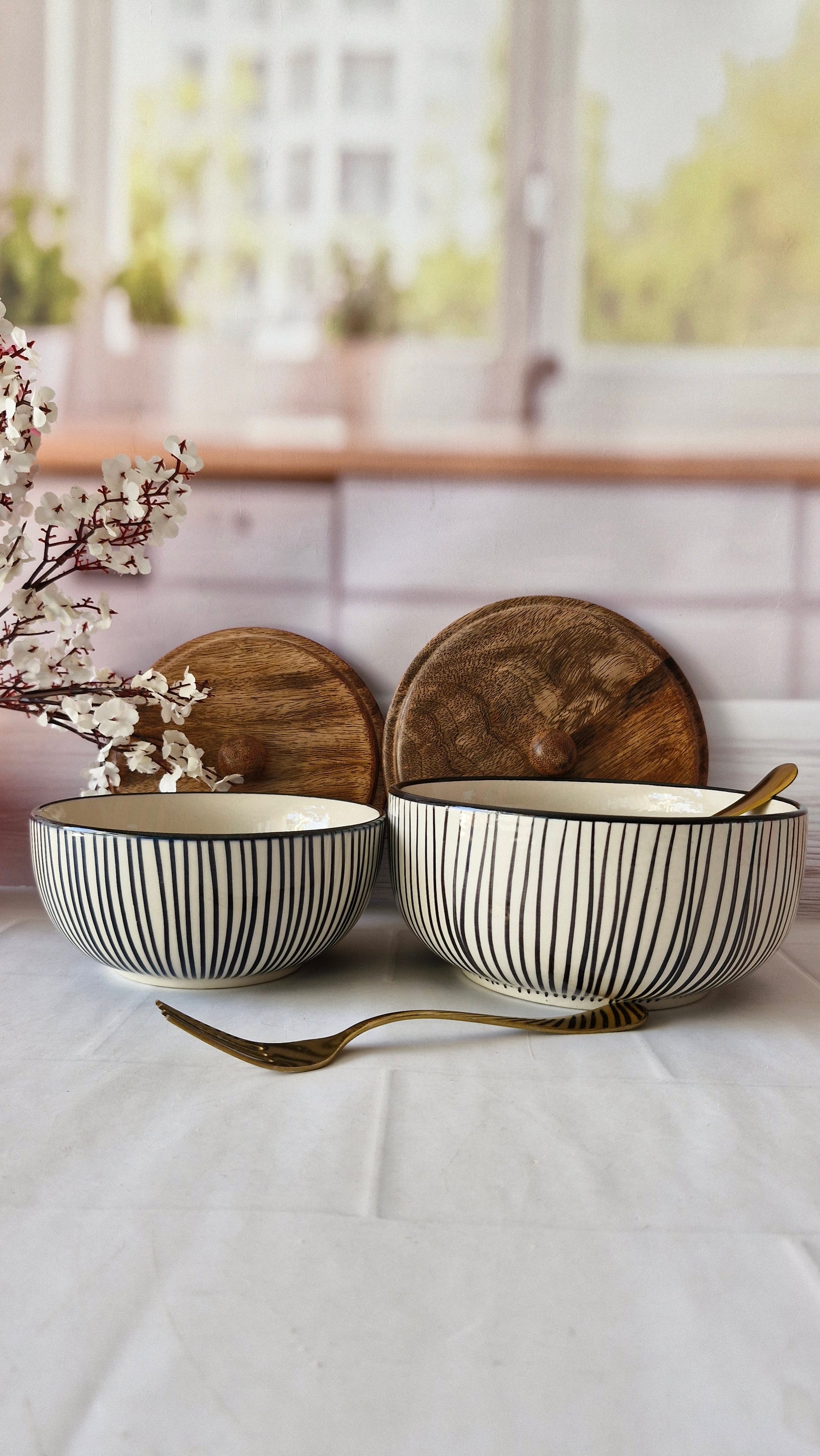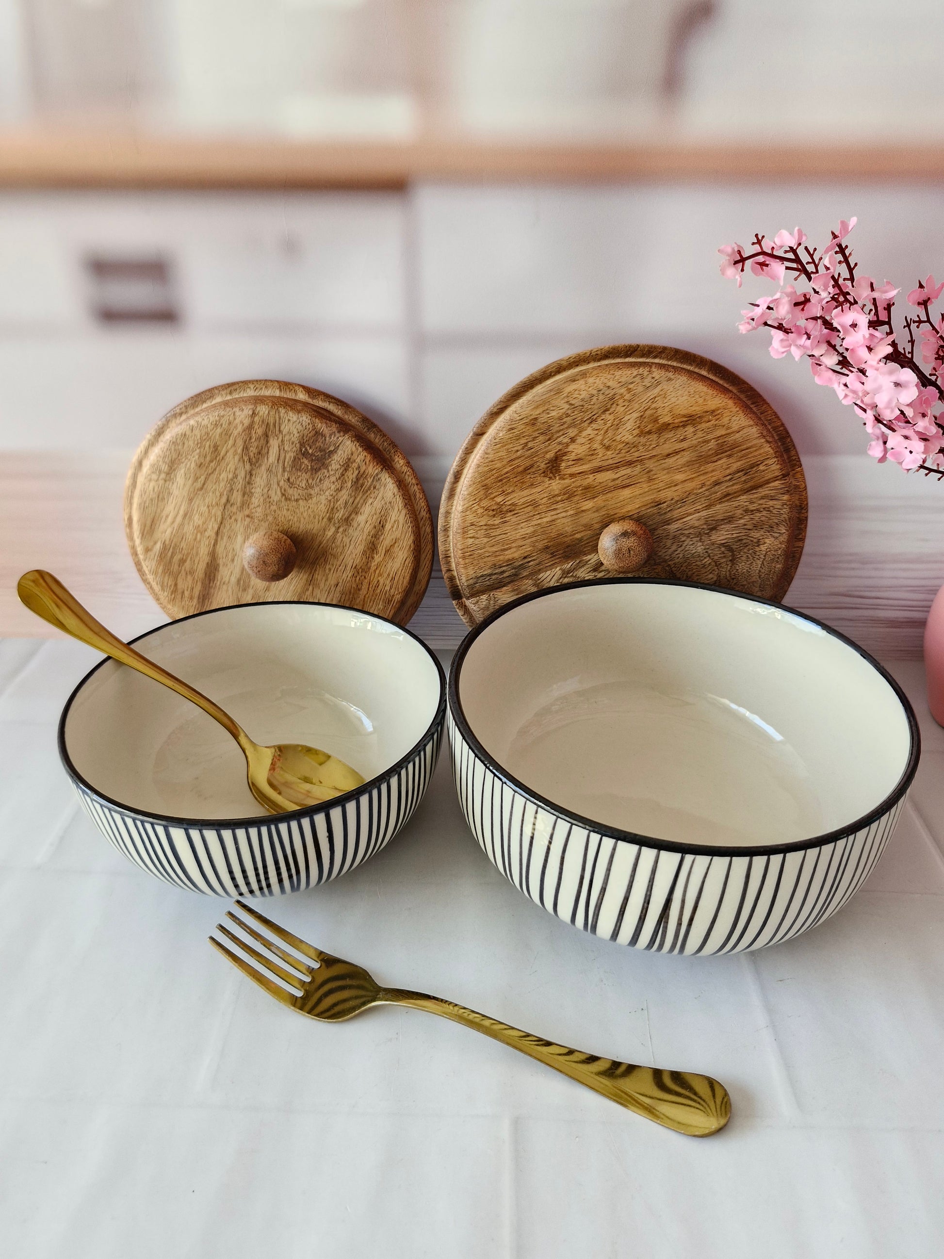 The Dynamic Handpainted Ceramic black line Round Serving Dining Bowls with Lid