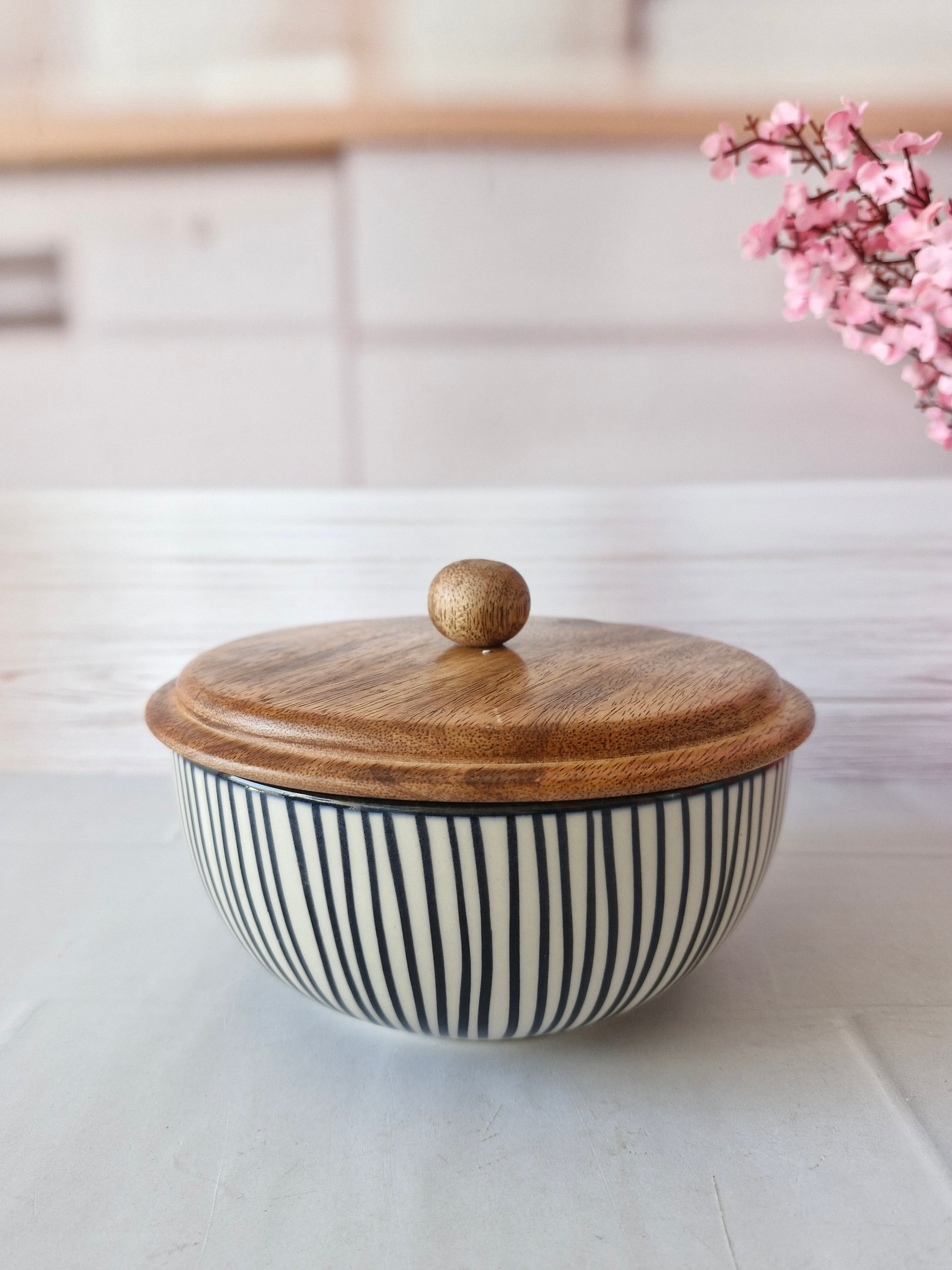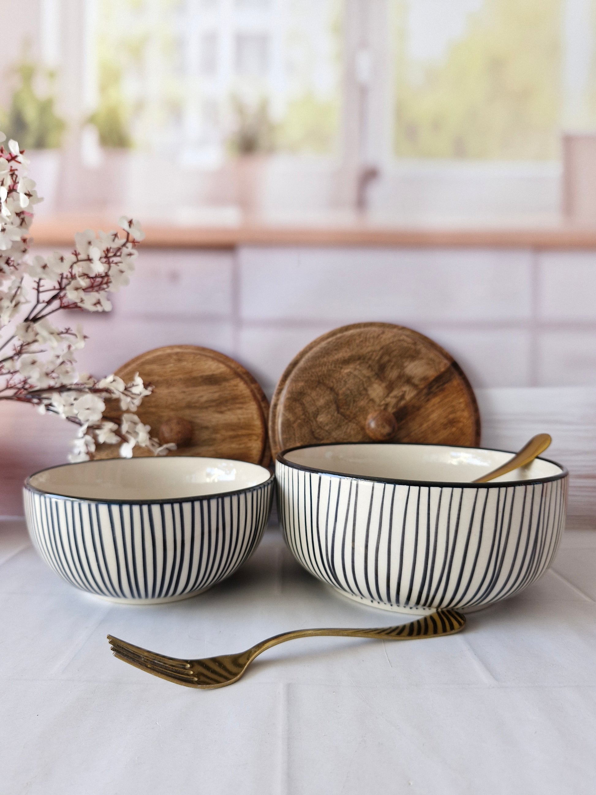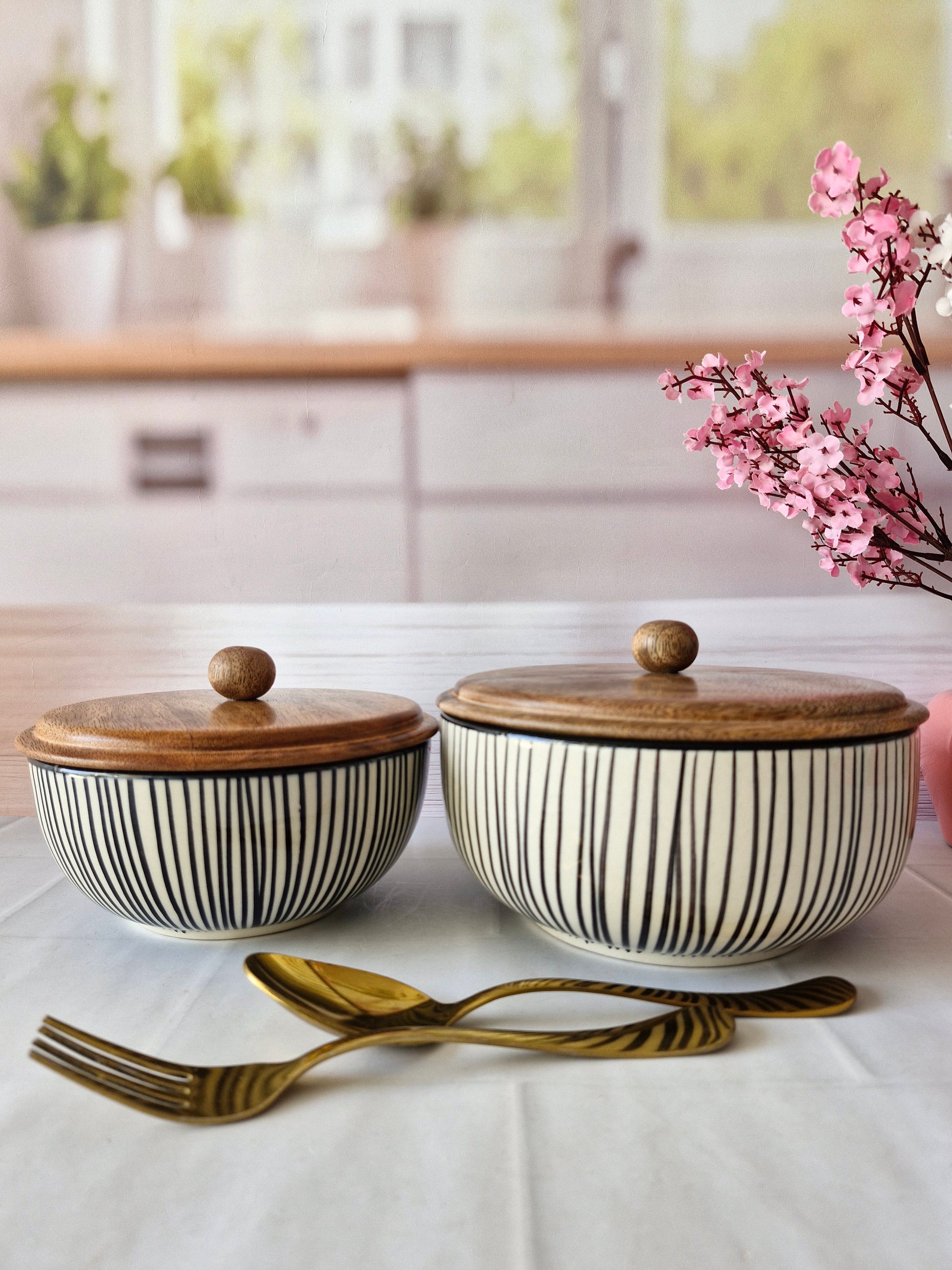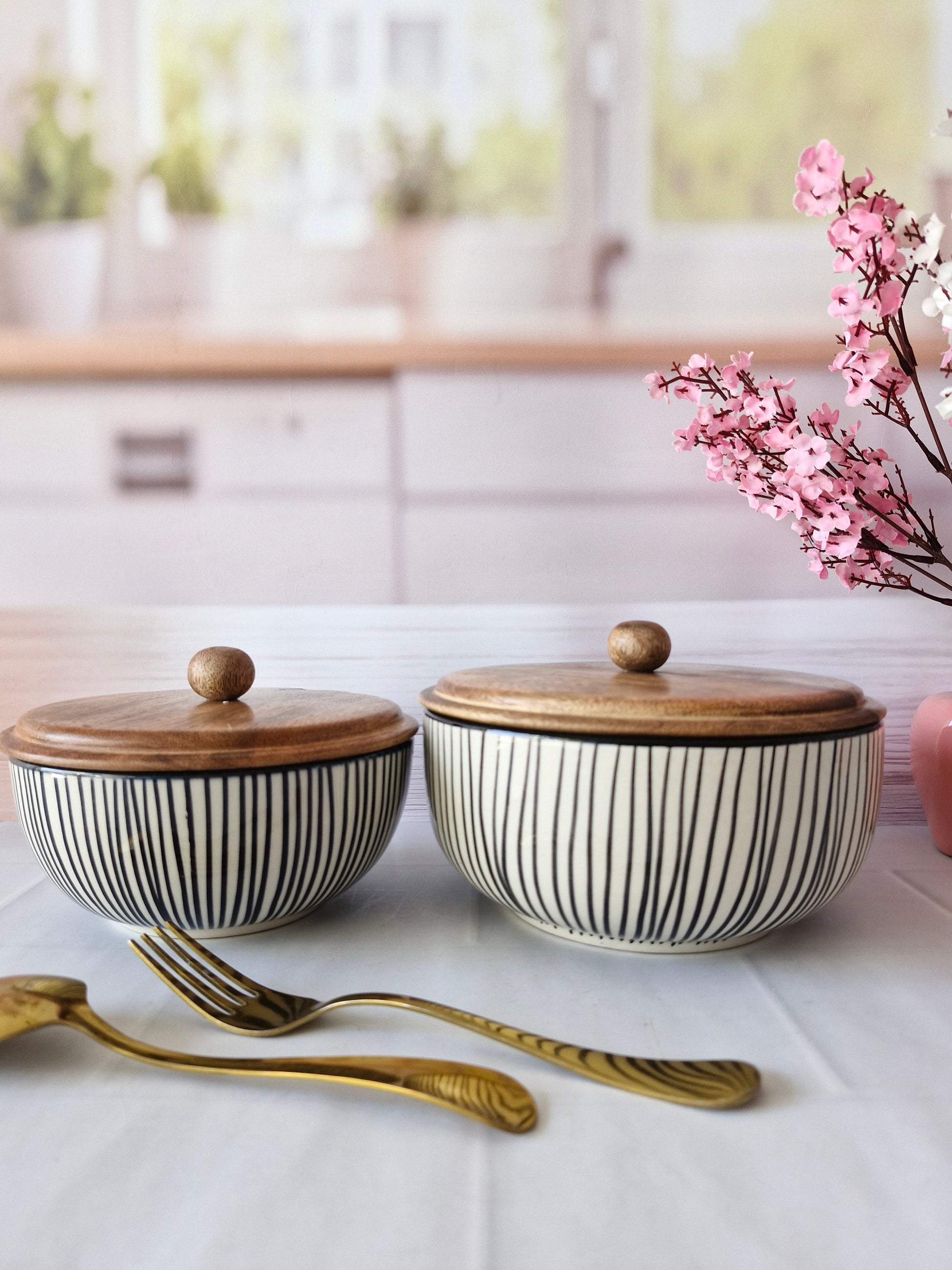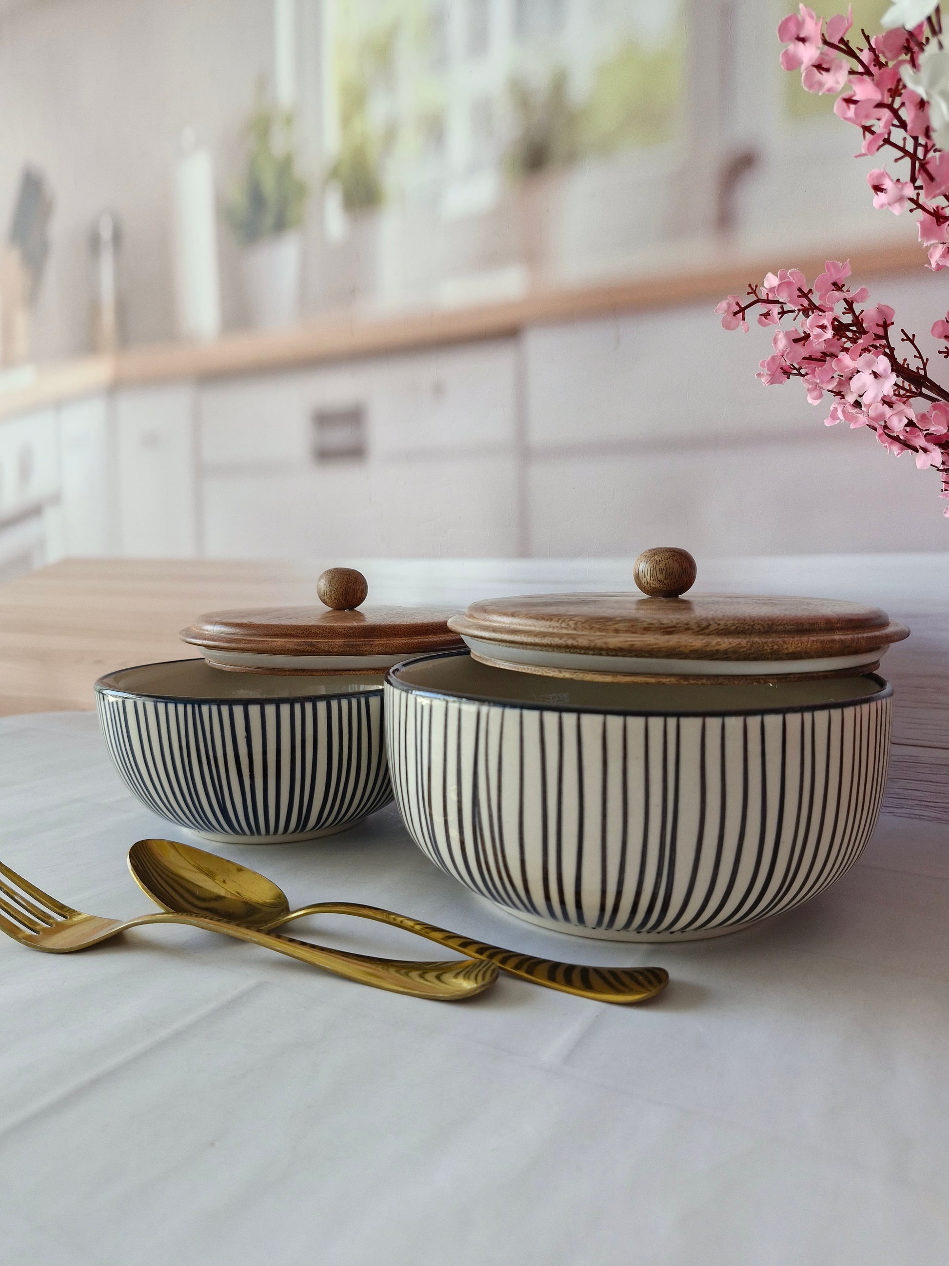 The Dynamic Handpainted Ceramic black line Round Serving Dining Bowls with Lid