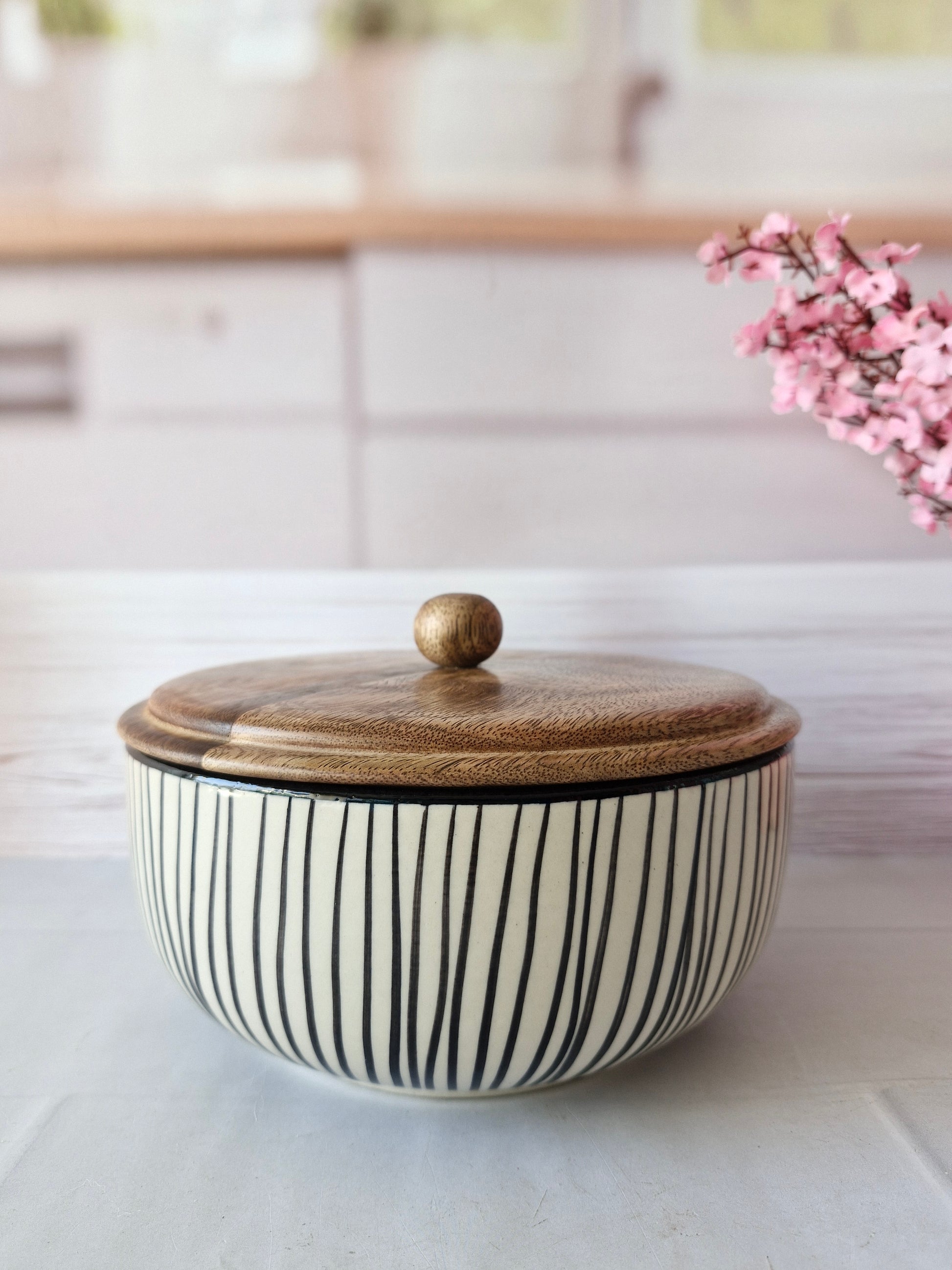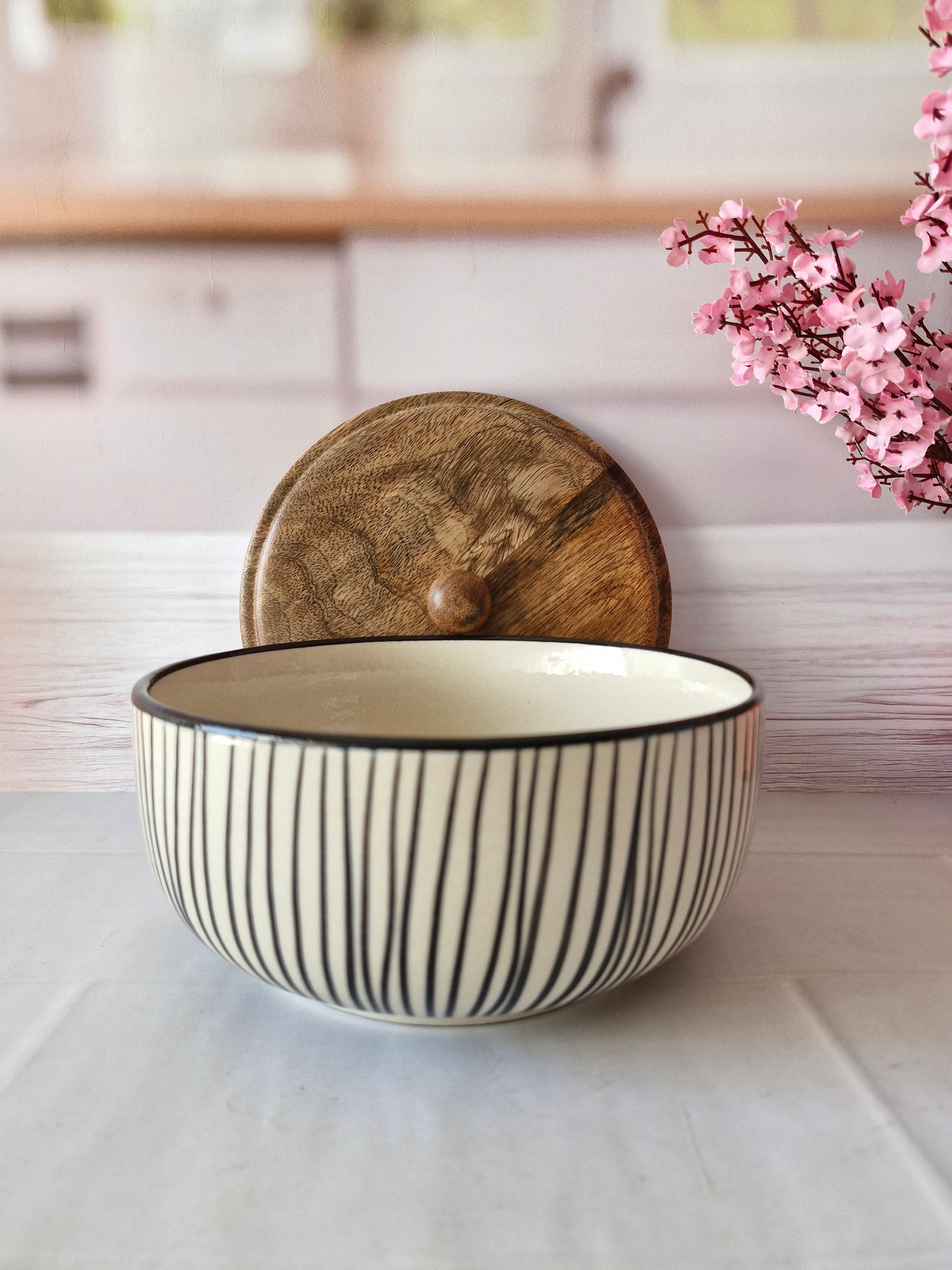 Experience the perfect blend of style and functionality with our Dynamic Handpainted Ceramic bowls. The sleek black lines add a modern touch while the lid ensures your food stays fresh. Ideal for serving and dining, these bowls are a must-have for any kitchen.