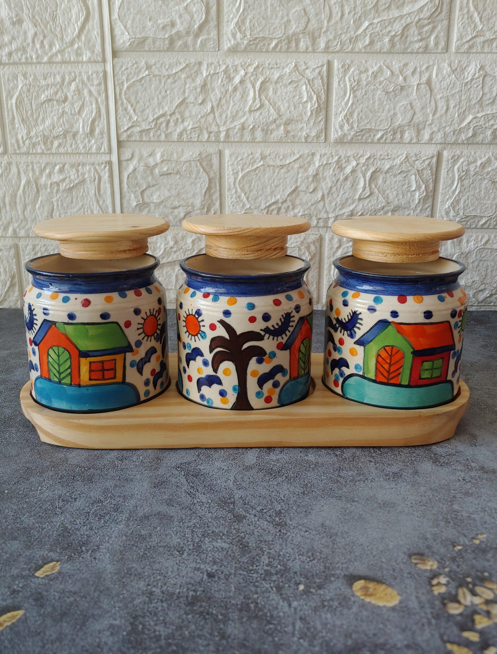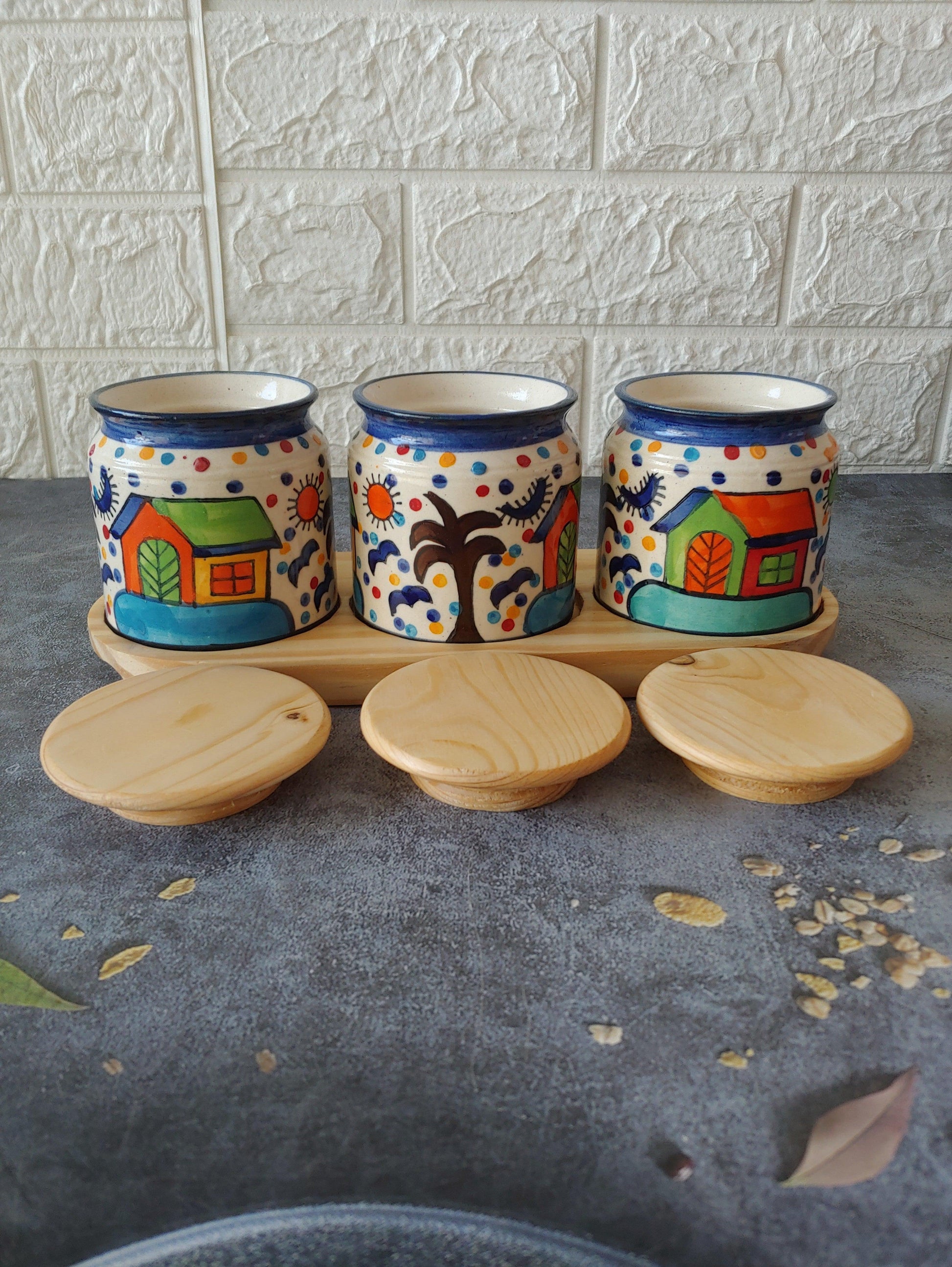 Hand Painted kimchi Pickle Jar Set with wooden lid and tray