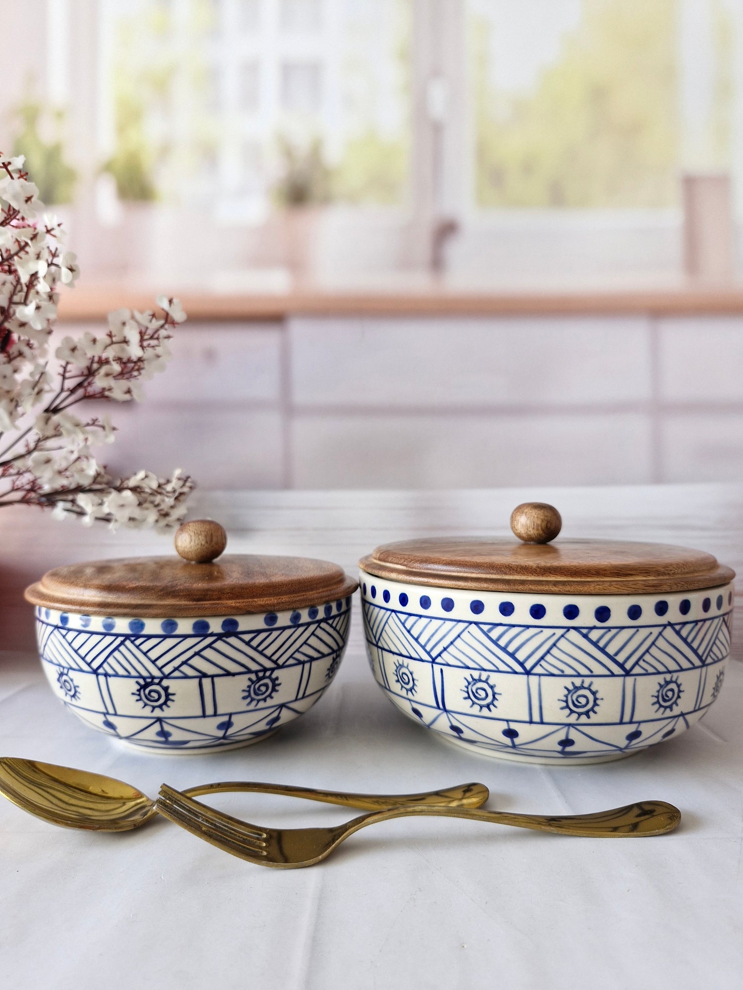 Blue Wonder Handpainted Ceramic Serving Round Dining Bowls with Lid