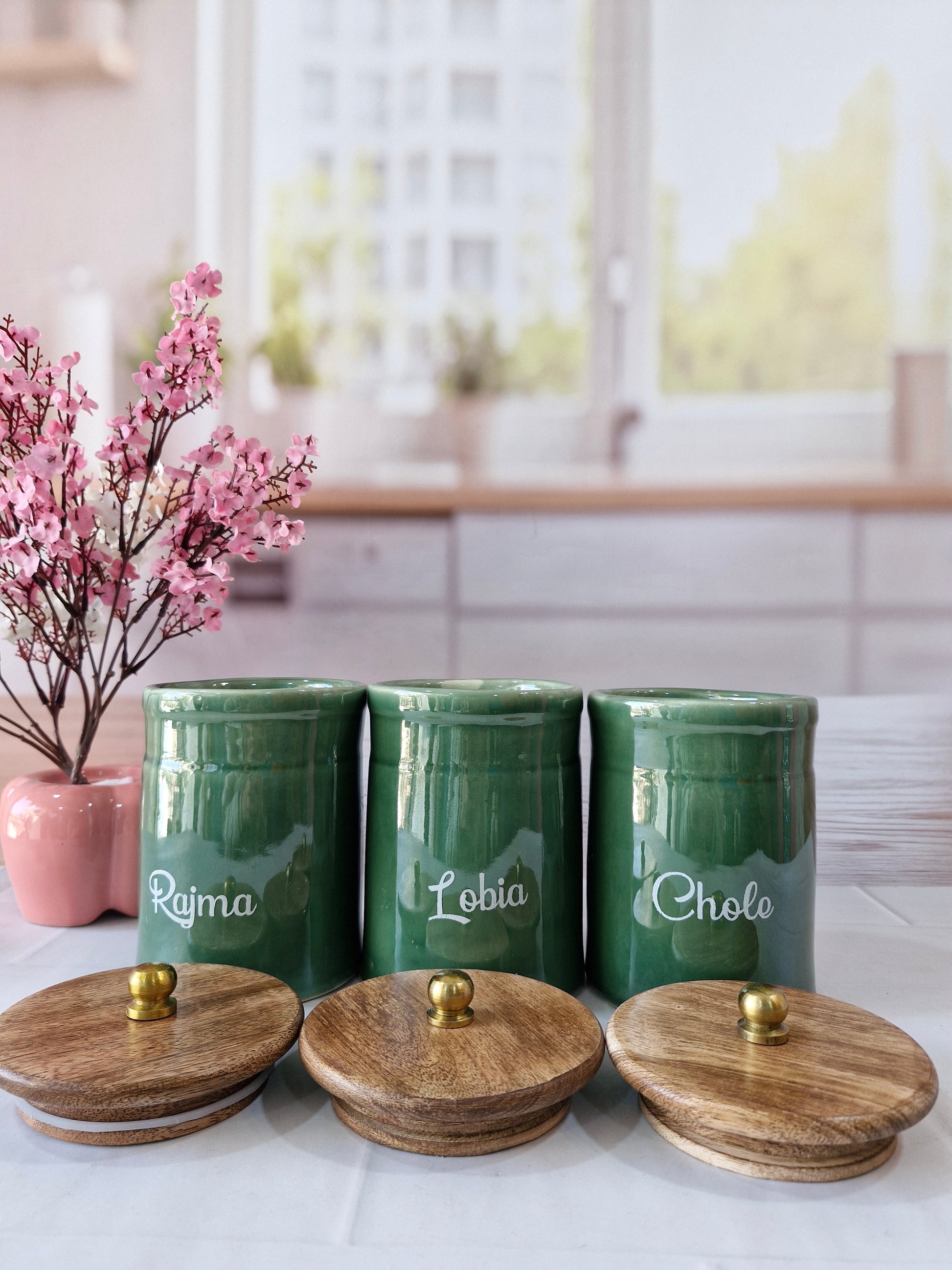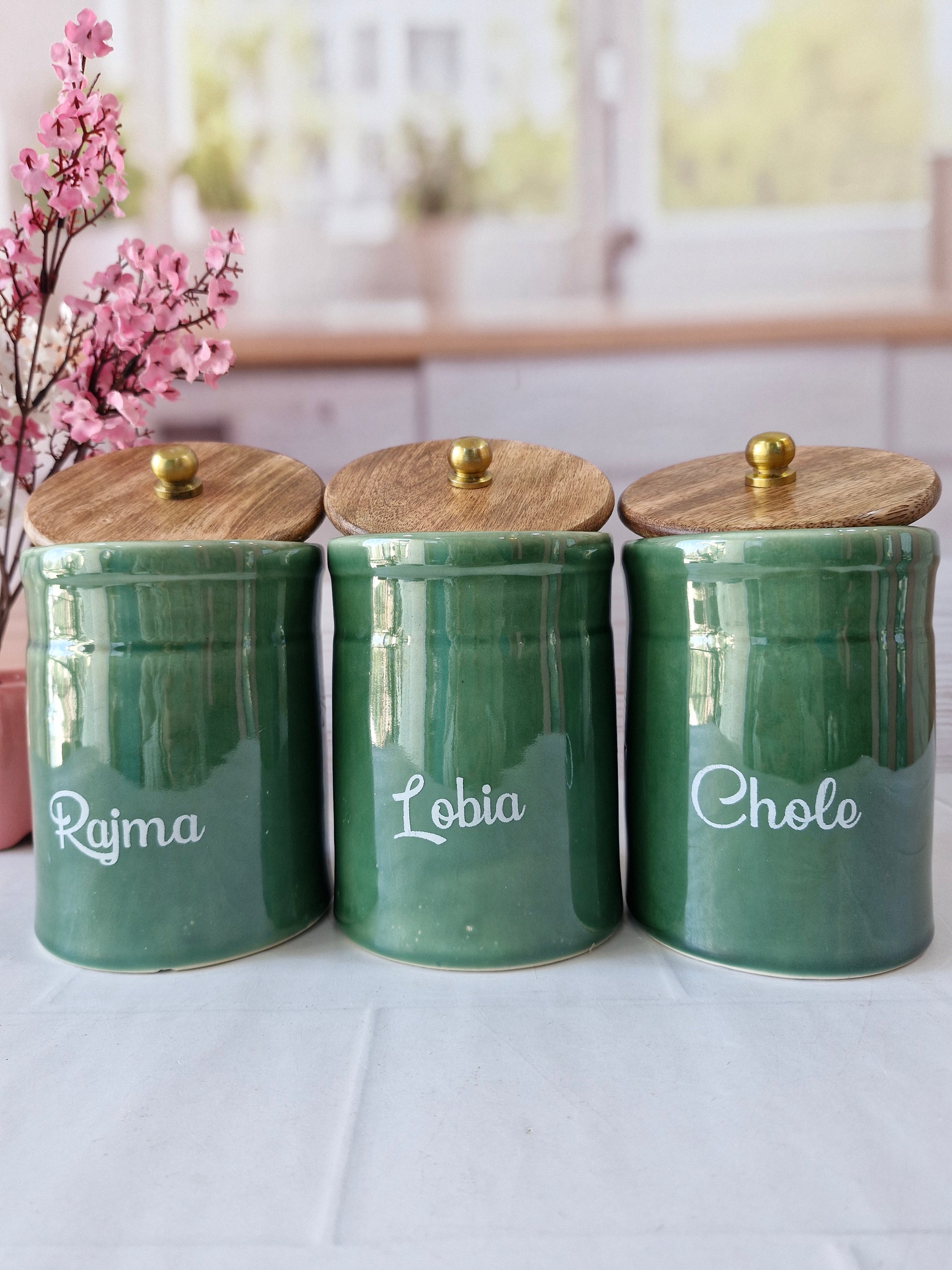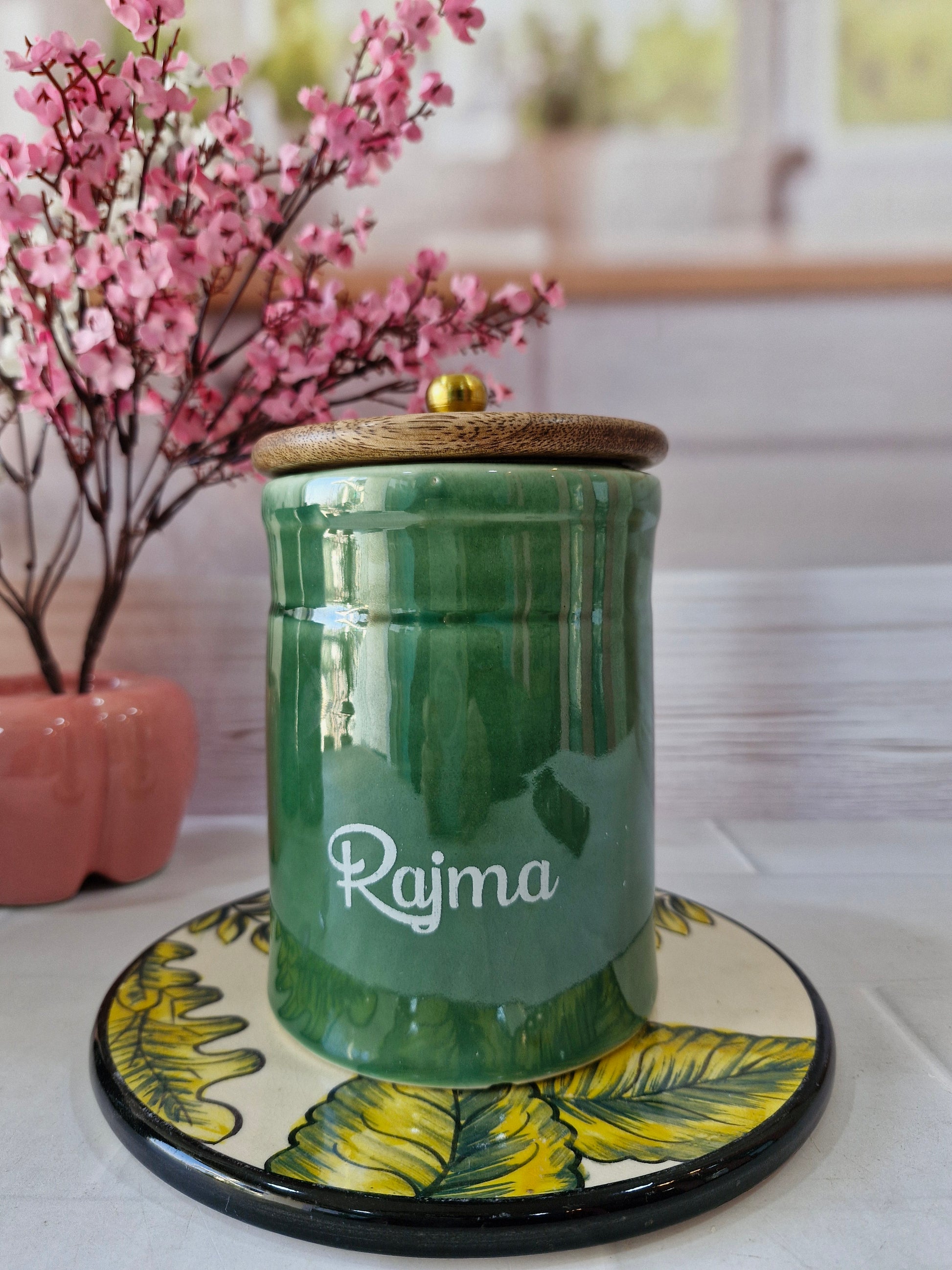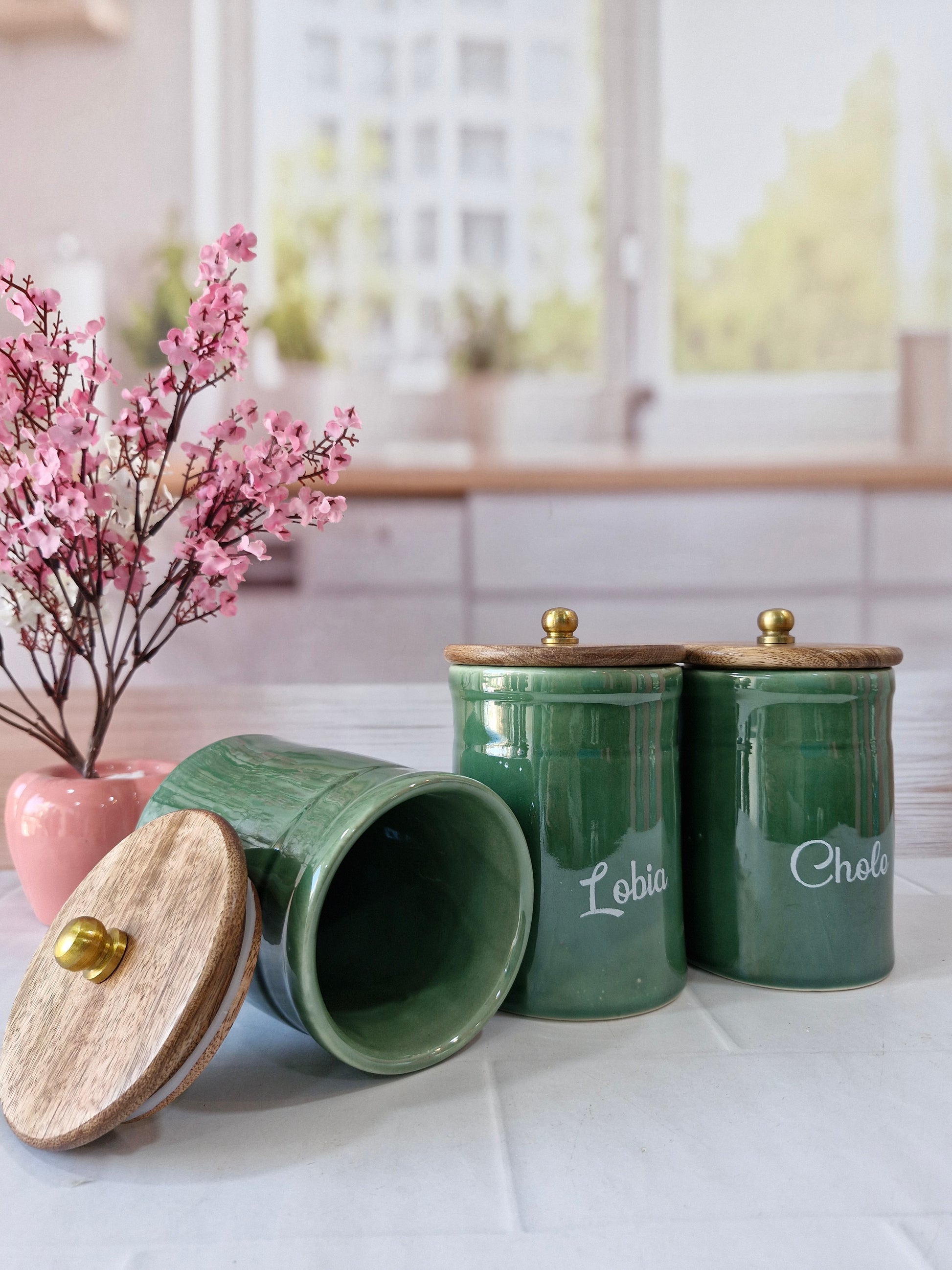 Happy Home Green Royal kitchen Spice Delight Airtight Ceramic Container (1kg) with wooden Lid