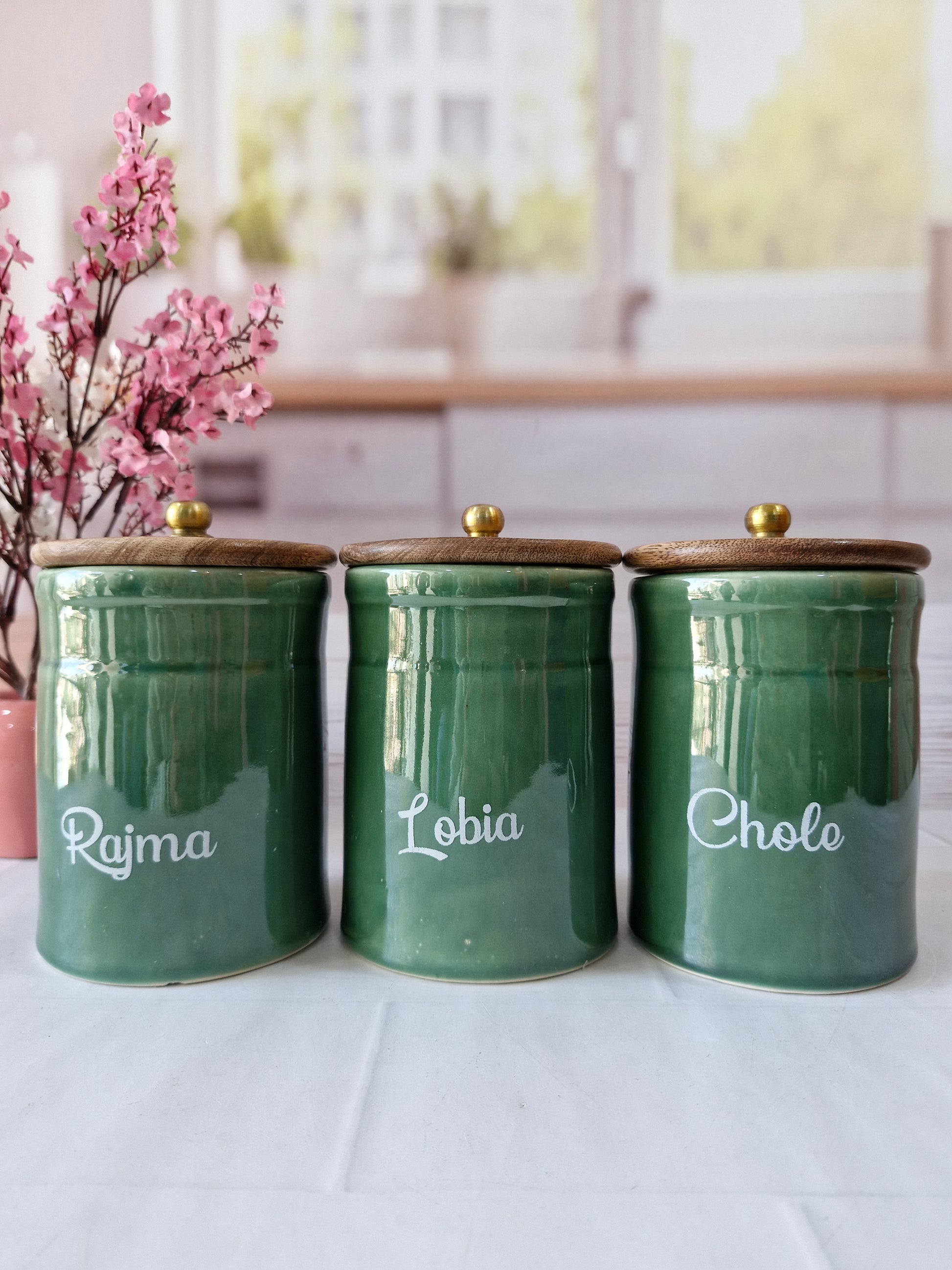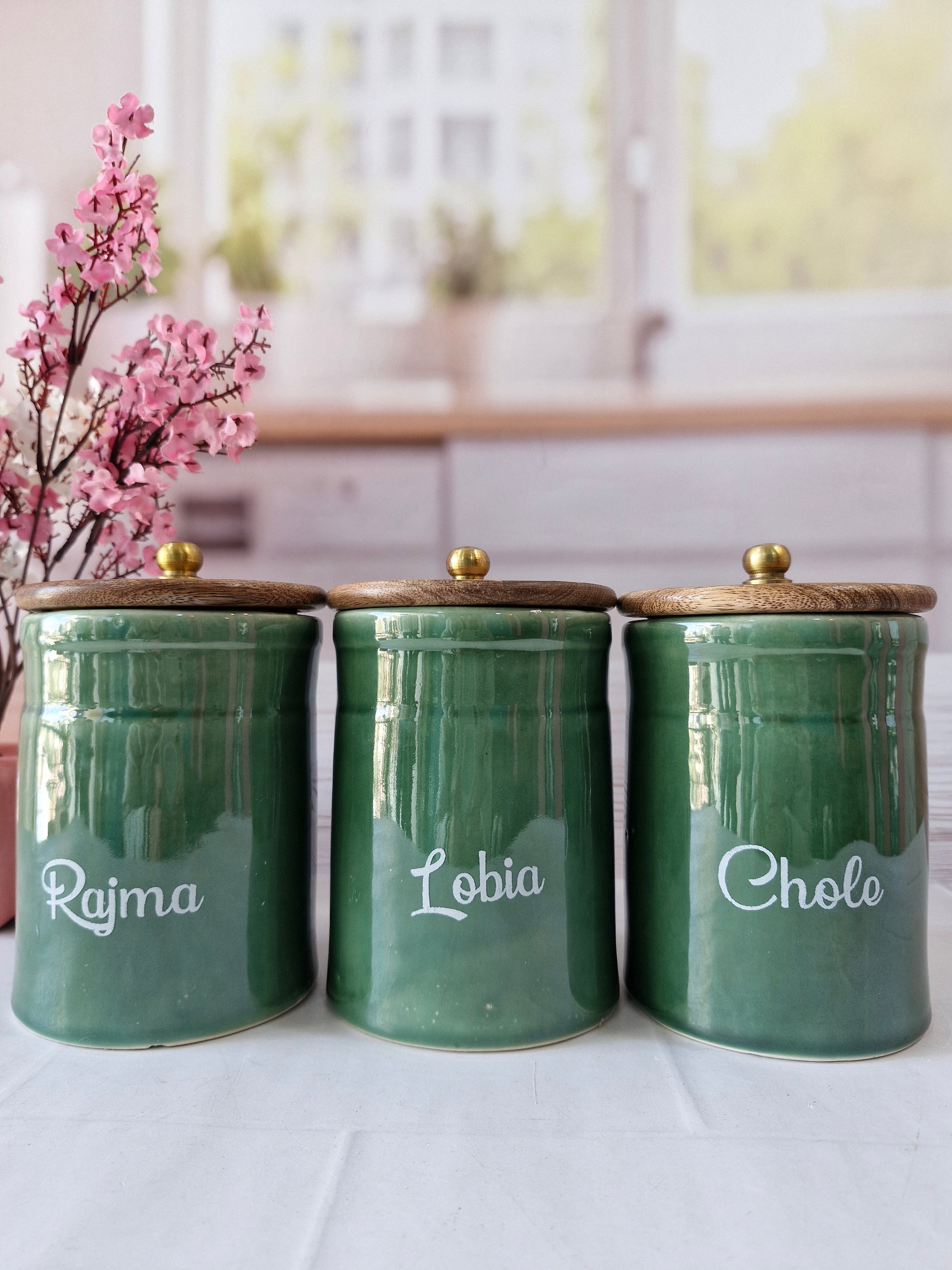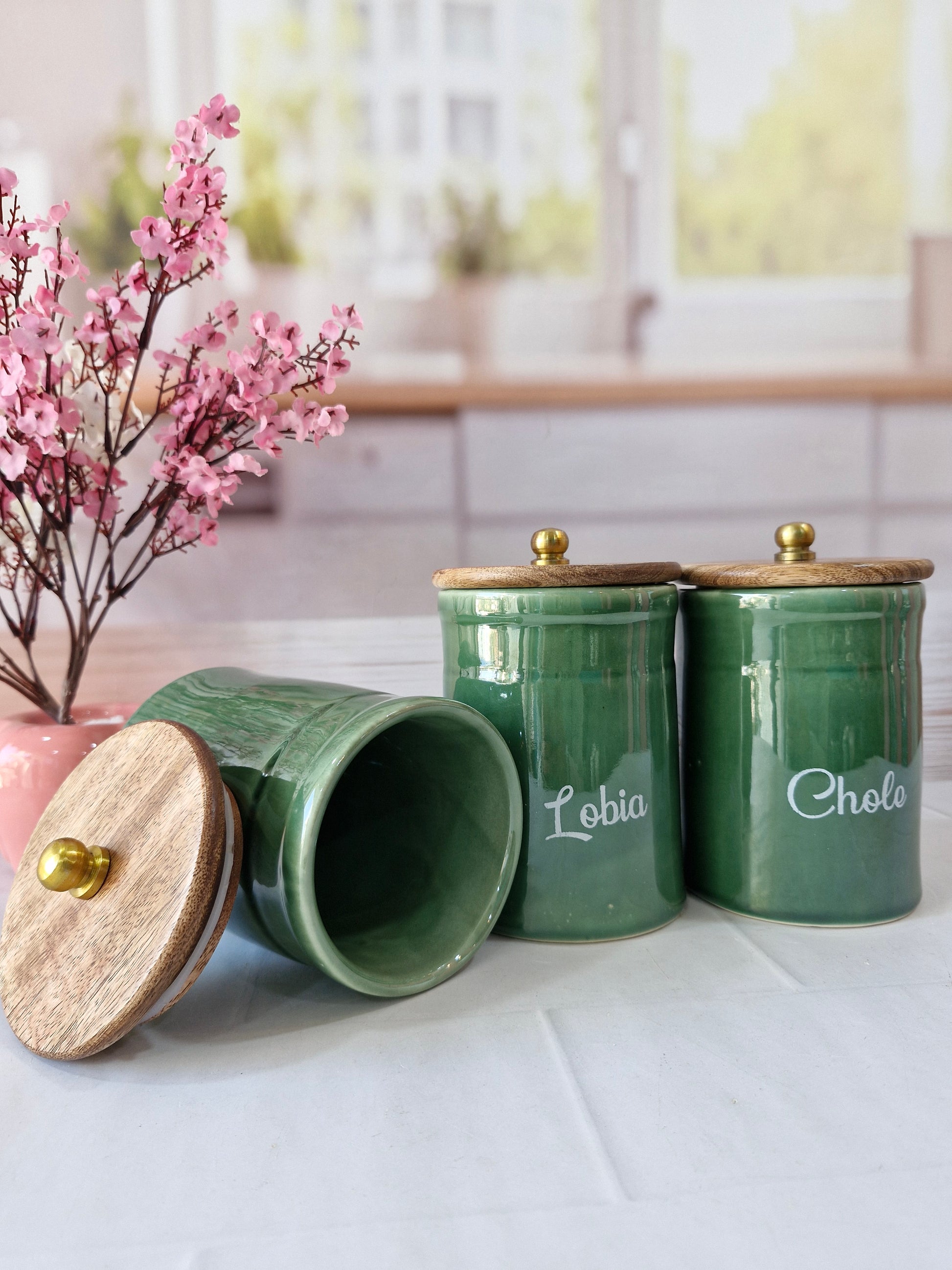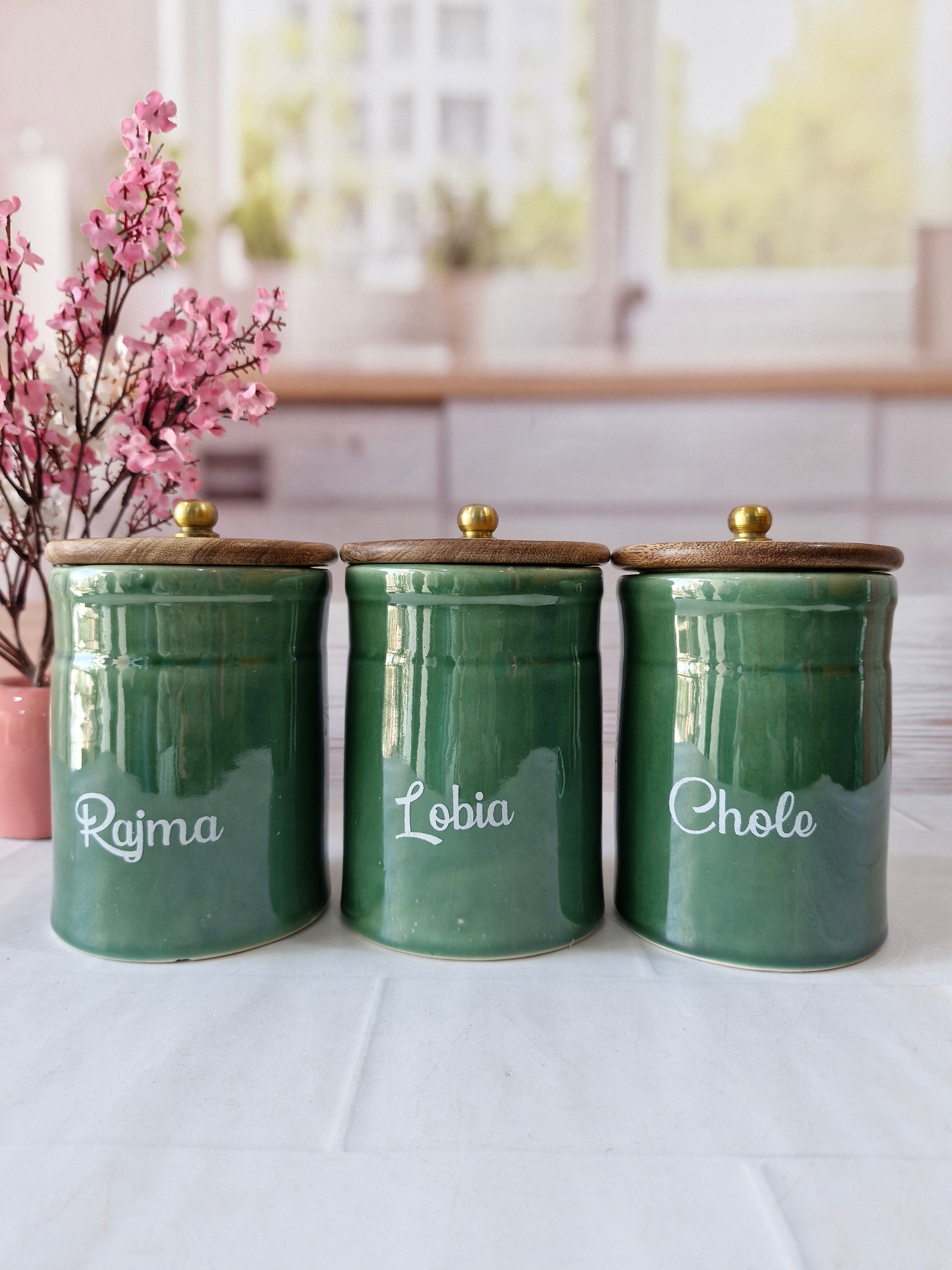 Happy Home Green Royal kitchen Spice Delight Airtight Ceramic Container (1kg) with wooden Lid