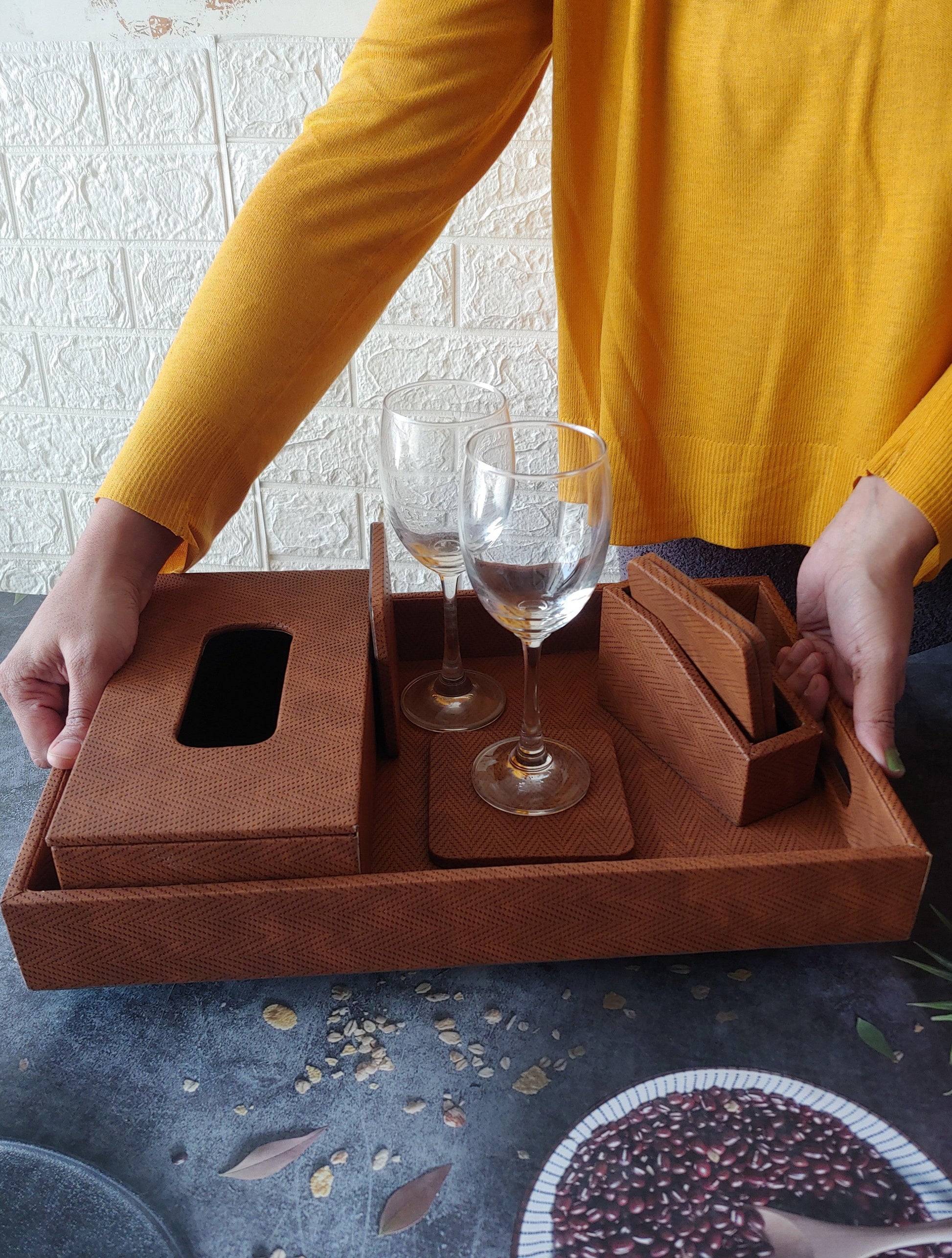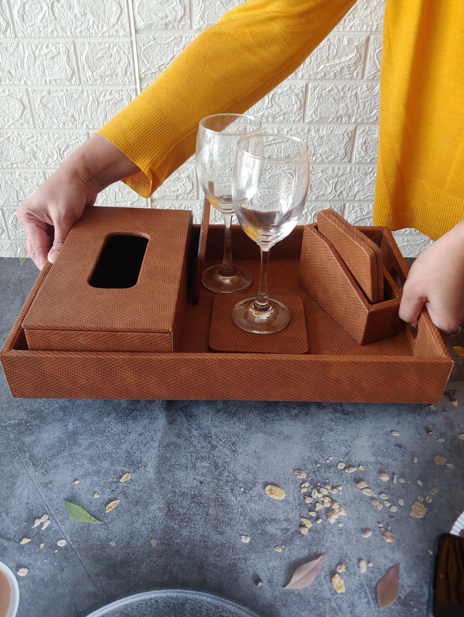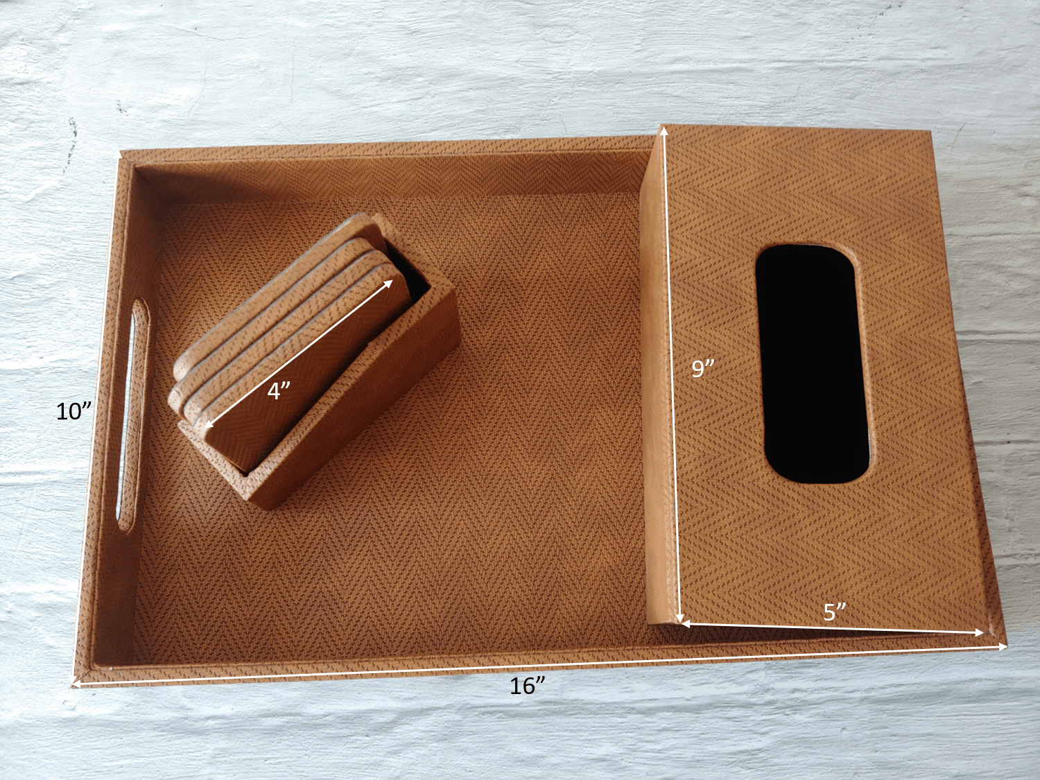 Fawn Zigzag Premium Leather Serving Tray along with tissue holder and coasters