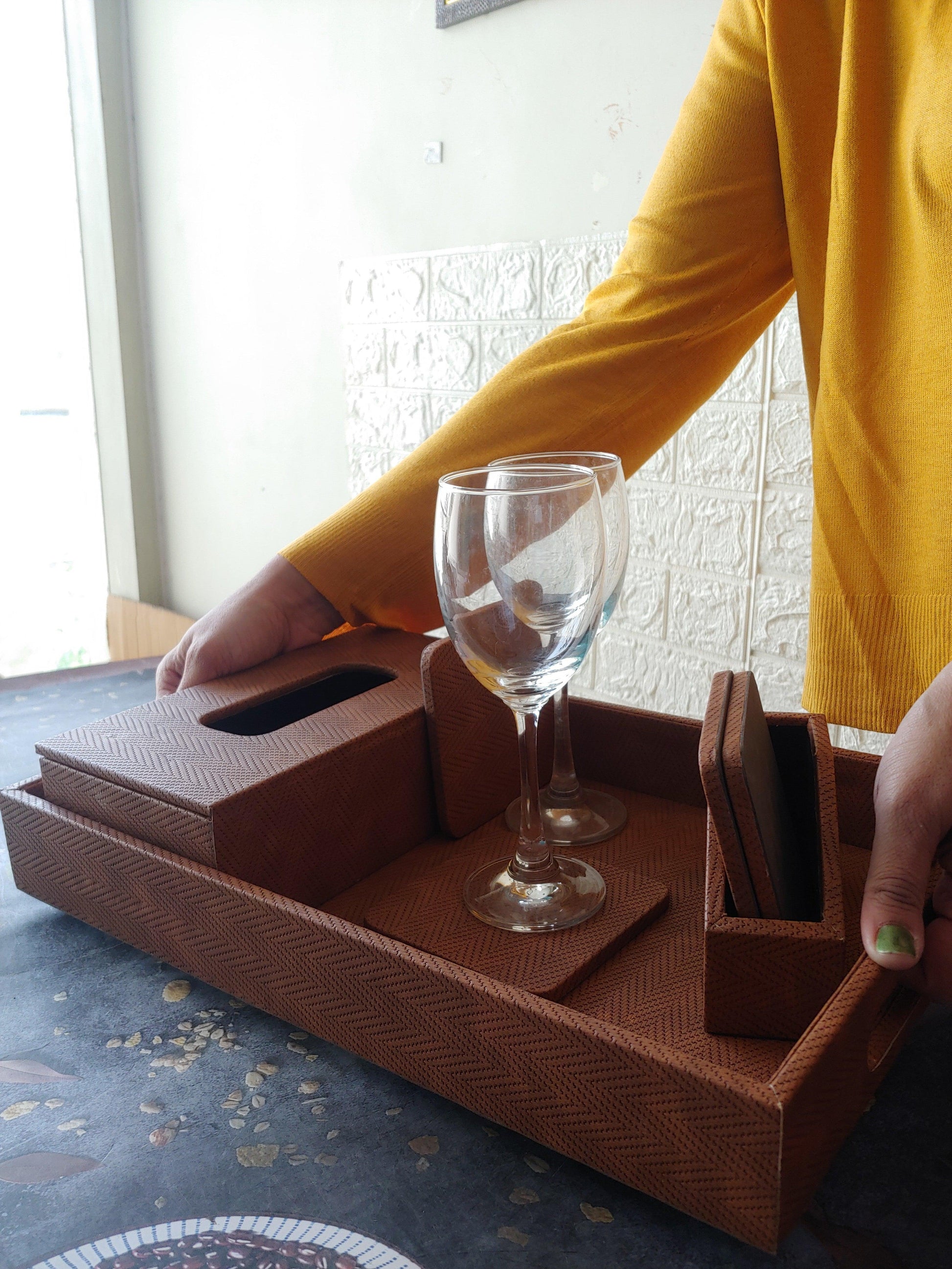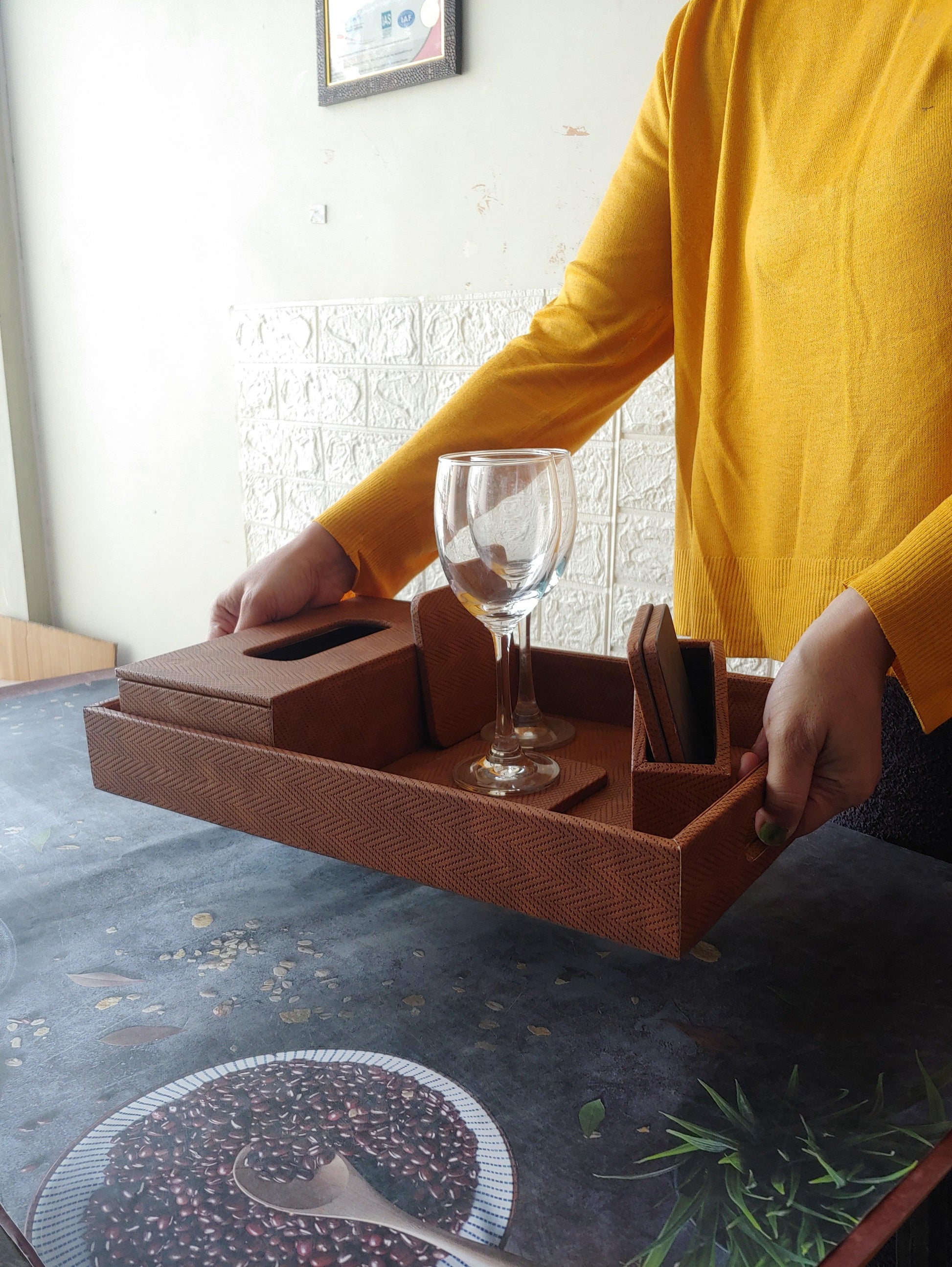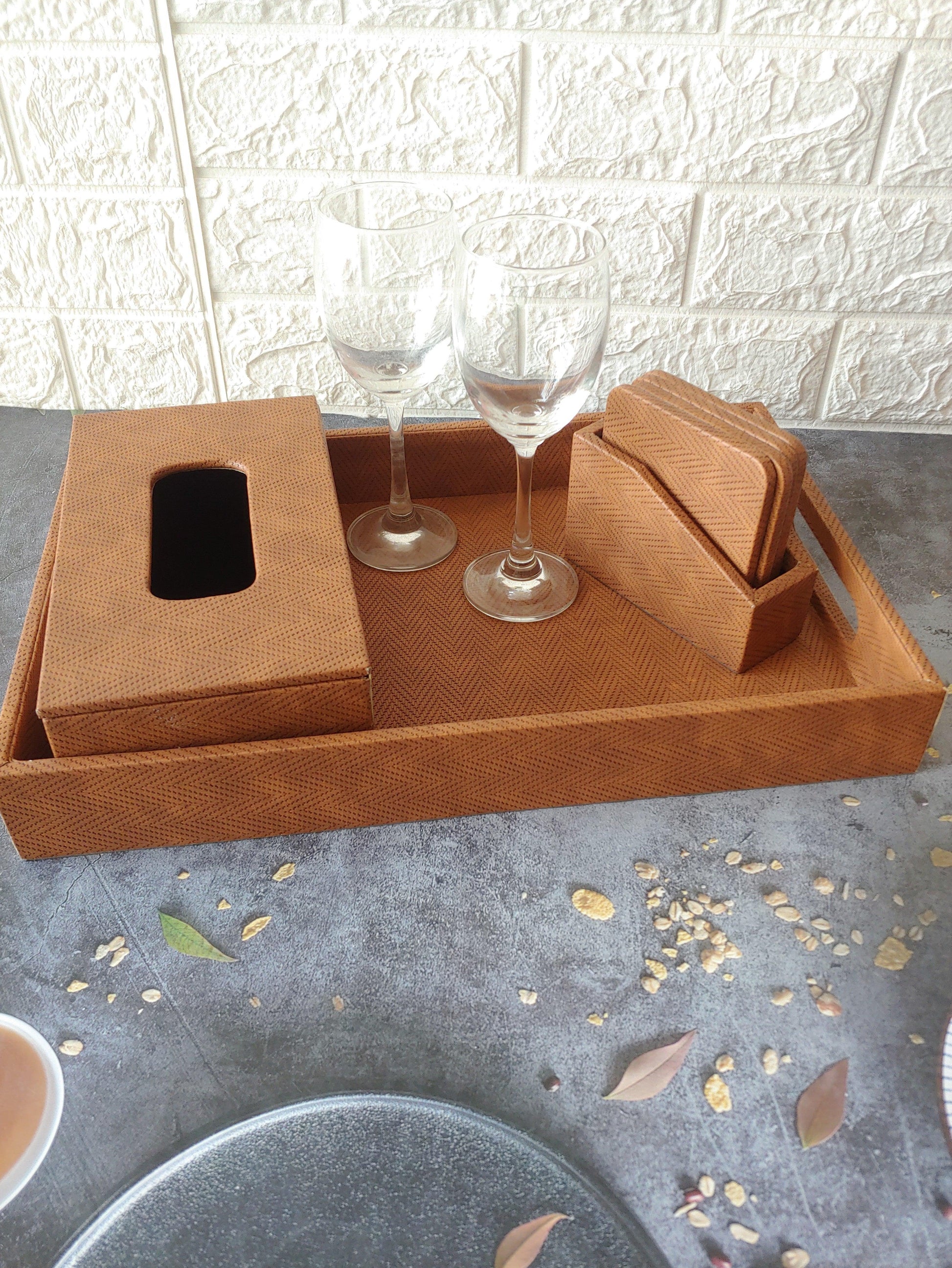 Fawn Zigzag Premium Leather Serving Tray along with tissue holder and coasters