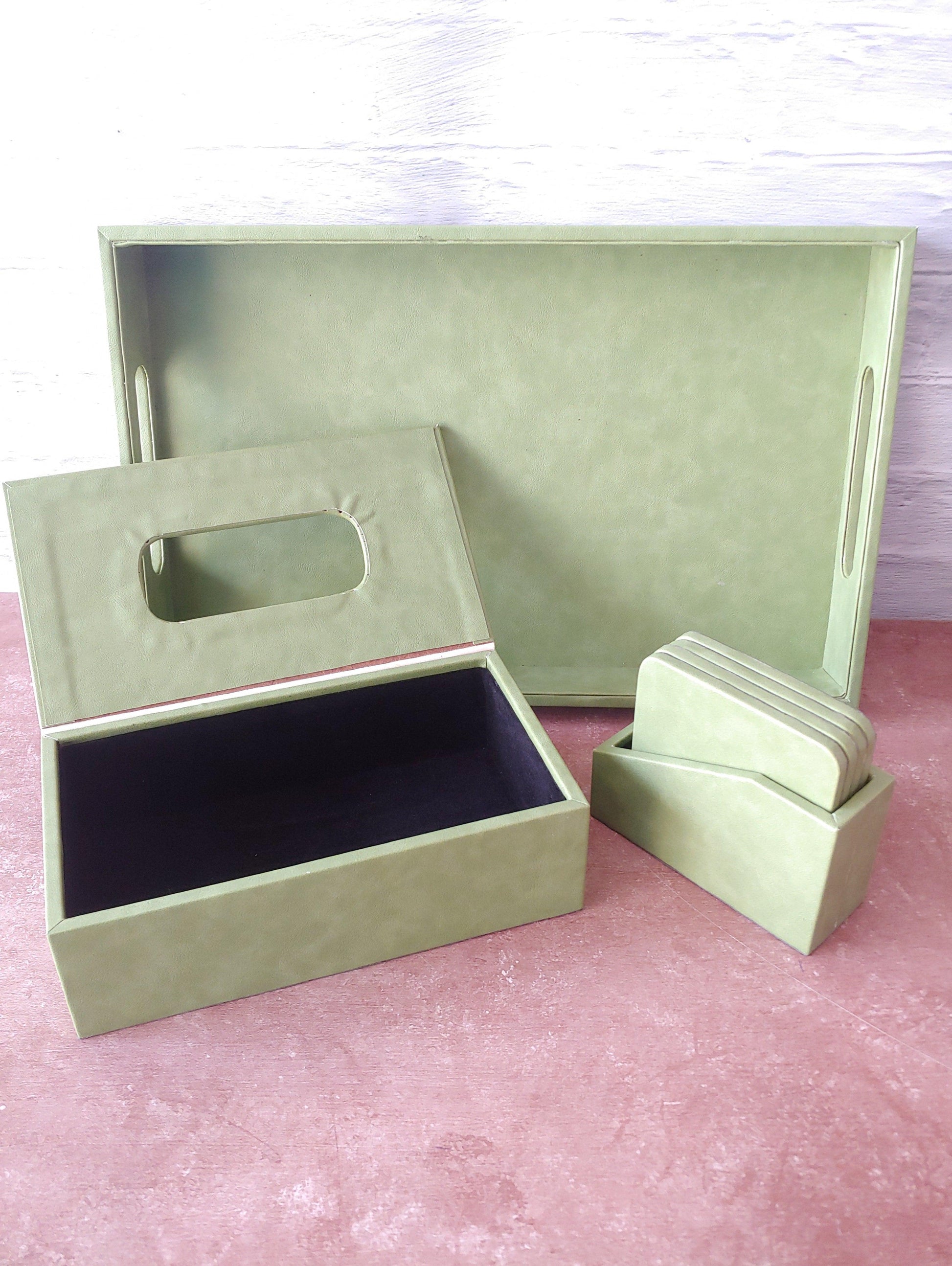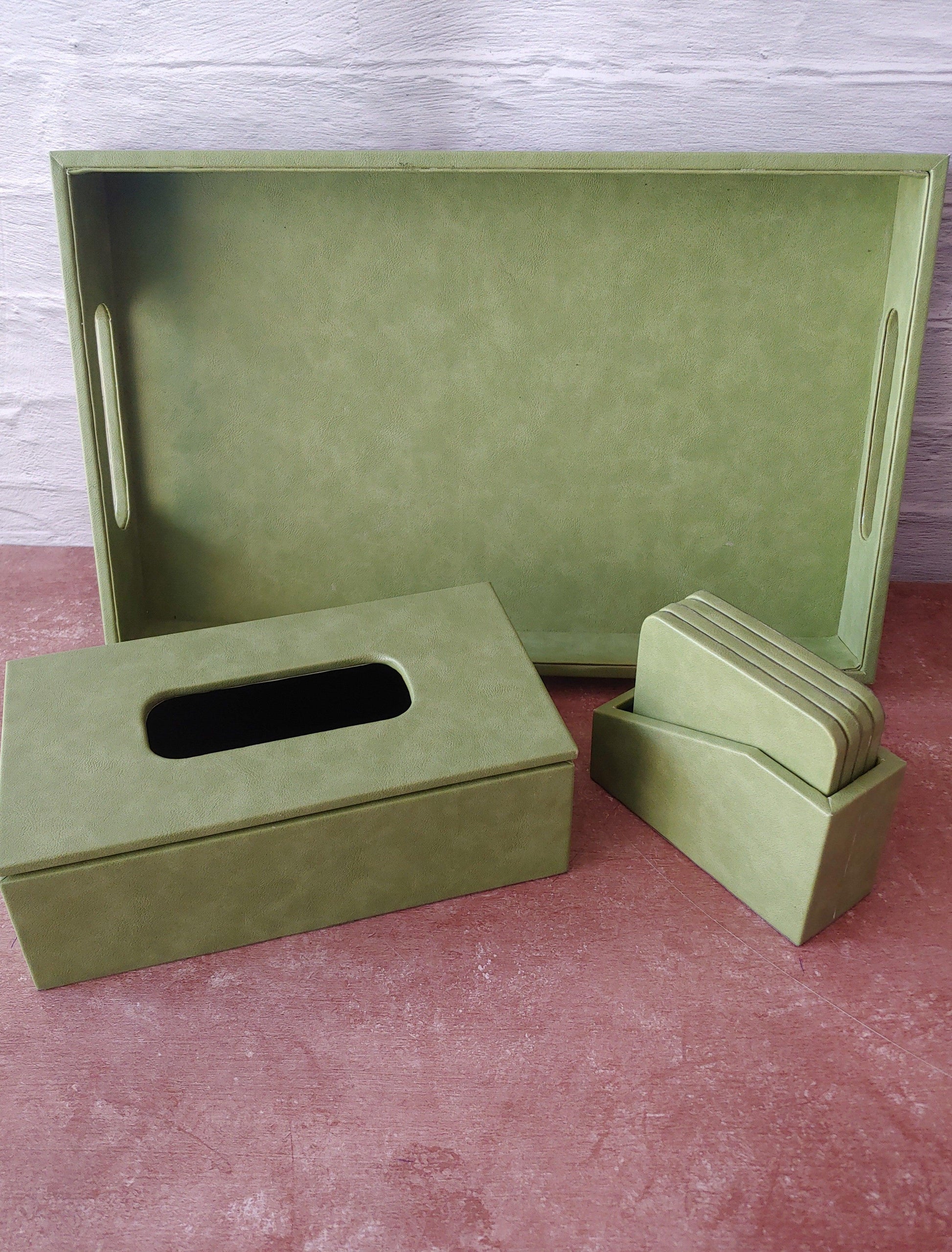 Pistachio Green Premium Leather Serving Tray along with tissue holder and coasters
