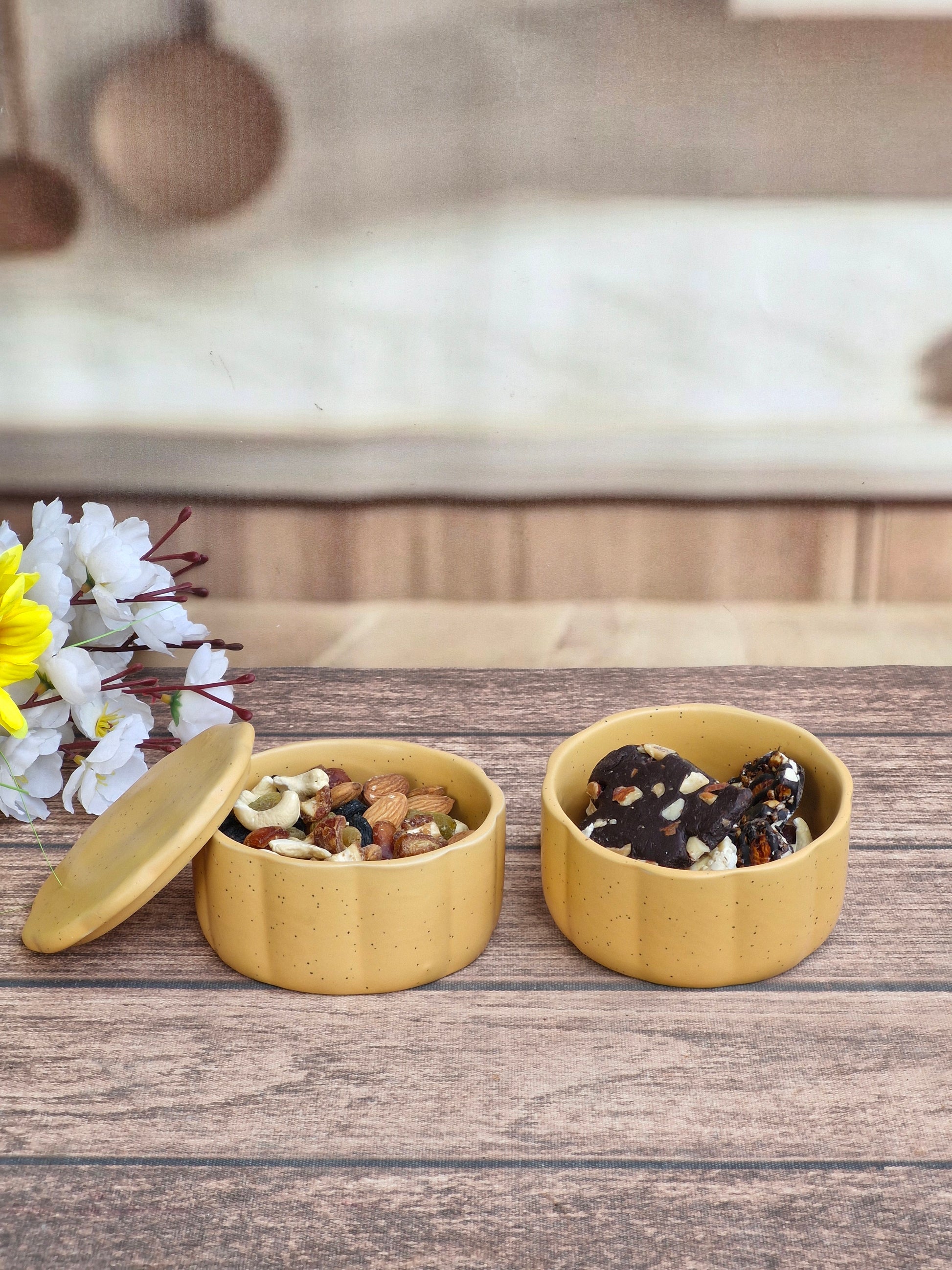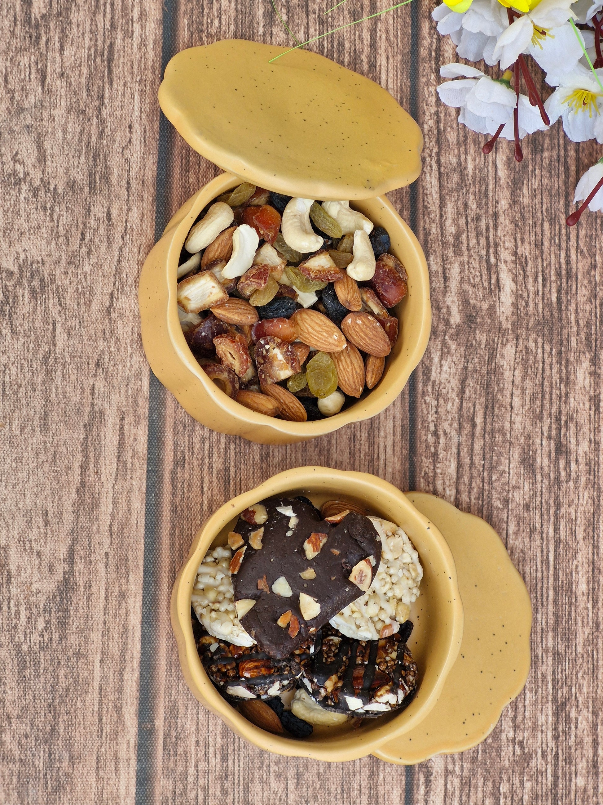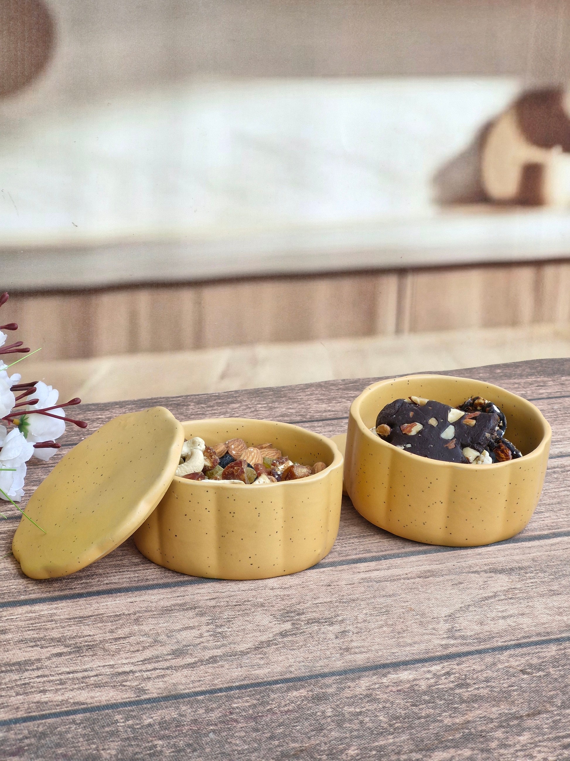 Perfect for storing nuts, dried fruits, or your favorite treats, the ceramic jars add a calm, natural aesthetic to your kitchen, workspace, or coffee table. The energy bites are made for on-the-go moments—rich in texture, naturally satisfying, and ideal when you need a quick pick-me-up.
